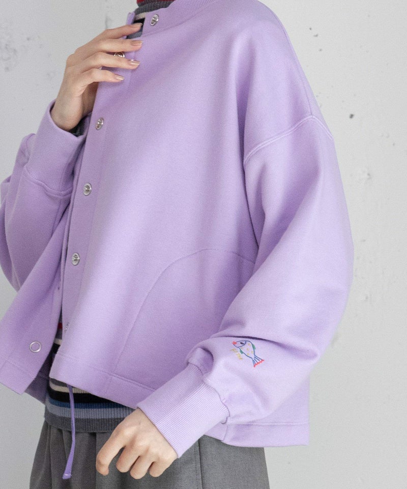 程よい丈感の裏毛カーディガン。ノーカラーのデザインでスッキリと着られます。左袖にはユニークな刺繍がワンポイント。オフィスシーンにも、デイリーユースにも活躍してくれる、頼れる一枚です。裾に紐を通しているので、サイズ感の調整が可能です。両サイドにポケット付き。