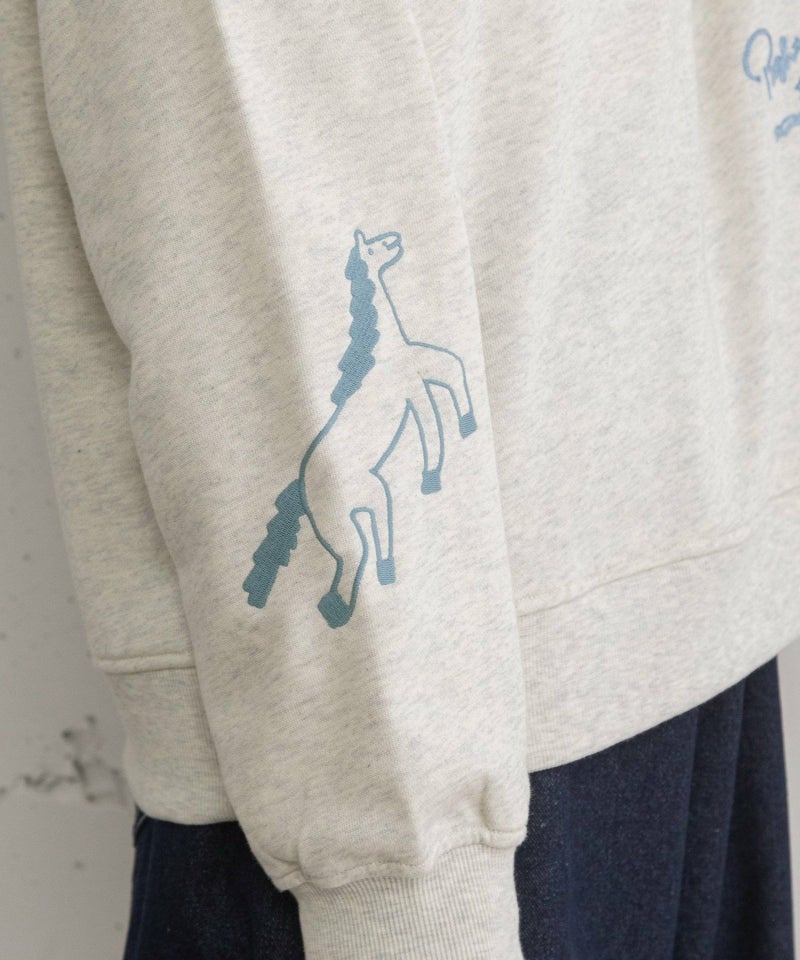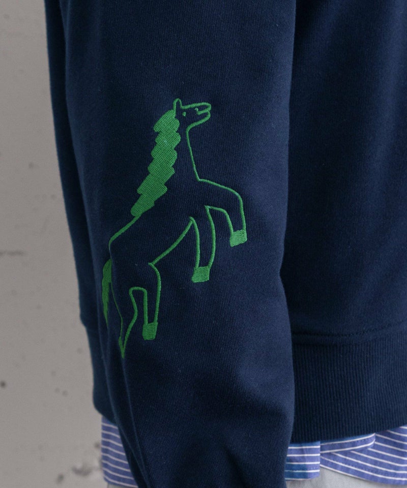 デイリーユースしやすい裏毛素材のプルオーバー。ジップ開きを少し長めにとり、色々な着方を楽しめるようにしました。ジップを一番上まで上げてハイネックのように着たり、襟を折り返したスタイル、中にニットやシャツを合わせたりなどしてレイヤードを楽しめます。身頃にはロゴ、右袖にはHORSE刺繍を施しました。