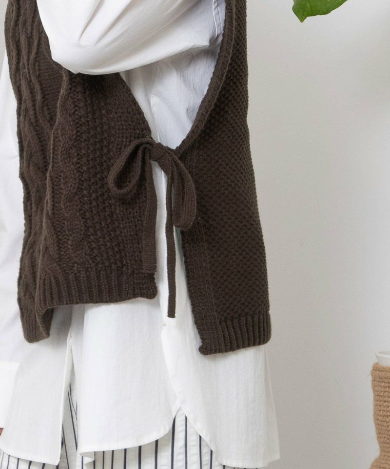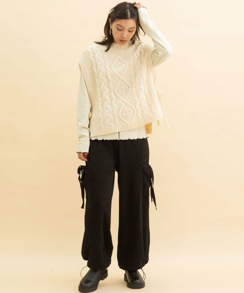 ハイネックのデザインがおしゃれなアランニットベスト。立体的で表情豊かなアラン柄の編地を使用したベストは存在感のあるアイテムです。サイドについたリボンもアクセント。