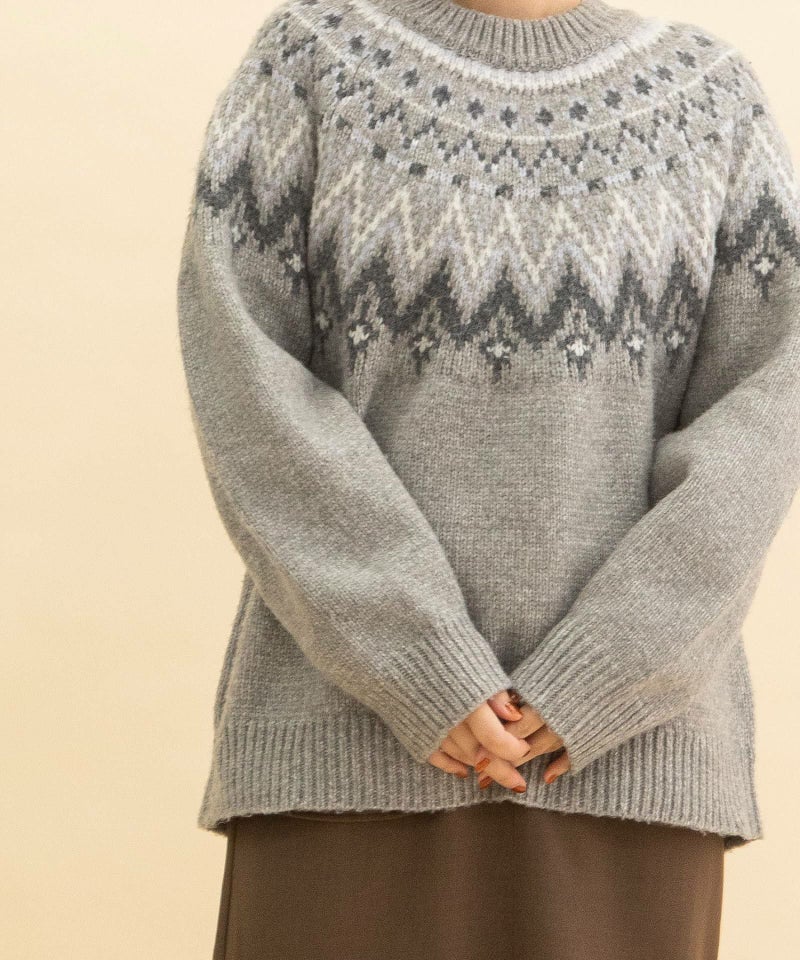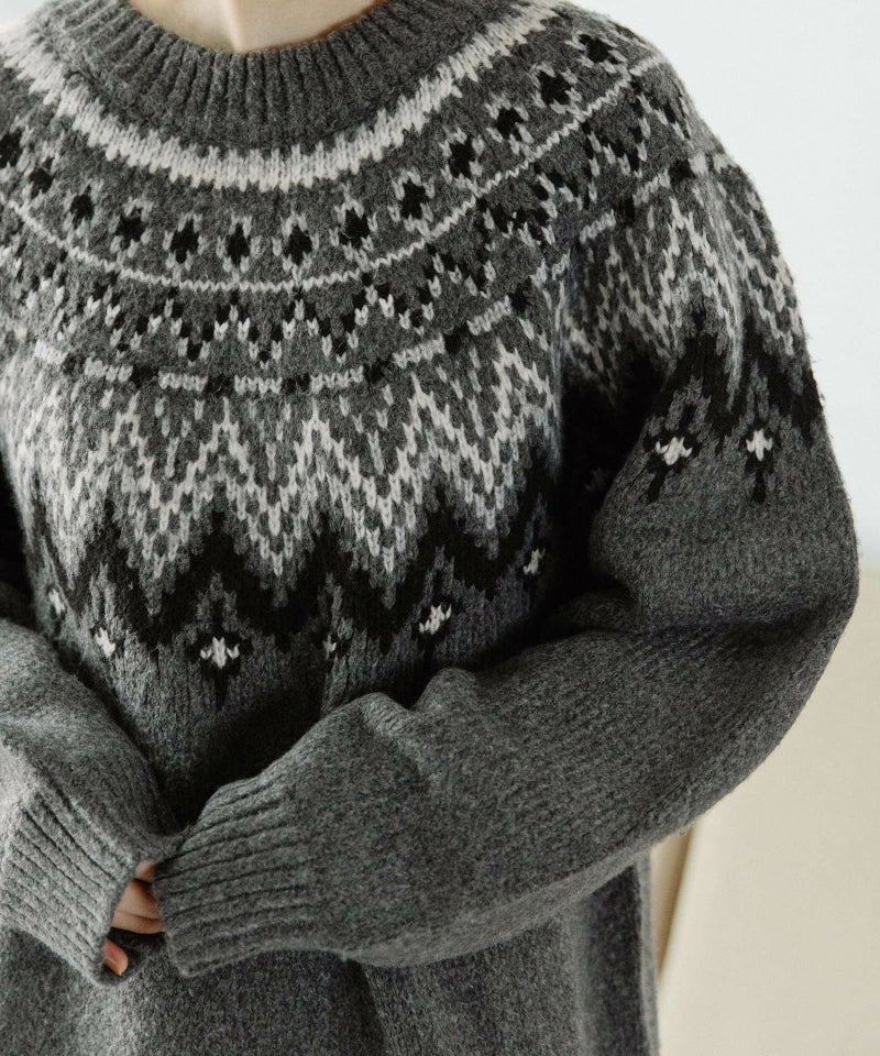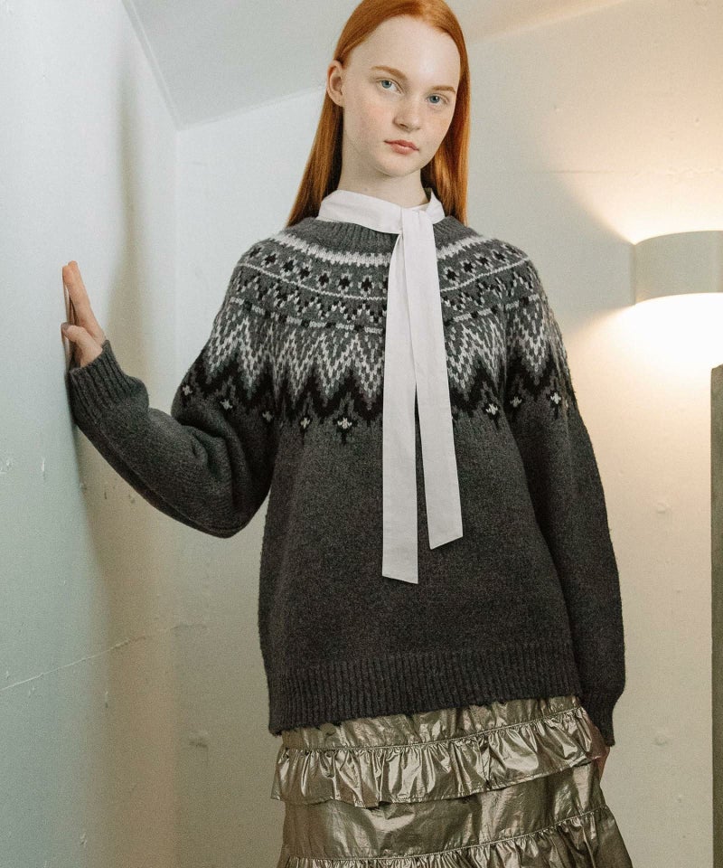 ノスタルジックなムードが漂う求心柄ジャガードニット。大人っぽく着られる落ち着きのある配色デザインで、コーディネートに取り入れやすい1枚。ゆったりとしたフォルム感があり腰が隠れる着丈なので、スカートでもパンツでも合わせやすく着回しのきくアイテムです。