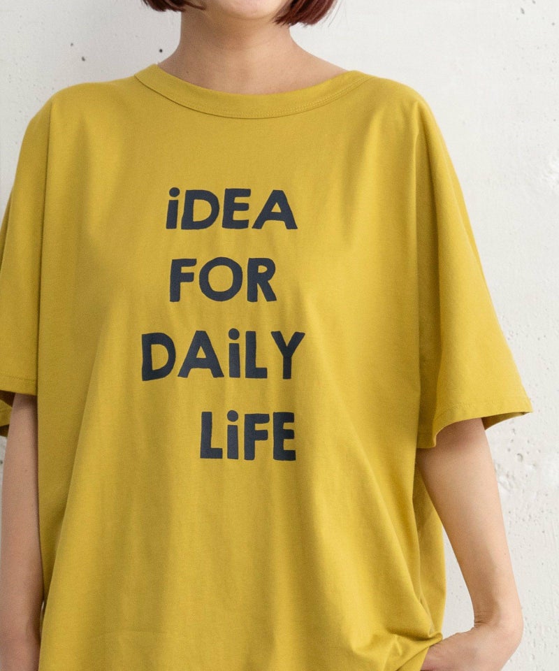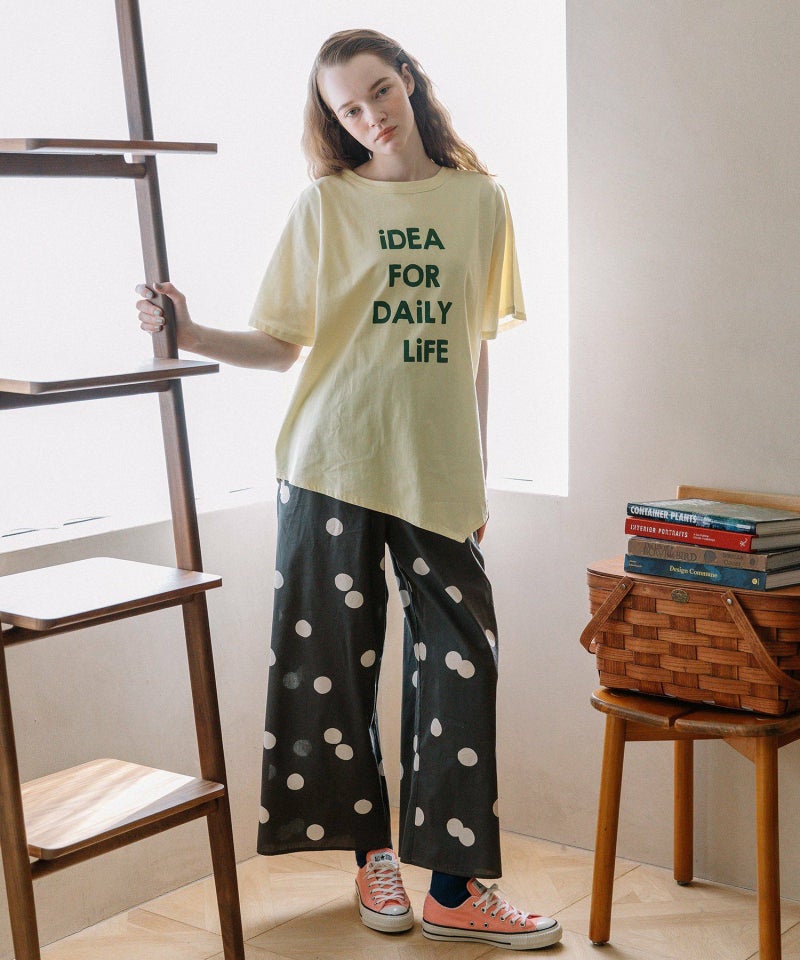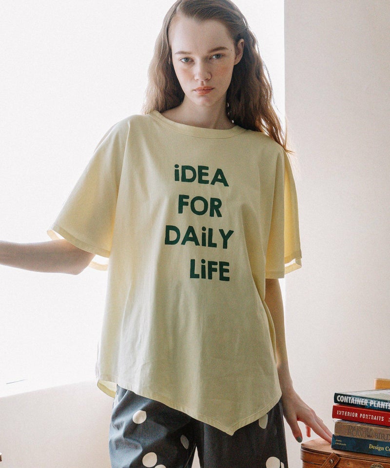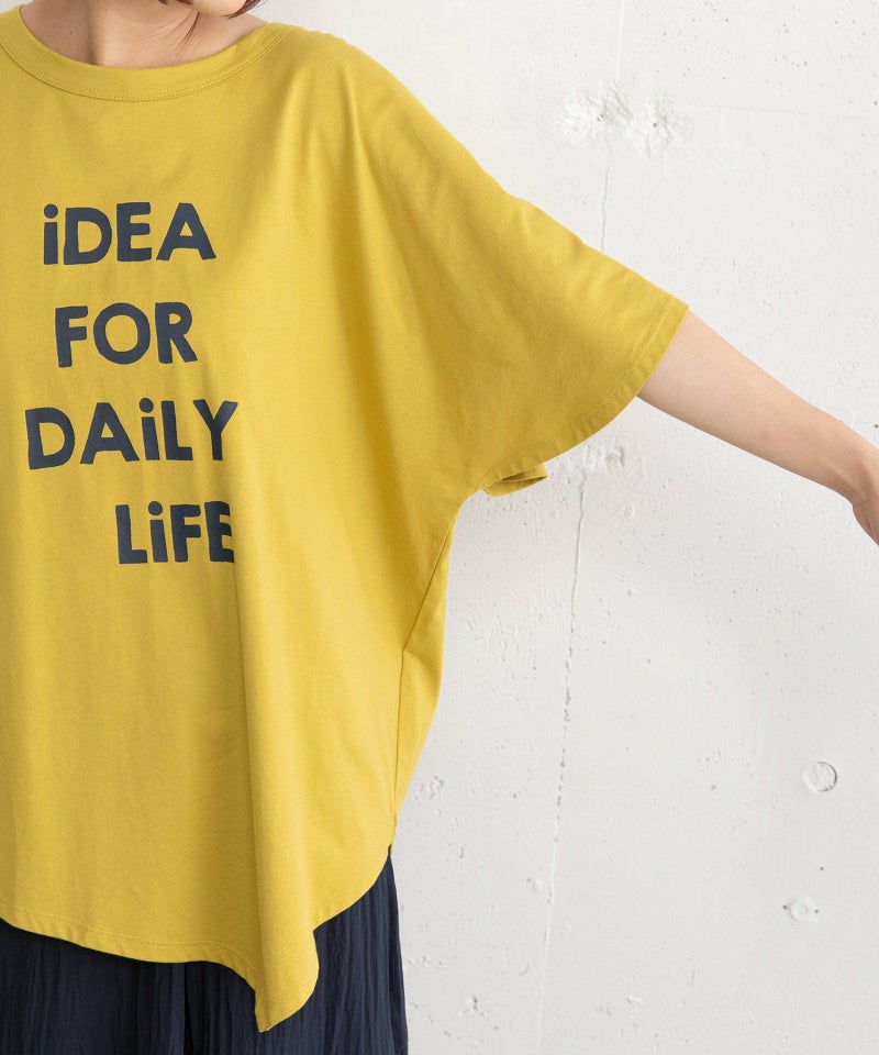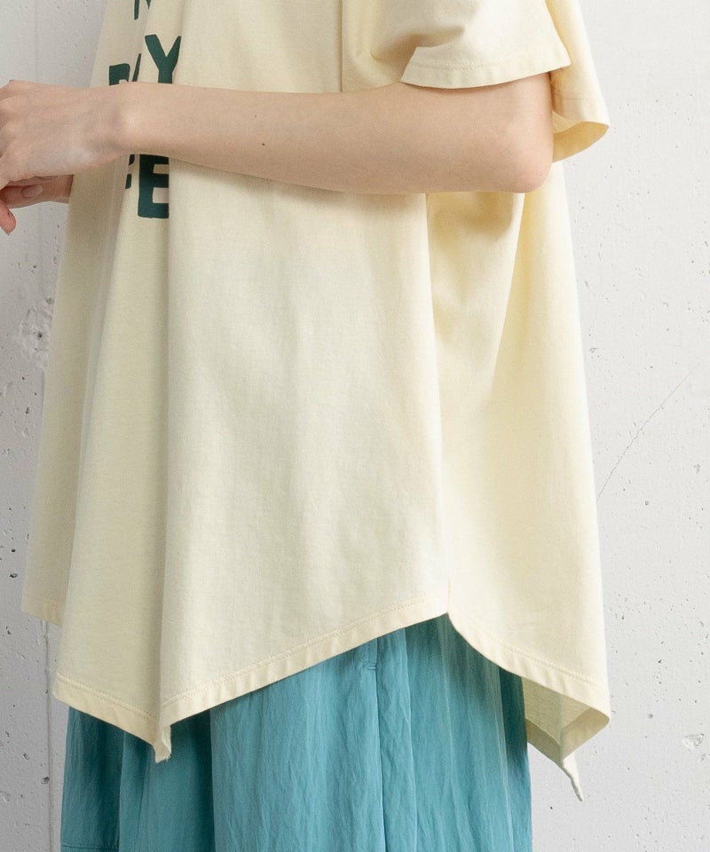 イレギュラーな裾のラインがデザインポイントのトップス。ゆったりとした身頃がリラクシーな雰囲気です。落ち感のあるフレア袖は二の腕をすっきりと見せてくれます。他にはないデザインと、一枚でこなれた印象になる嬉しいアイテム。大文字と小文字をミックスしたプリントもポイントです。