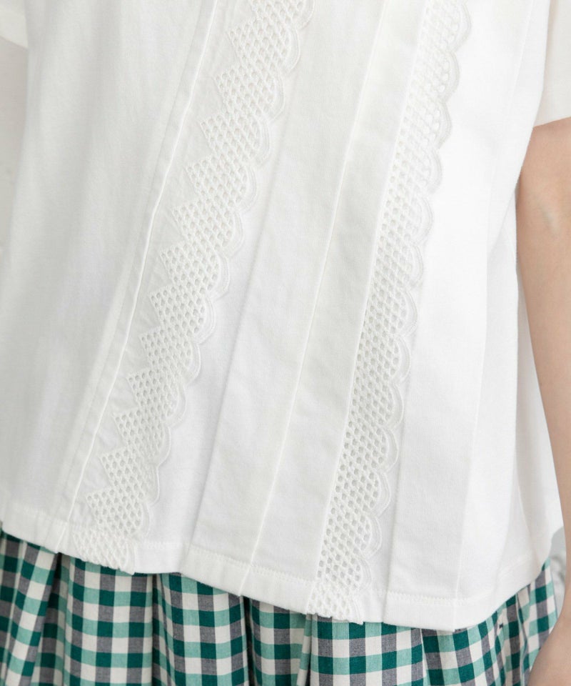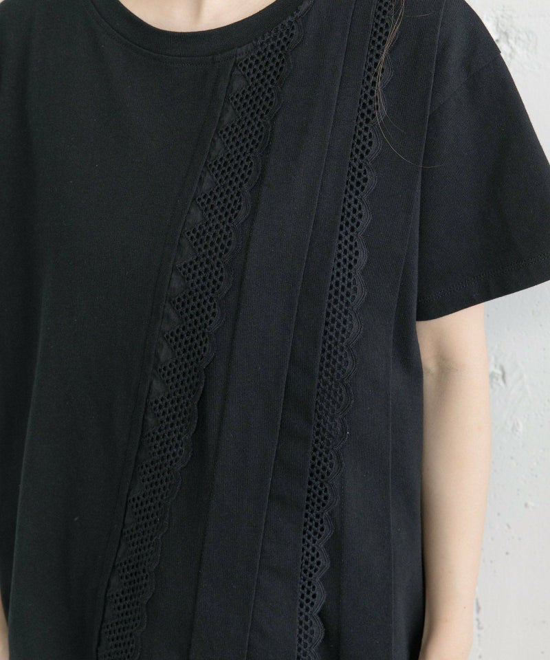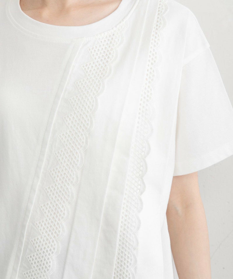 存在感のあるレースをフロントに大胆にあしらったプルオーバー。タックを効かせた上品なシルエットで、Tシャツが苦手な方にもおすすめ。フェミニンなスカート合わせはもちろん、ワイドパンツでバランス良くまとめても◎。