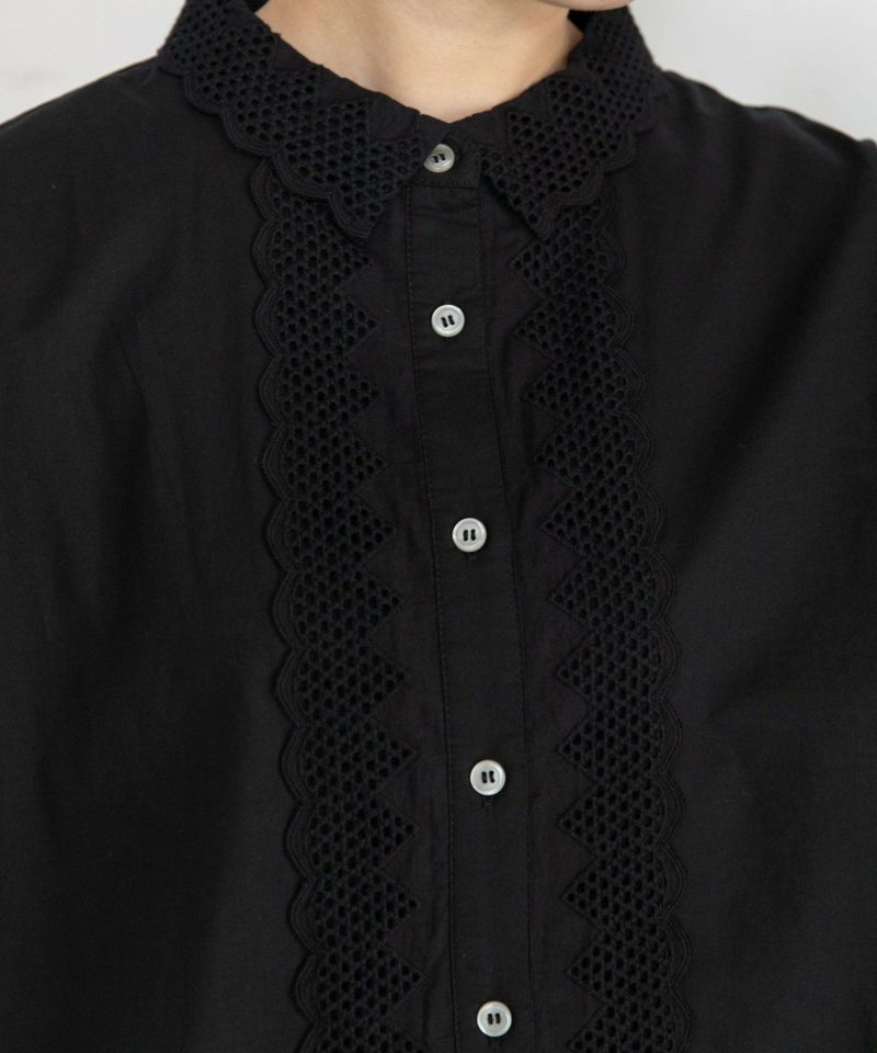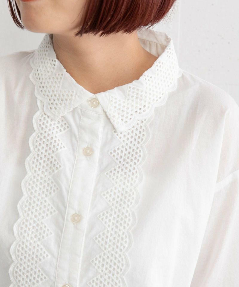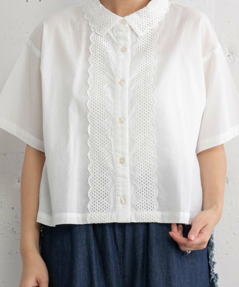 フロントにあしらわれたレースが目を引くデザインシャツ。すっきりとした丈感と袖丈で、バランスよく着こなせます。さらりとしたコットン素材で、暑い季節にも快適な一枚。繊細なレースで、さりげなく華やかに。いつものデニムに合わせるだけで、ちょっぴり特別なコーデになります。フルオープンで羽織としての着用もおすすめです。