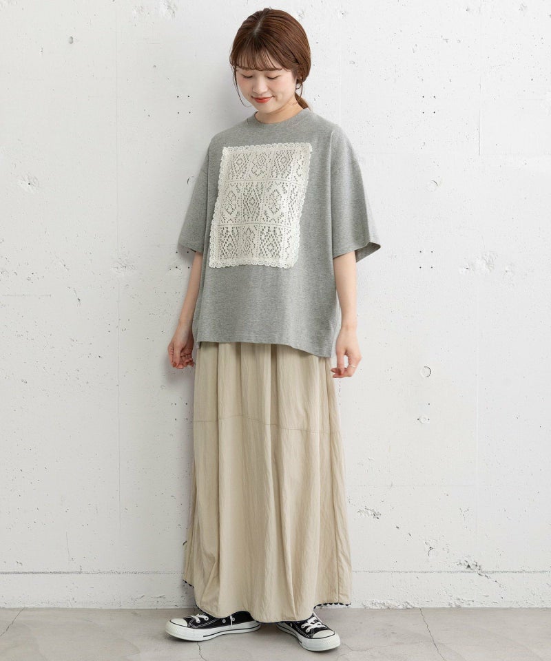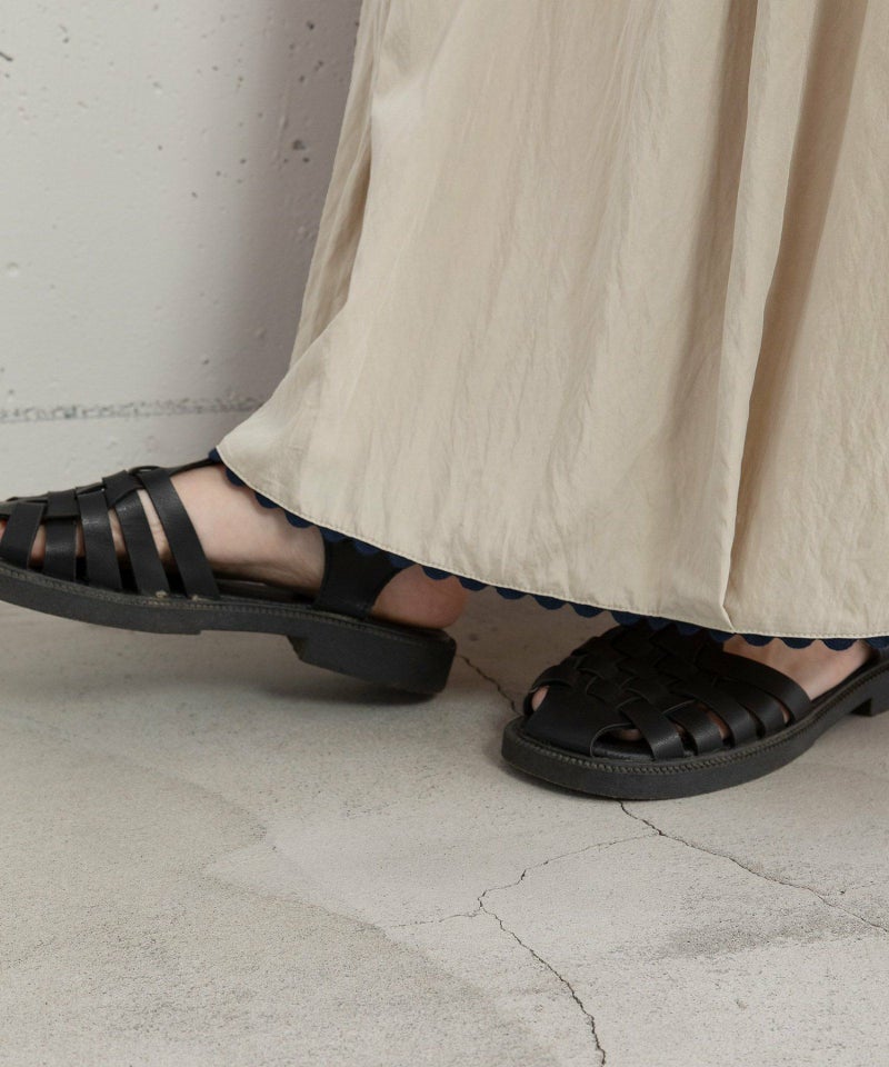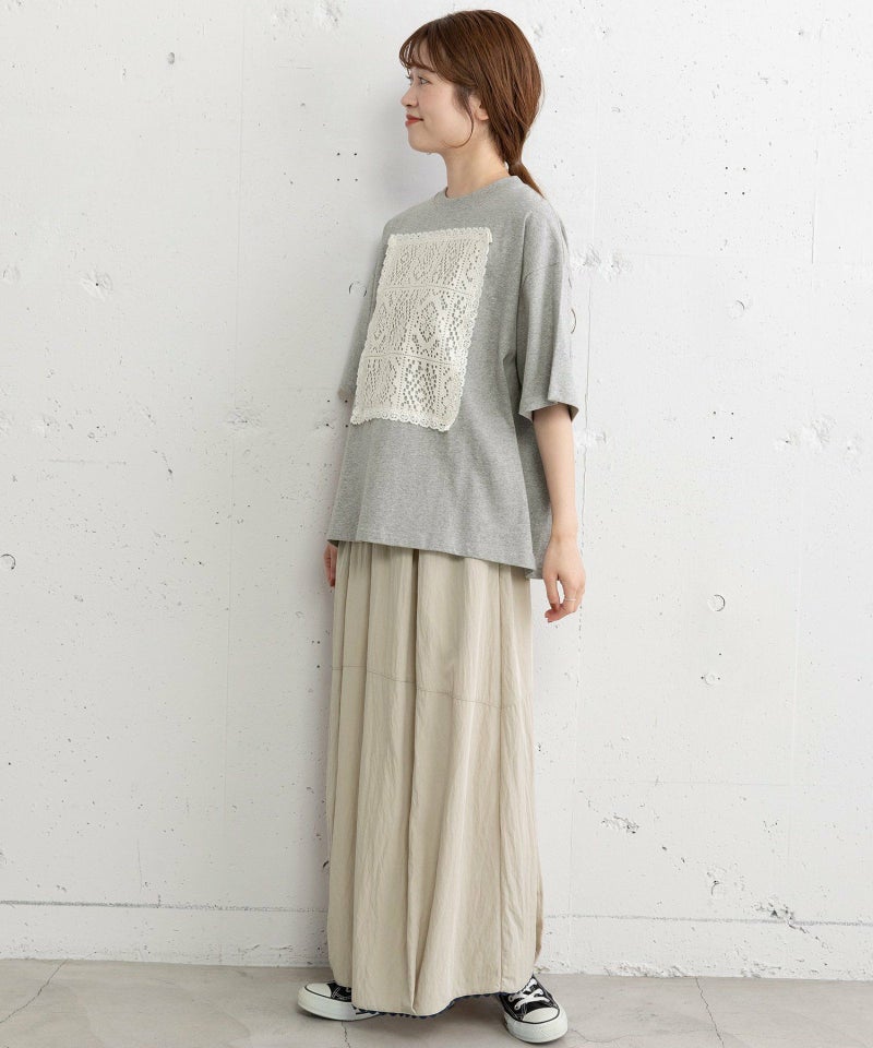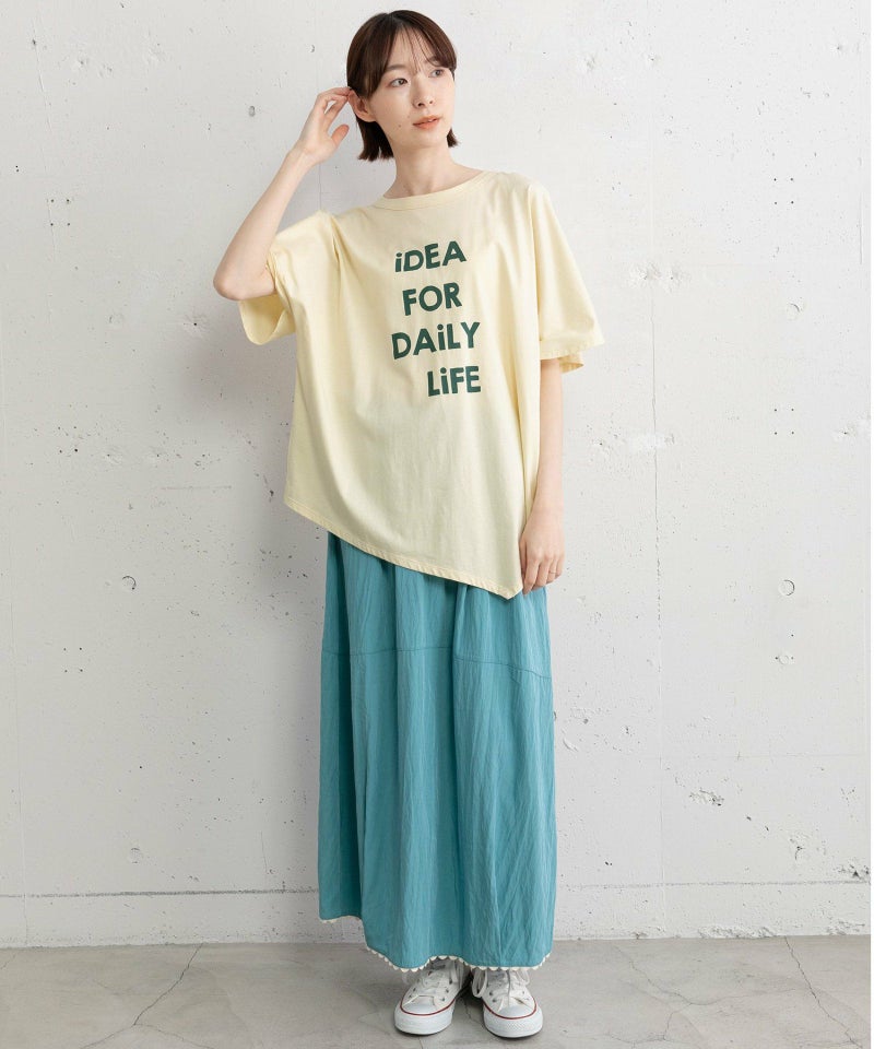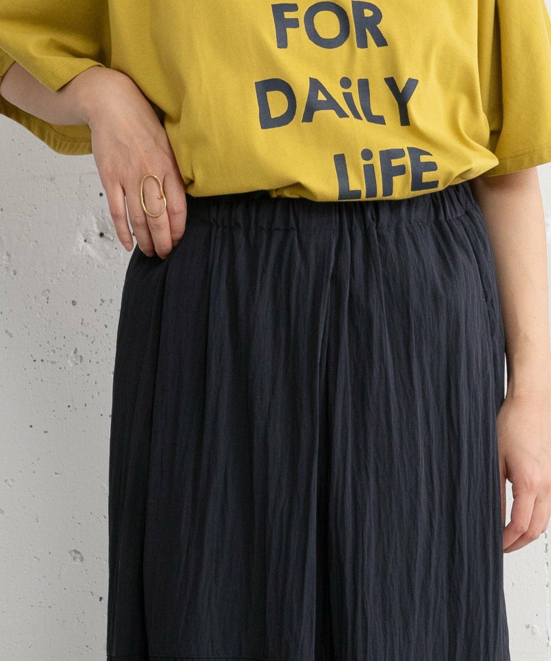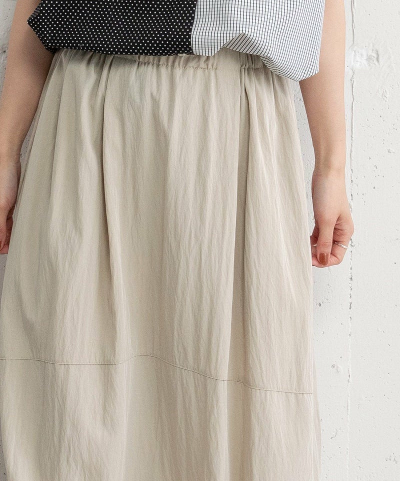 ウエスト部分のタックとギャザーで脚を包み込むようなボリューム感を出したスカート。丸みのあるコクーンシルエットがポイントです。ポリエステル素材で軽く、ワッシャー加工のシワ感が入ることでシャリ感のあるドライな風合いです。裾に山道テープを縫い付け、ちらりと見えるように。ウエストはぐるりゴムの仕様、紐でサイズ感の調節ができます。
