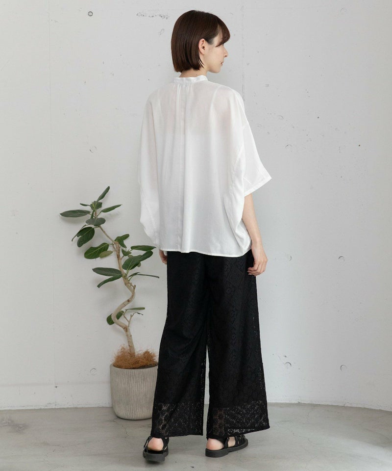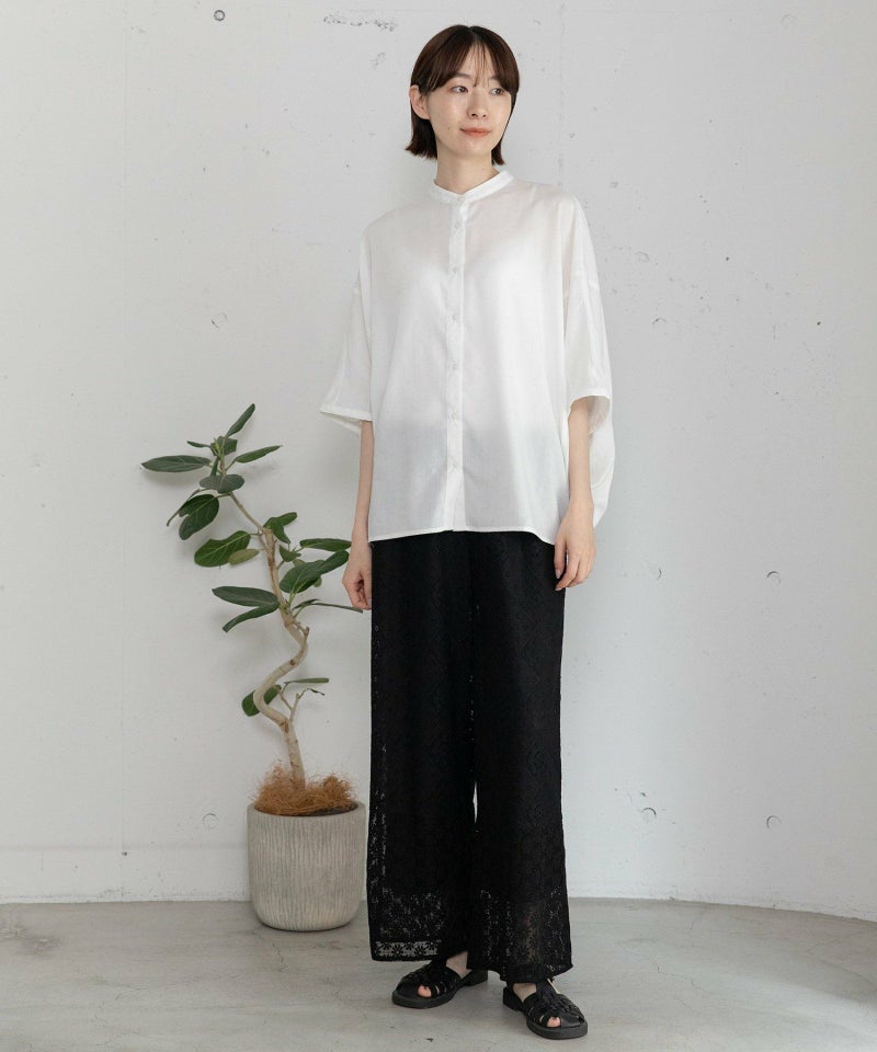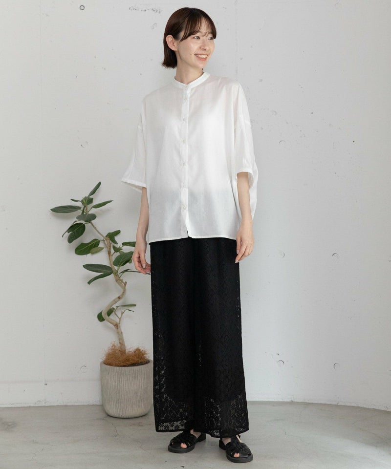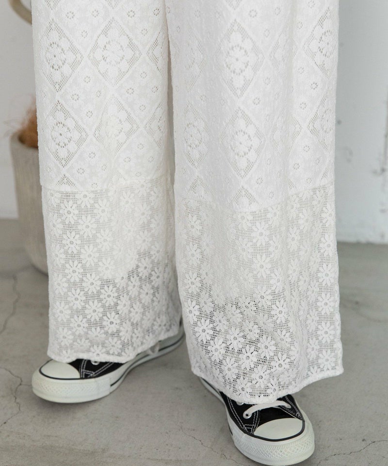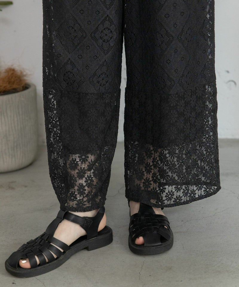 程よいレースの透け感が涼しげなイージーパンツ。アンティーク感のあるフラワー柄の繊細なラッセルレースで仕立てました。程よくゆとりのあるストレートシルエット。裾の切り替えデザインがポイントです。どんなトップスとも合わせやすく、着回しの効くアイテムです。カジュアルなTシャツとラフに合わせるだけでおしゃれなスタイリングに。ウエストゴム仕様で、リラクシーな履き心地も魅力的です。