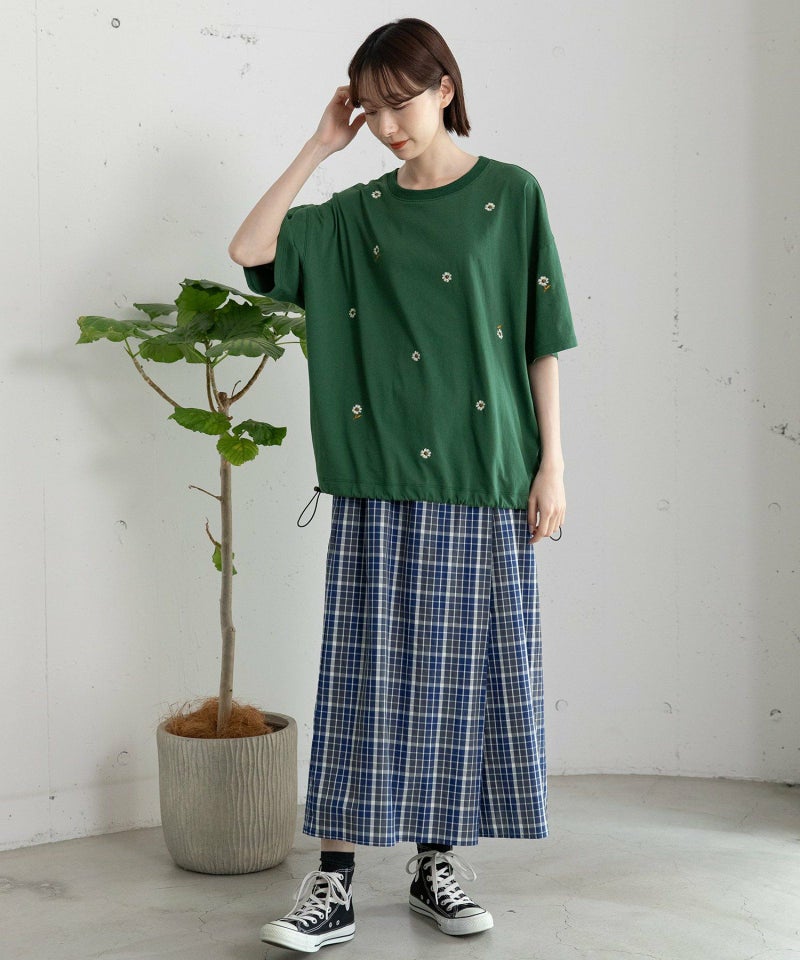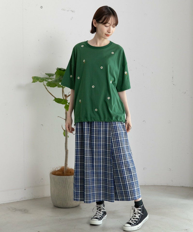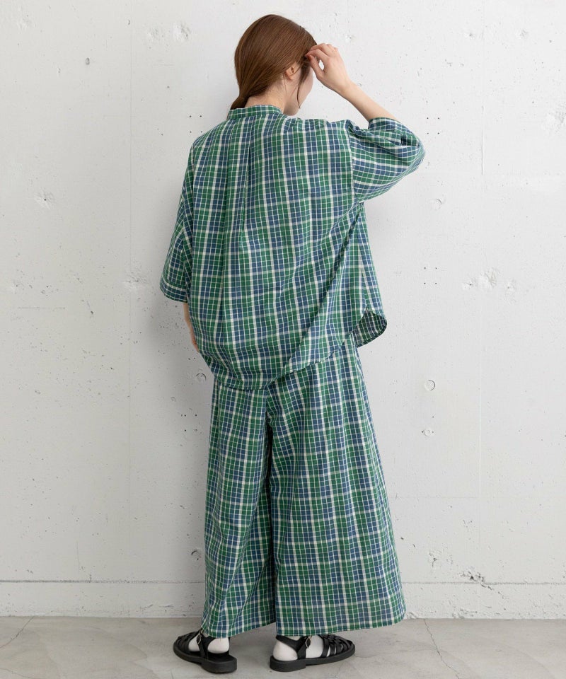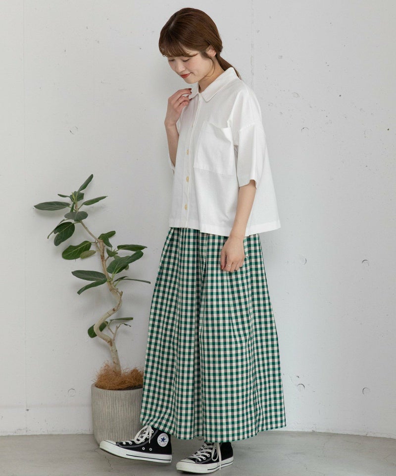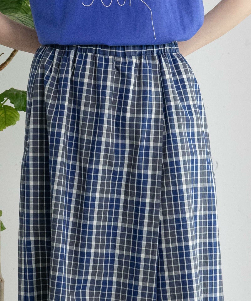 落ち着いた配色で組んだオリジナルのマドラスチェック。程よいボリューム感ですっきり見えし、スカートのように見えて活動しやすいシルエットです。シンプルなトップス合わせも着映えします。ウエストはゴム仕様、内紐でサイズ感の調節も可能です。両サイドポケット付き。