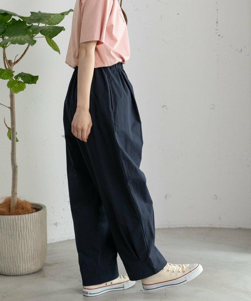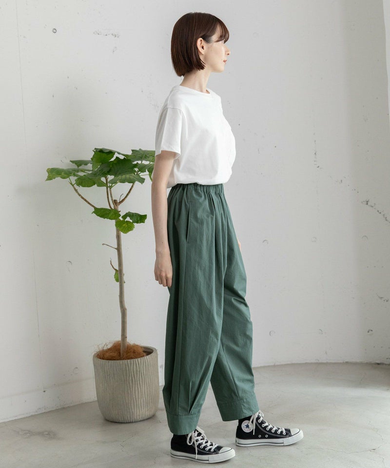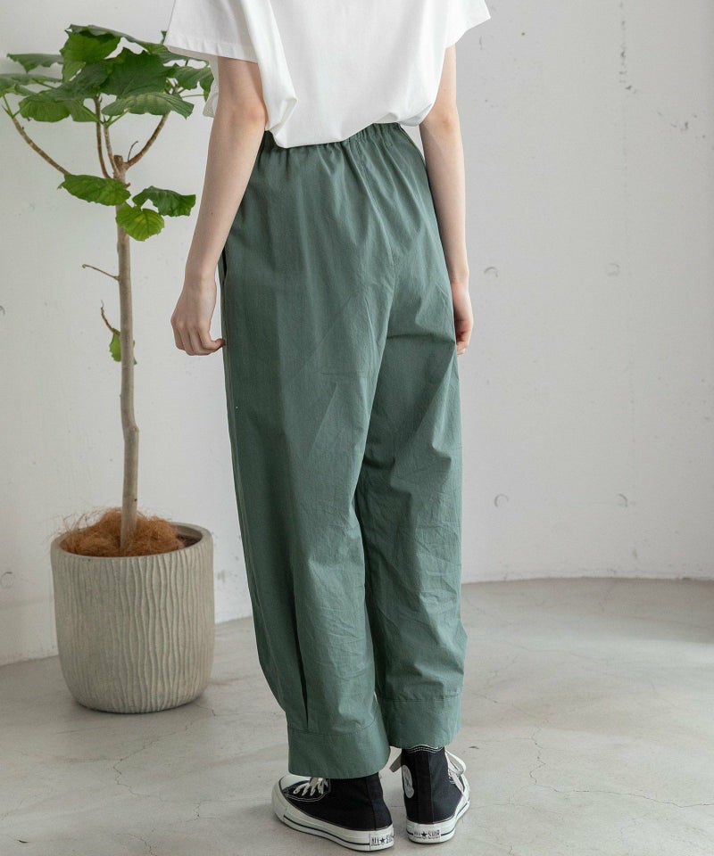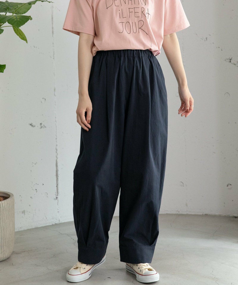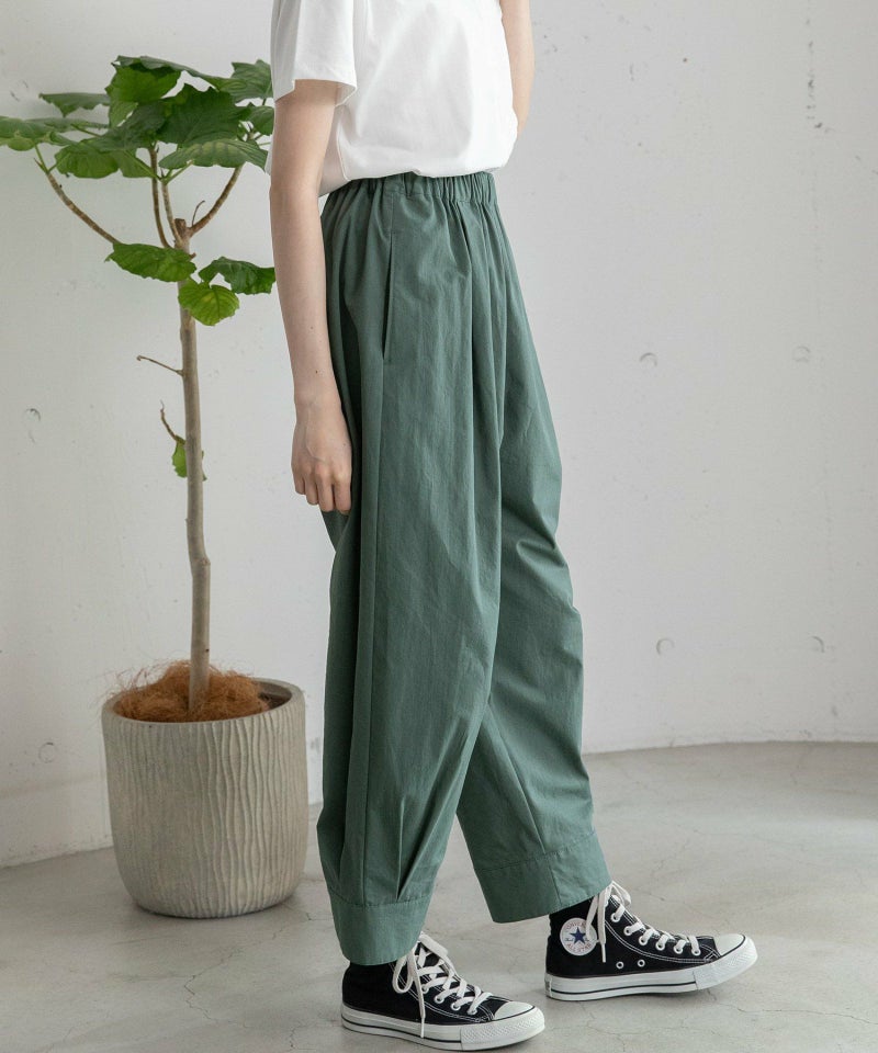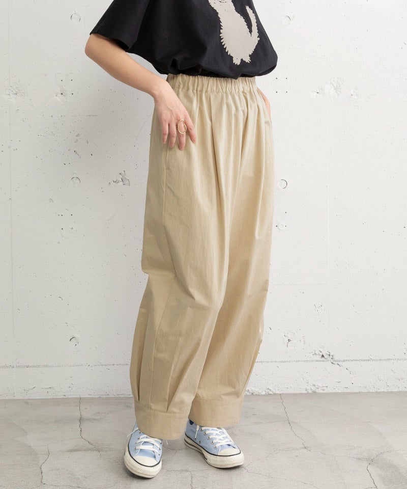 裾をまとめてタックを入れた、立体感のあるコクーンシルエットが特徴的なパンツ。ヒップから太もも周りはゆったりとさせ、裾に向かって少し細くなるシルエットで、脚のラインを拾わずに足元をすっきりと見せてくれます。コットンツイル素材でカジュアルな雰囲気を楽しめるアイテムです。ウエストはゴム仕様で内紐つき。両サイドポケット付き。