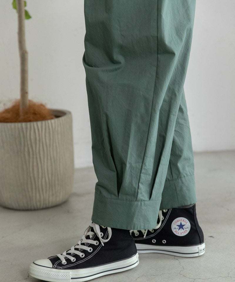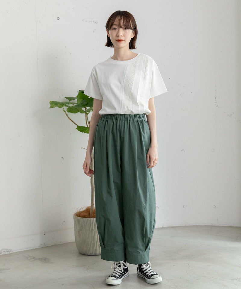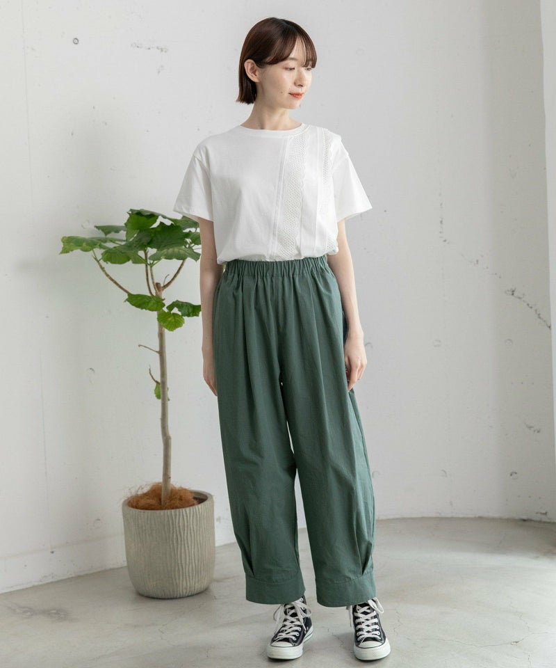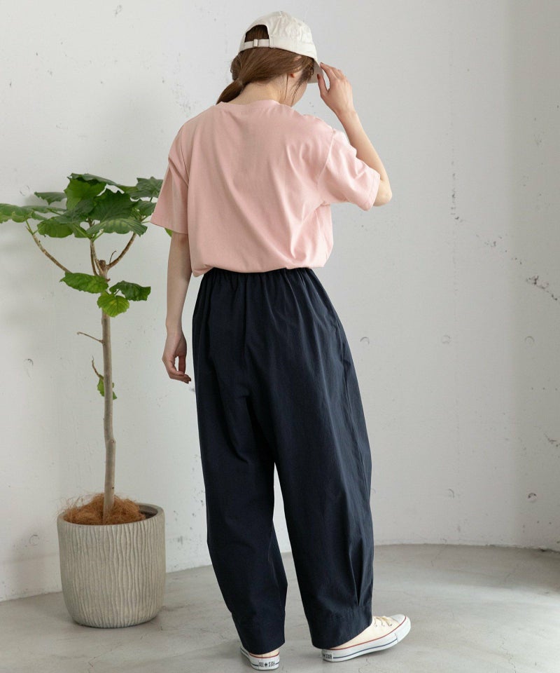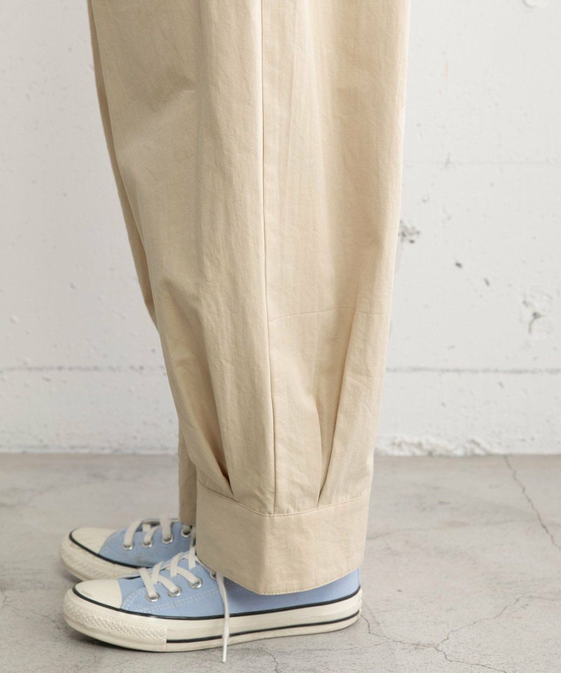 裾をまとめてタックを入れた、立体感のあるコクーンシルエットが特徴的なパンツ。ヒップから太もも周りはゆったりとさせ、裾に向かって少し細くなるシルエットで、脚のラインを拾わずに足元をすっきりと見せてくれます。コットンツイル素材でカジュアルな雰囲気を楽しめるアイテムです。ウエストはゴム仕様で内紐つき。両サイドポケット付き。