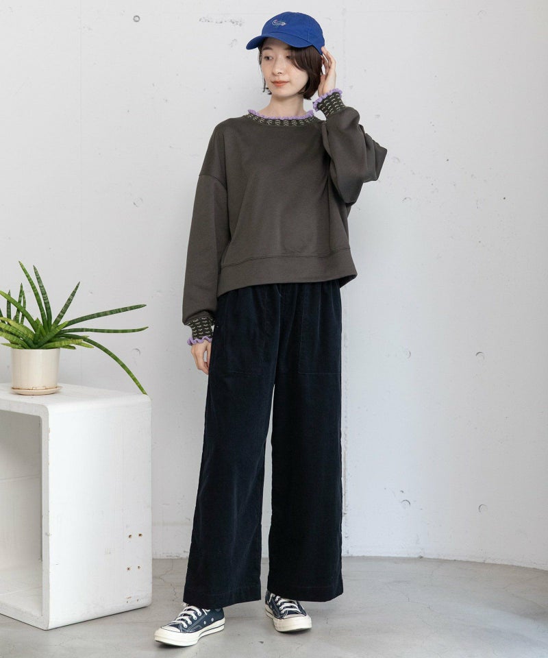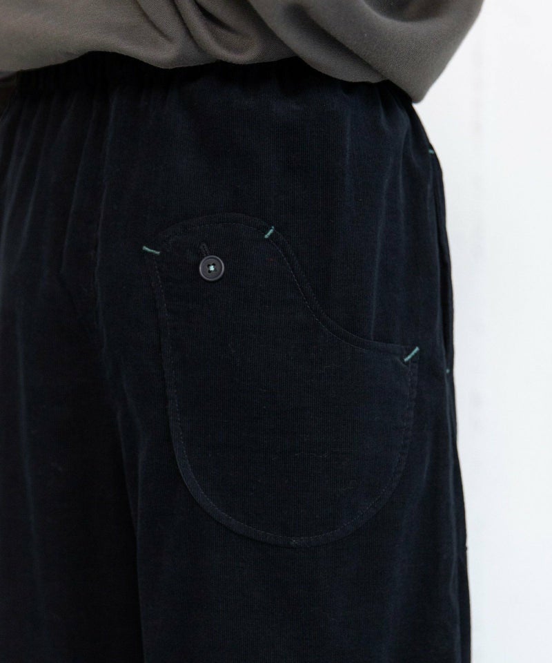 POU DOU DOU定番人気のとりポケットパンツにコーデュロイ素材が登場です。畝が細く薄手で柔らかいシャツコール素材を使用しています。細やかな起毛感があるので寒い春先まで着用していただけます。セミワイドのストレートシルエットで、着回しの利くデザイン。ウエストはゴム仕様、内紐でサイズ感の調節ができます。さりげないとり型のポケットがポイント。両サイドにポケット付き。