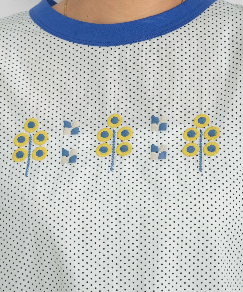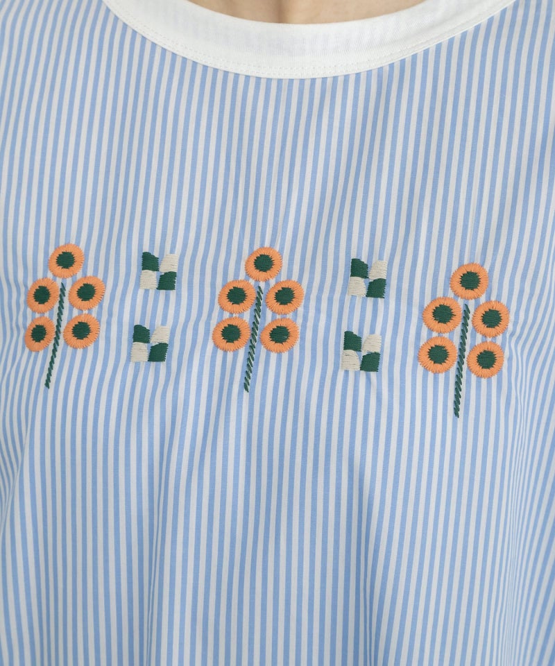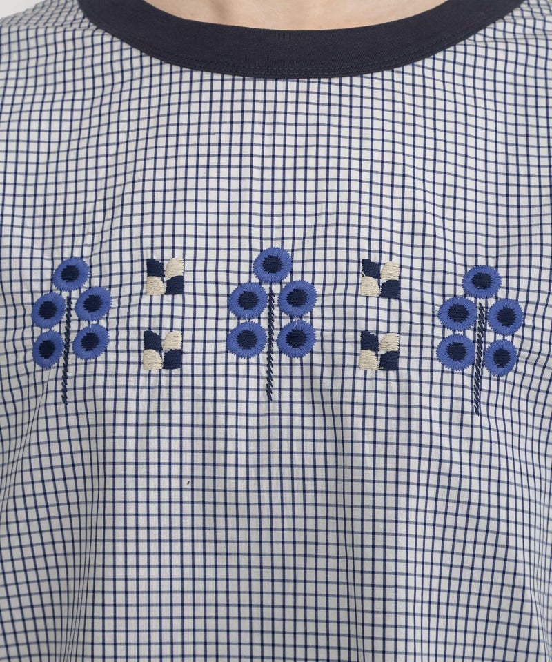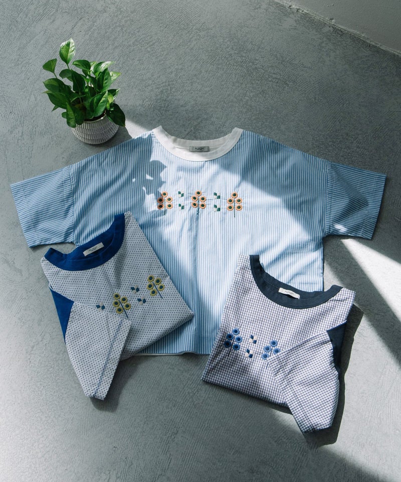 フロントの刺繍が目を惹くデザインTシャツ。丸と四角を組み合わせたノルディックテイストの刺繍です。前身頃と袖は布帛の柄生地を使用し、後ろ身頃はカットソー素材を組み合わせています。リラックスできる着心地ながら、カジュアルすぎずにブラウスのように着ていただけるアイテムです。パンツでもスカートでも合わせやすいジャスト丈。