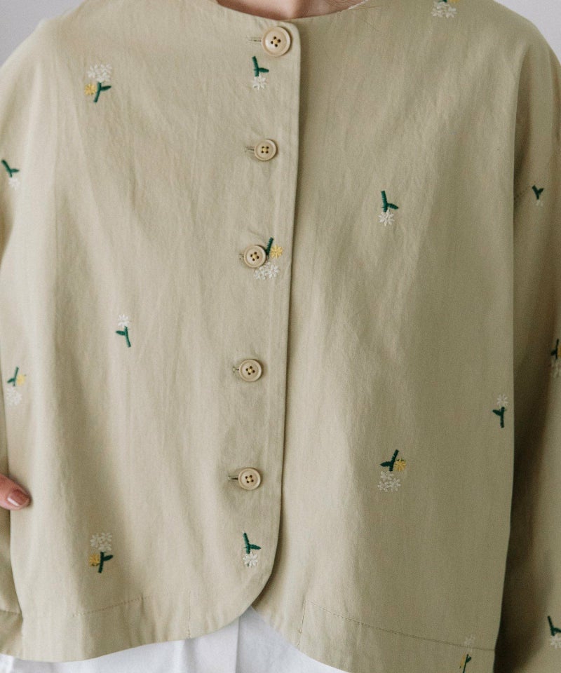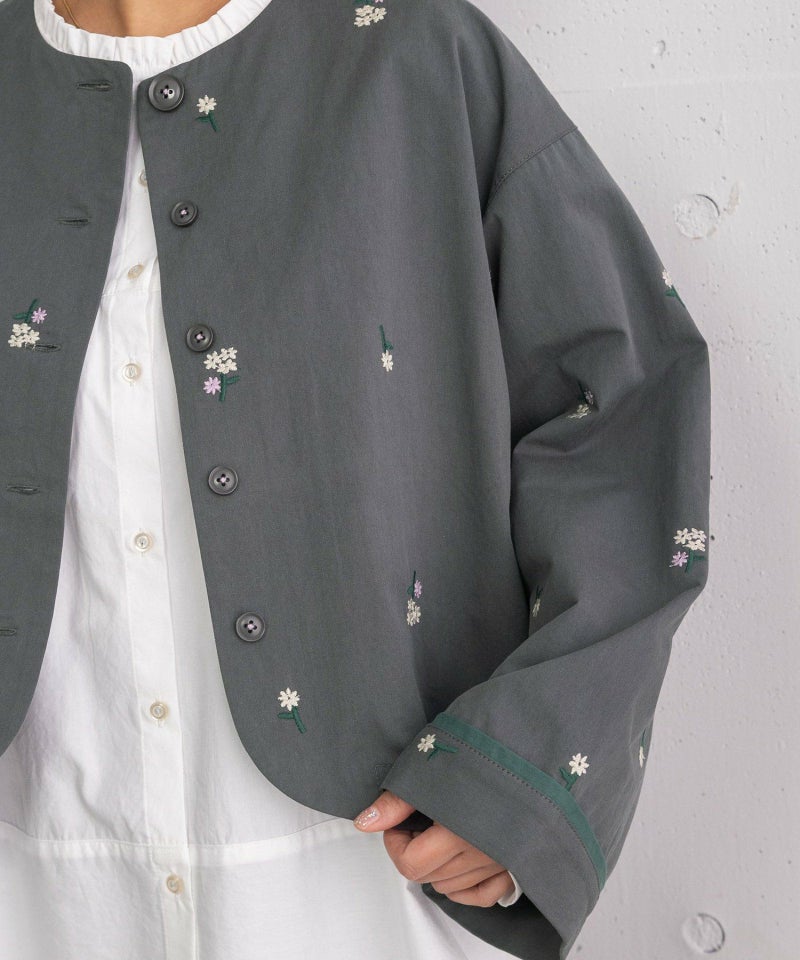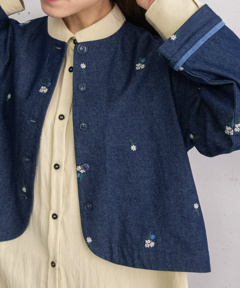 コットンツイルとデニムにオリジナルのフラワー刺繍を載せたテキスタイルで仕立てたジャケット。ロング丈のボトムスやワンピースなどに合わせやすいクロップド丈です。ドロップショルダーのゆとりのある袖回りで、スウェットやブラウスの上に羽織りやすく、前後差のある着丈とラウンドした裾のラインが柔らかな印象で着られます。袖口の配色パイピングがアクセント。