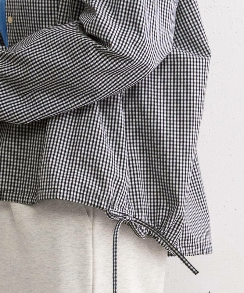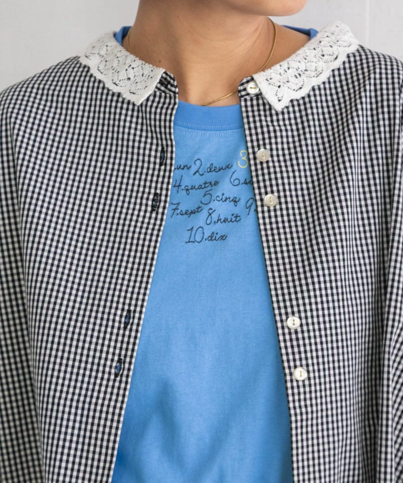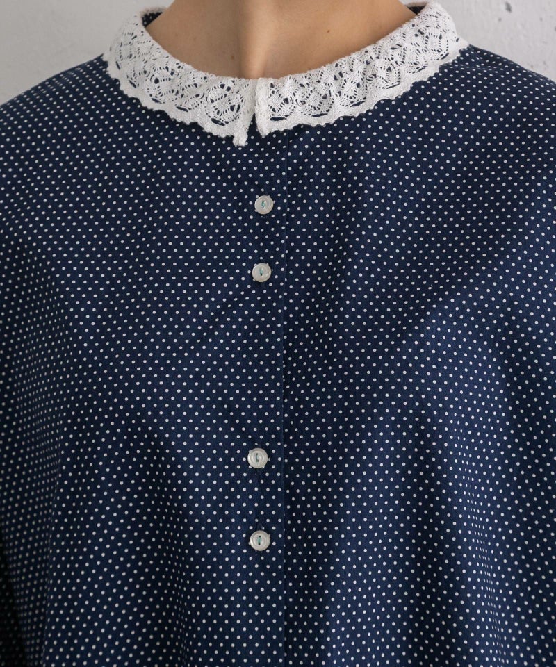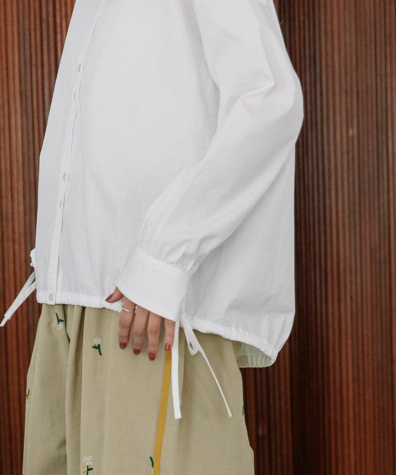 トーションレースの衿がポイントのブラウス。花モチーフの繊細なレースが、装いに華やかさを添えます。落ち肩でゆとりのあるサイジングに、裾はバックに向かって前後差をつけたラウンドテールデザイン。両サイドの紐を絞ることで、シルエットに変化をつけた着こなしも楽しめます。