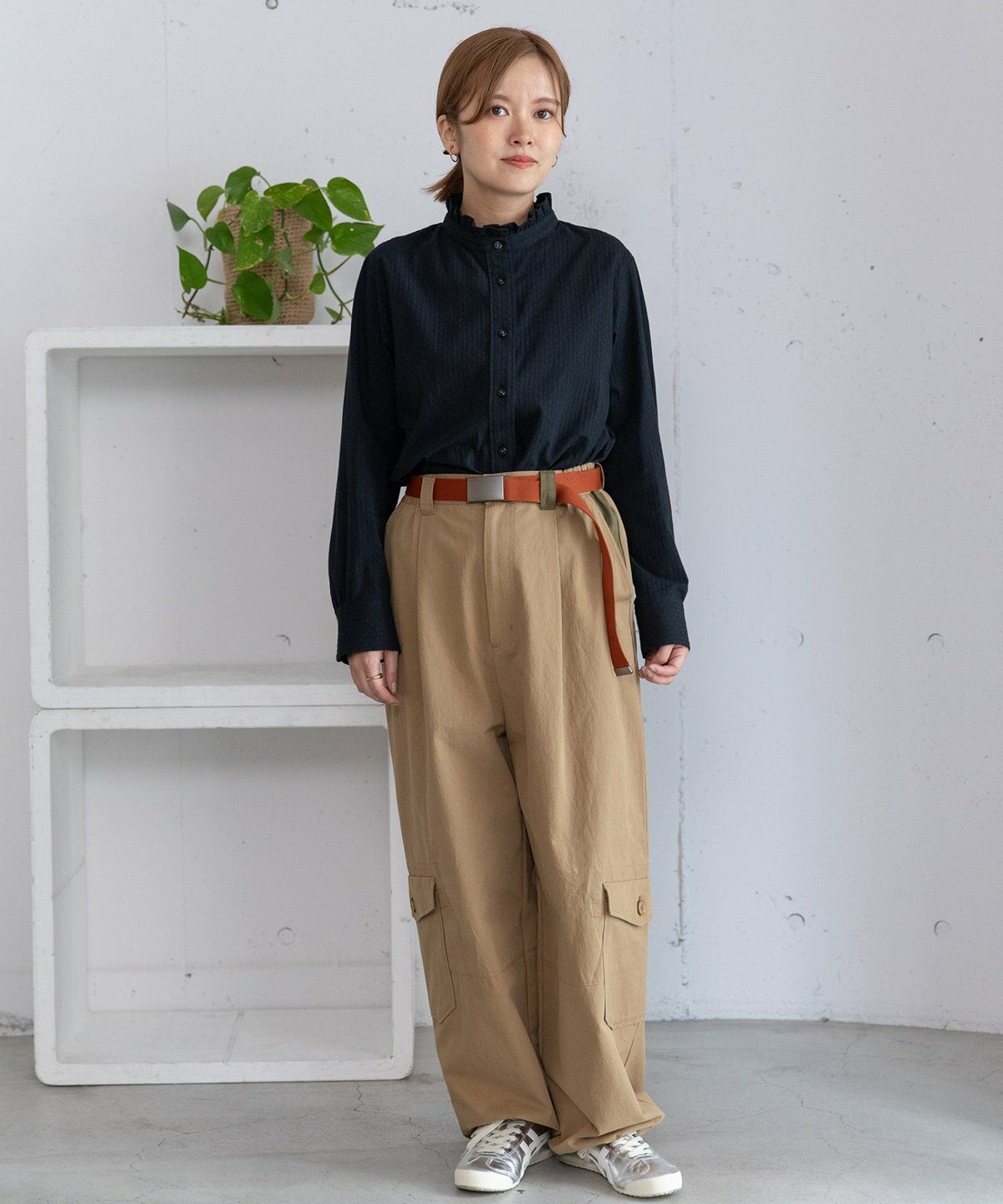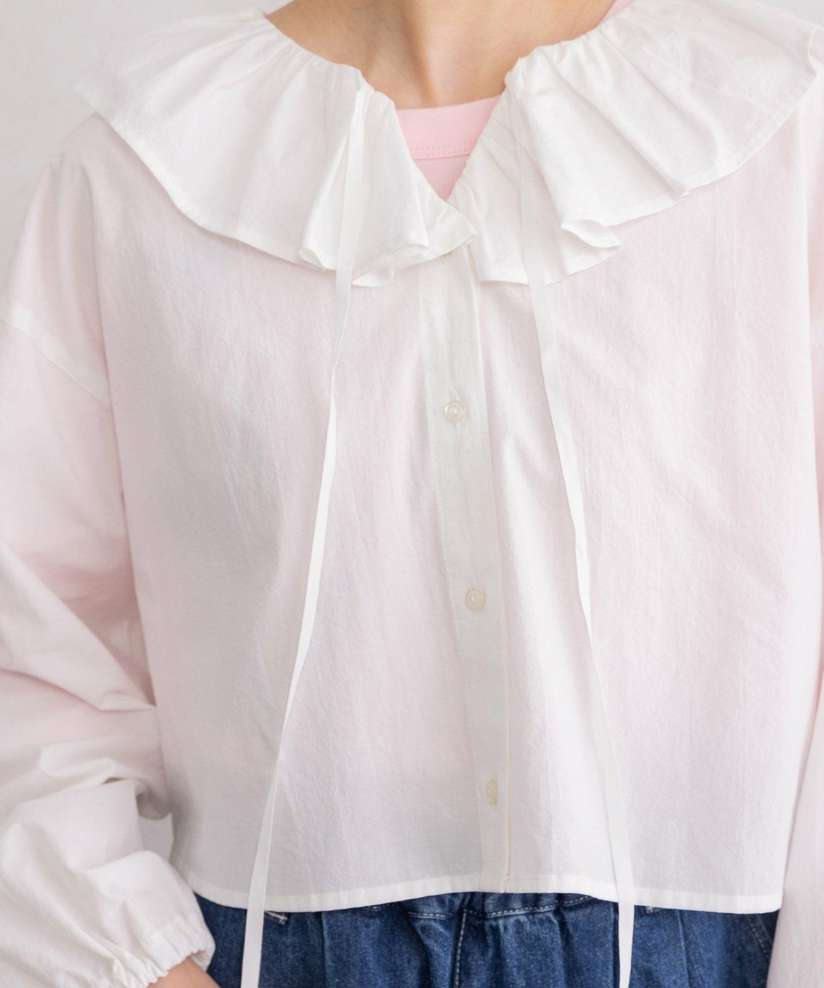 スタンドフリルラウンドヨークブラウス