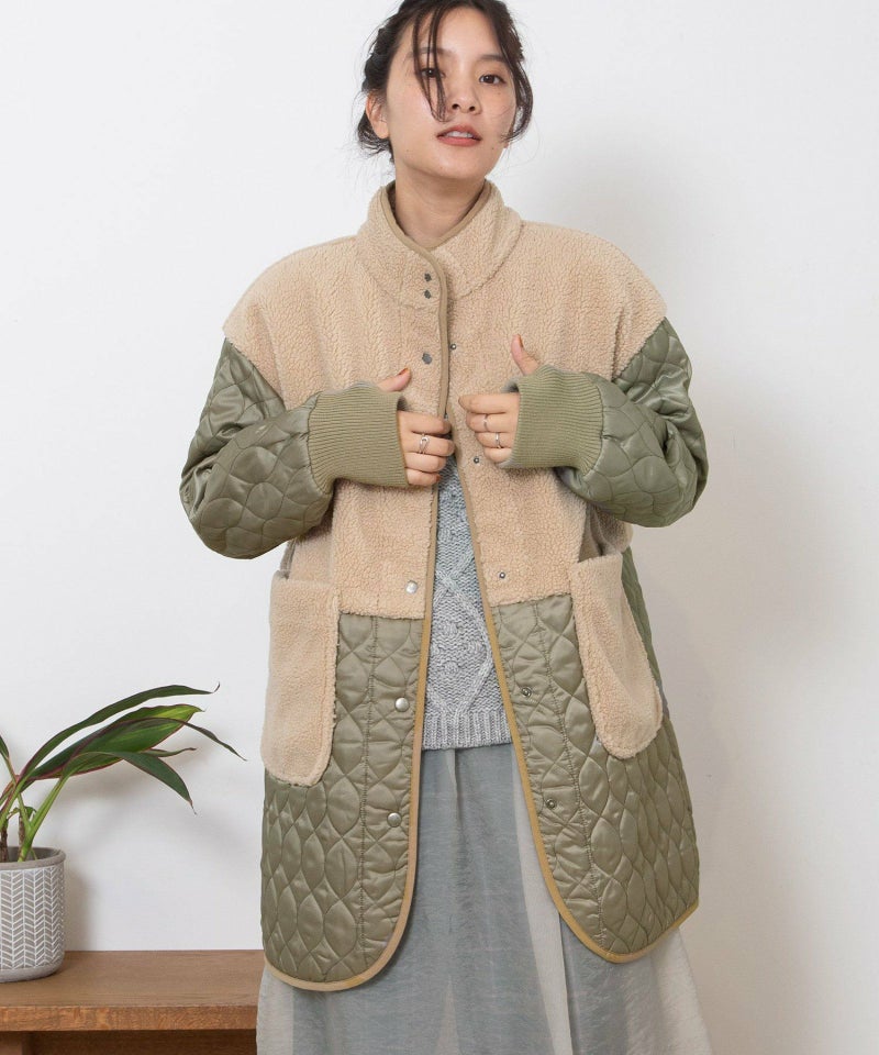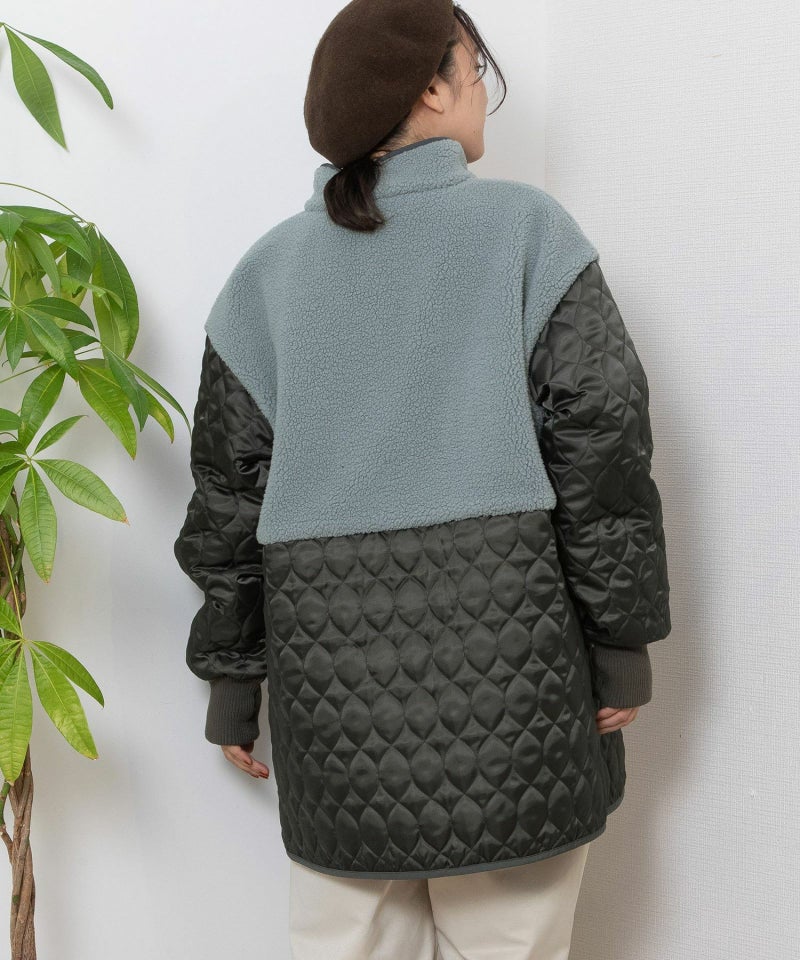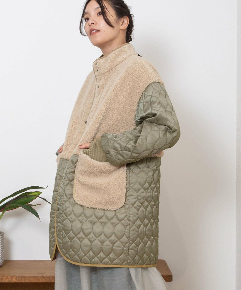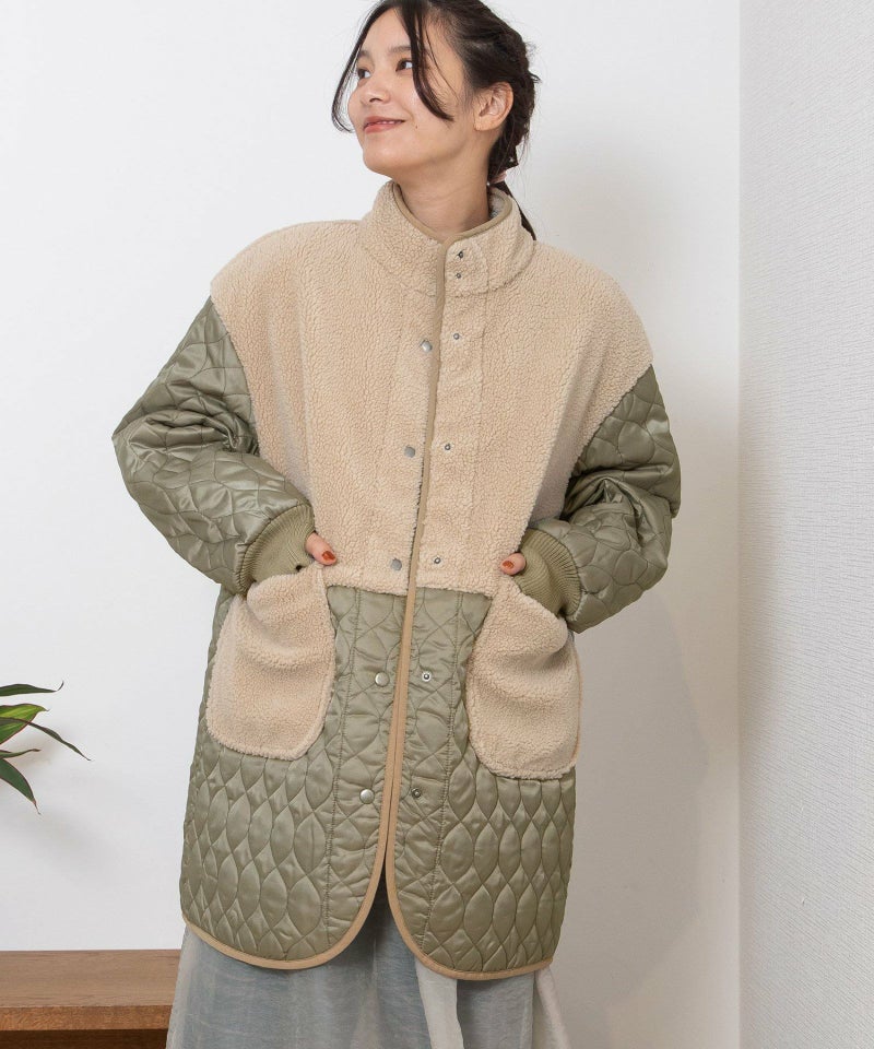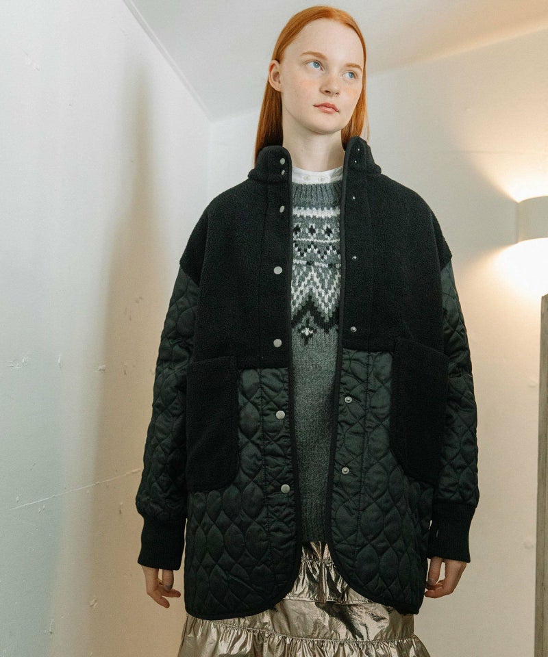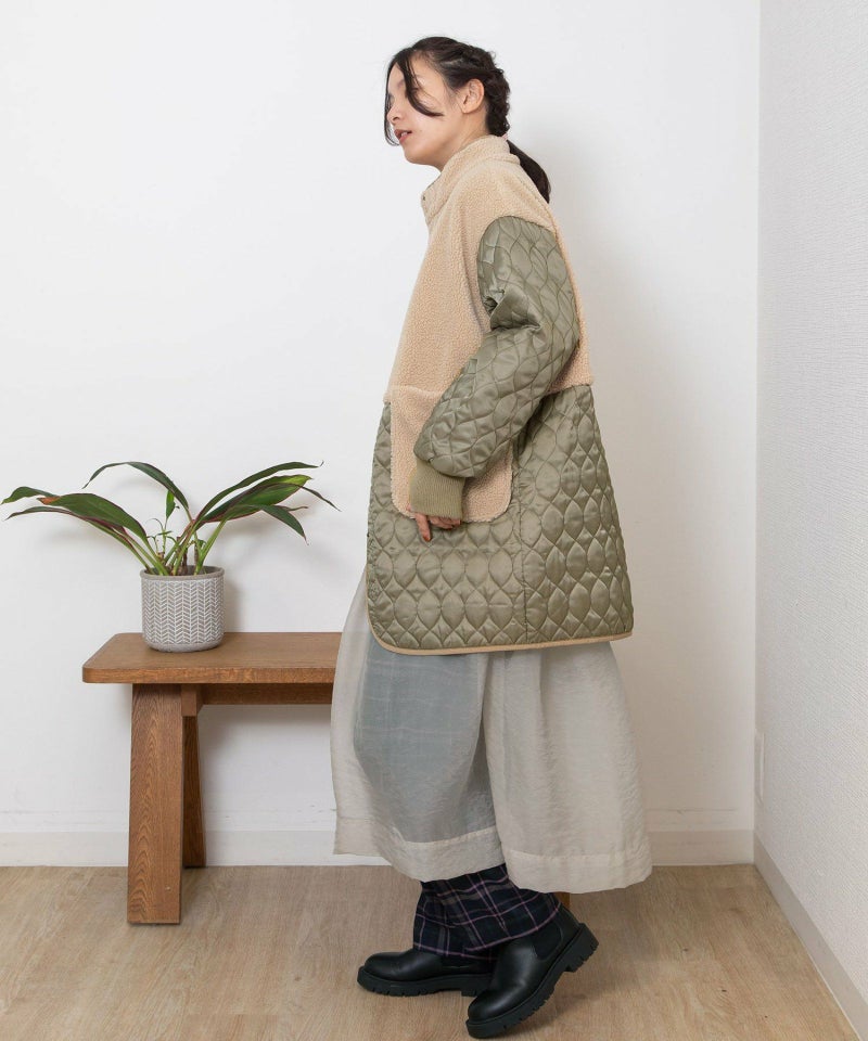 キルティングとボアを切り替えたデザインコート。キルティングはレモンのようなシルエットを並べたオリジナルのテキスタイルです。比較的軽量ながら、ゆったりとしたサイズ感と腰下にかかる丈感であたたかく着られます。袖口のリブを長めに取り、指穴を開けているので自転車を乗る方にもおすすめです。