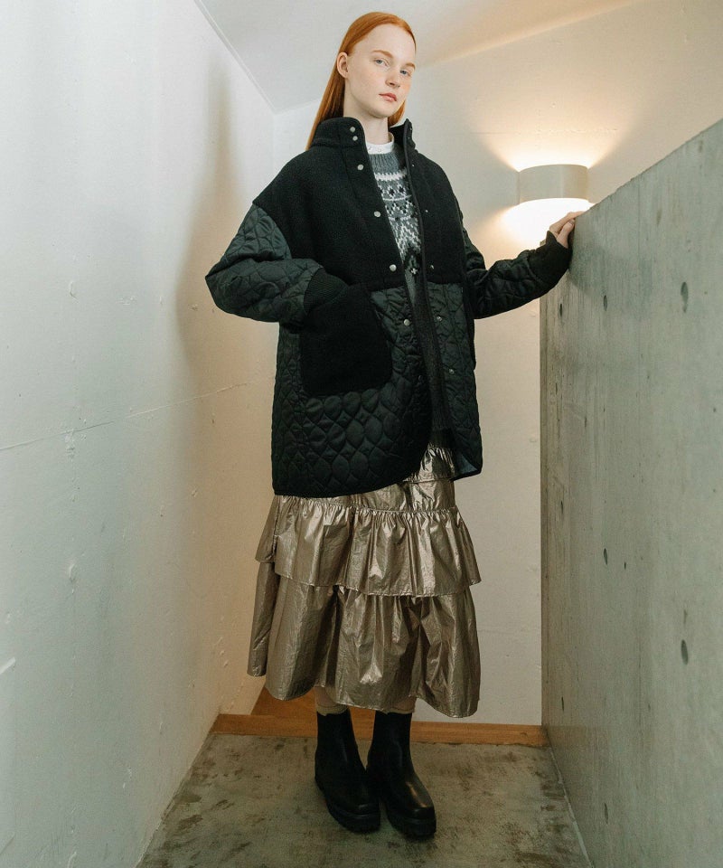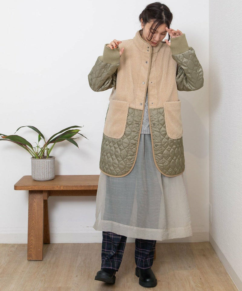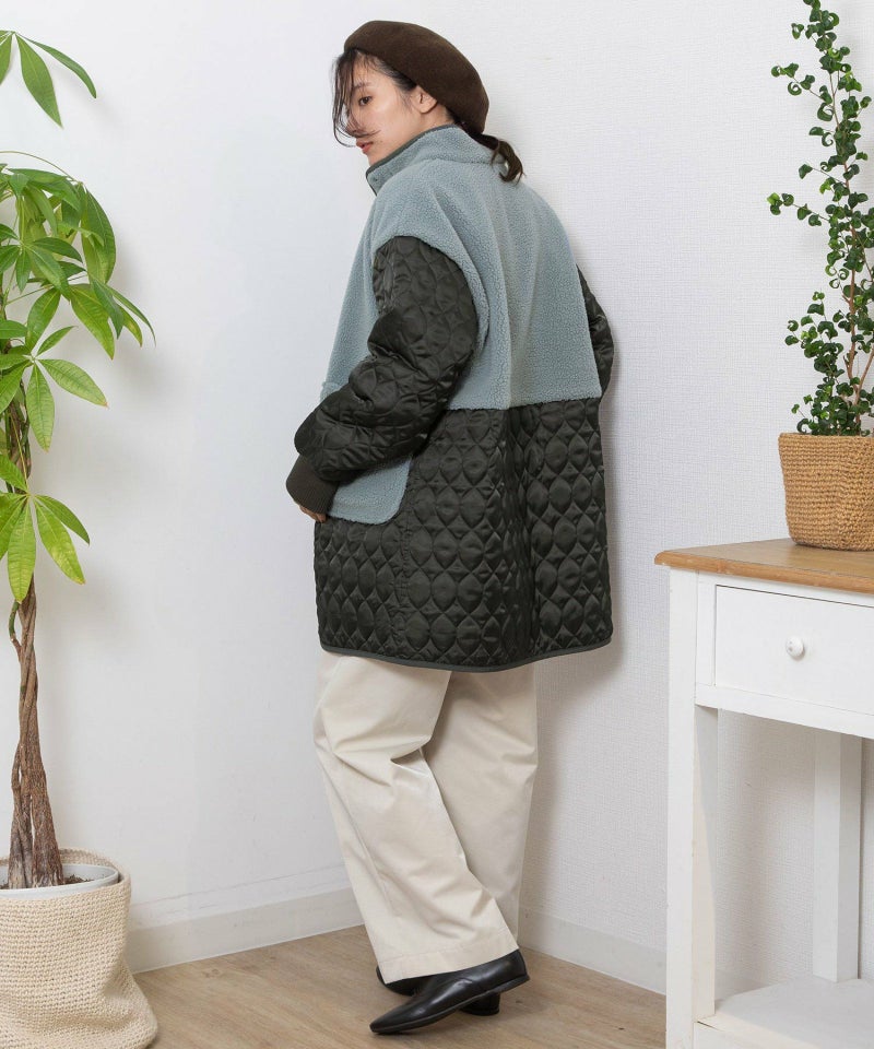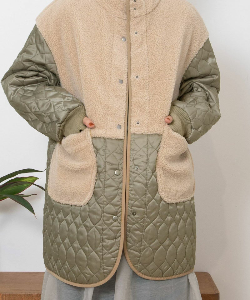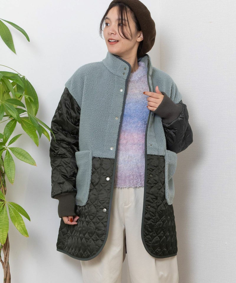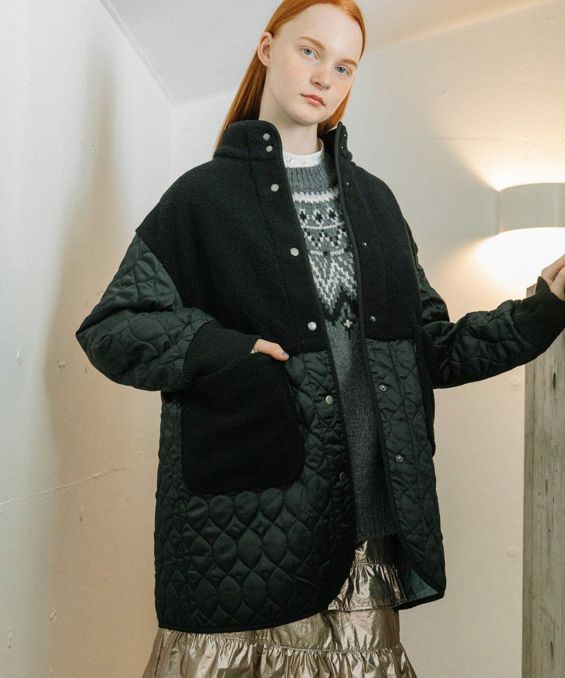 キルティングとボアを切り替えたデザインコート。キルティングはレモンのようなシルエットを並べたオリジナルのテキスタイルです。比較的軽量ながら、ゆったりとしたサイズ感と腰下にかかる丈感であたたかく着られます。袖口のリブを長めに取り、指穴を開けているので自転車を乗る方にもおすすめです。