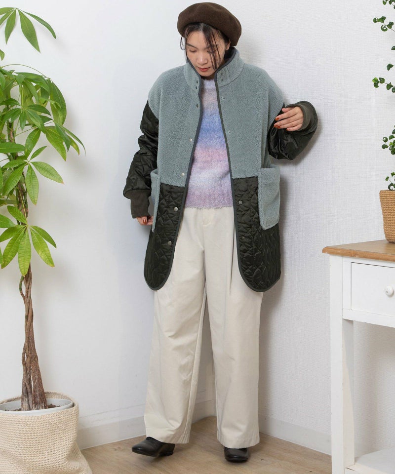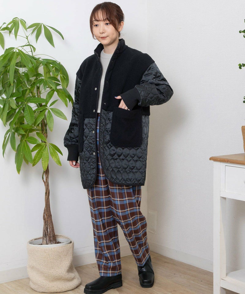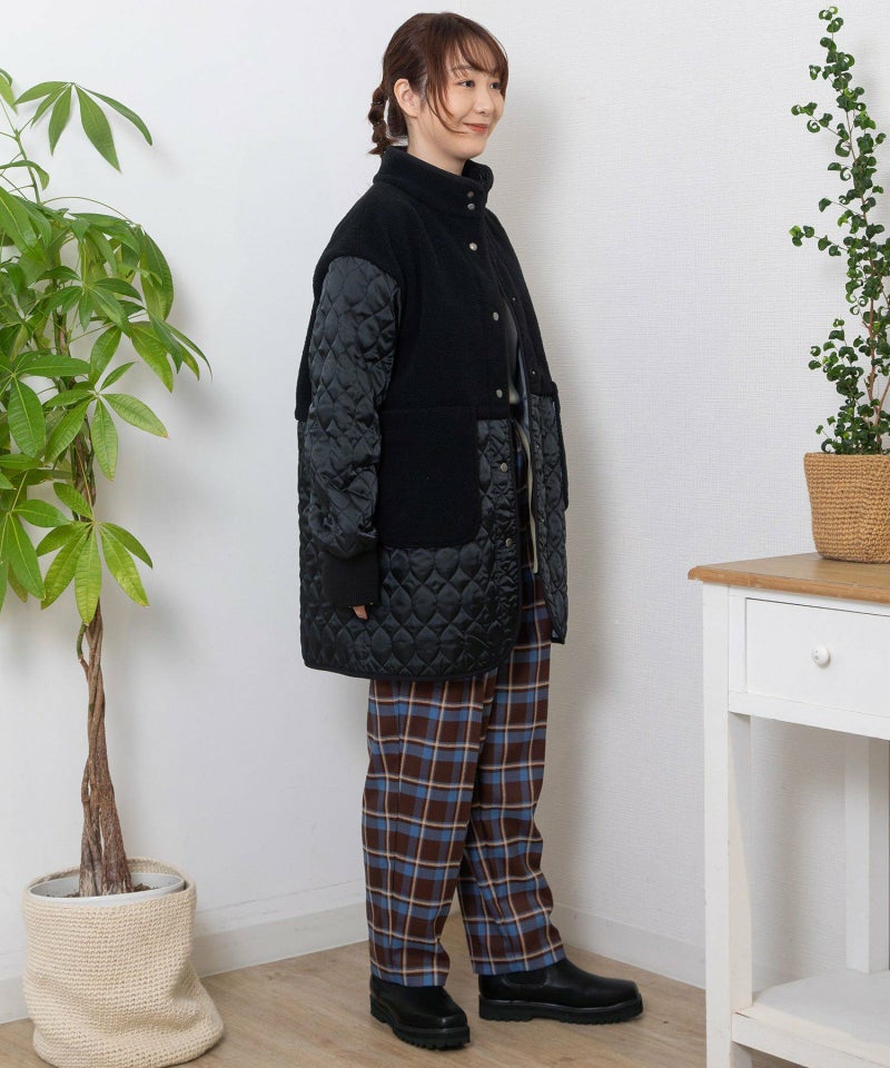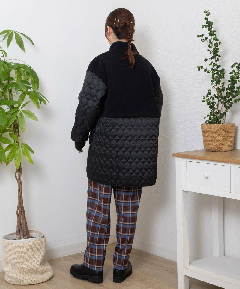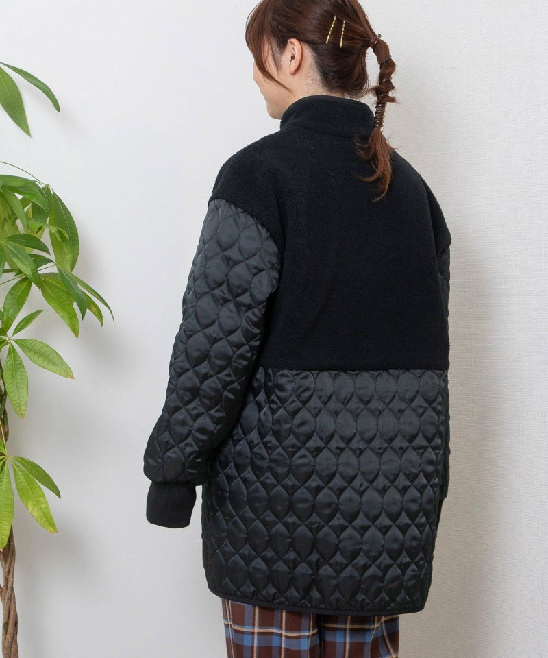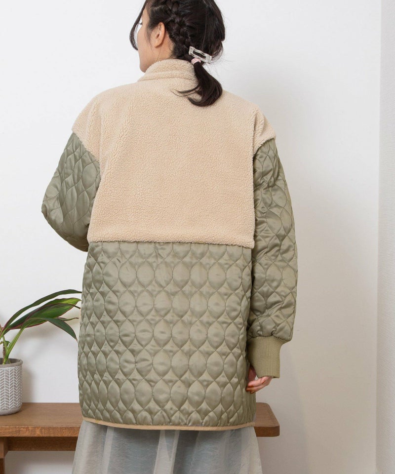 キルティングとボアを切り替えたデザインコート。キルティングはレモンのようなシルエットを並べたオリジナルのテキスタイルです。比較的軽量ながら、ゆったりとしたサイズ感と腰下にかかる丈感であたたかく着られます。袖口のリブを長めに取り、指穴を開けているので自転車を乗る方にもおすすめです。