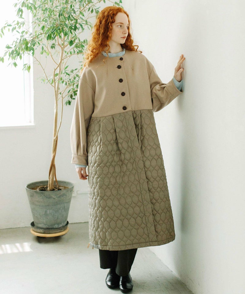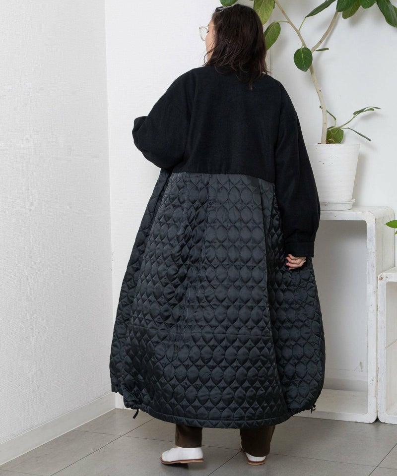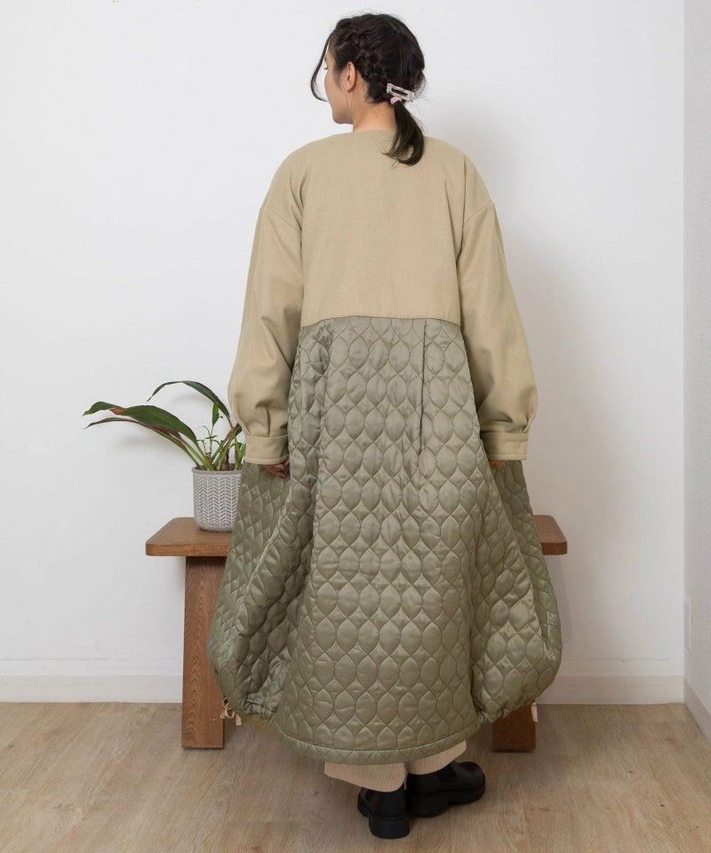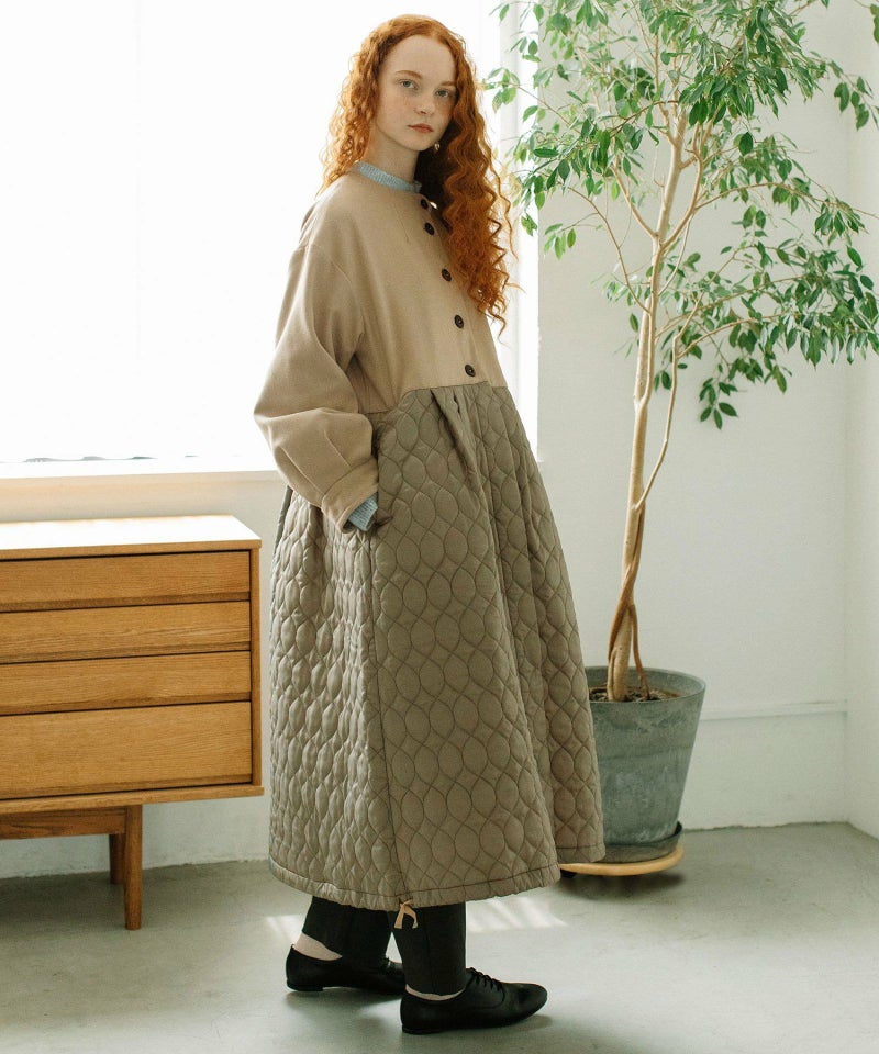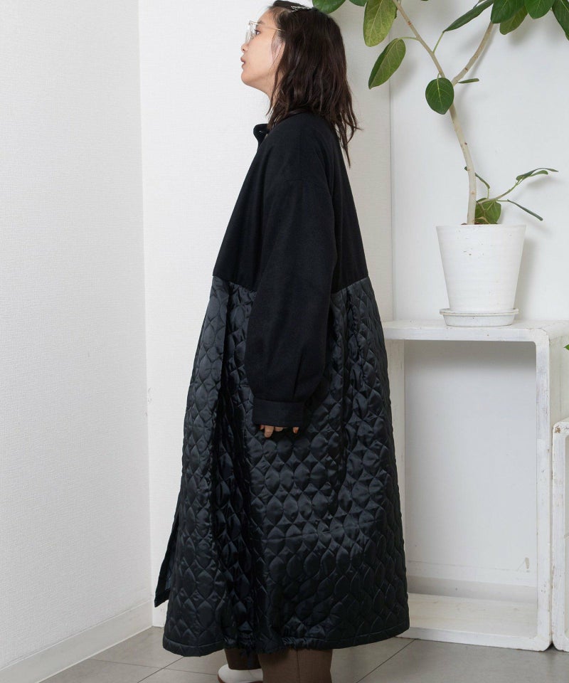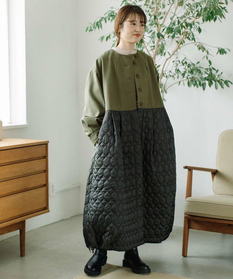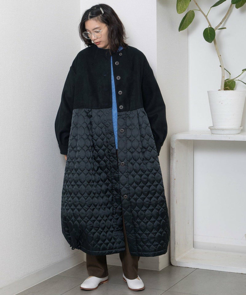 たっぷりとしたボリューム感を楽しめるワンピースのようなコート。ウール見えする上身頃にキルティングを切り替えた異素材使いが印象的。キルティングはレモンのようなシルエットを並べたオリジナルのテキスタイルです。タックをとってぷっくりさせた袖口はアームカバーと合わせると旬なスタイリングに。裾脇の紐を縛れば丸みのあるシルエットを楽しむことができます。両サイドポケット付き。