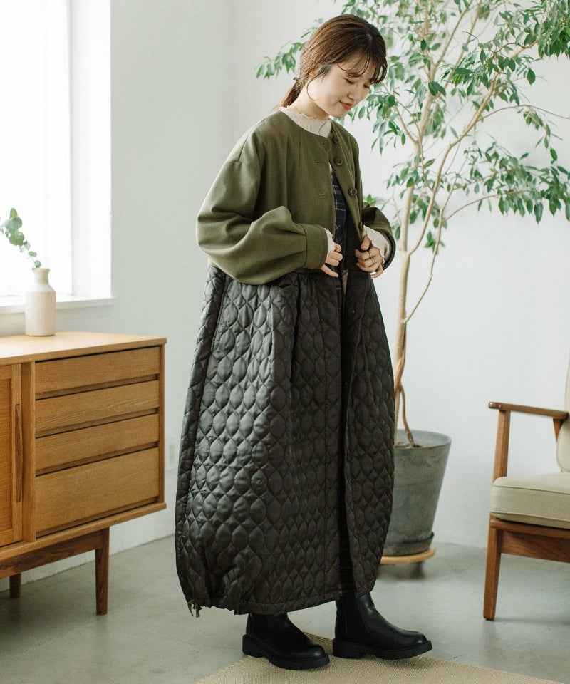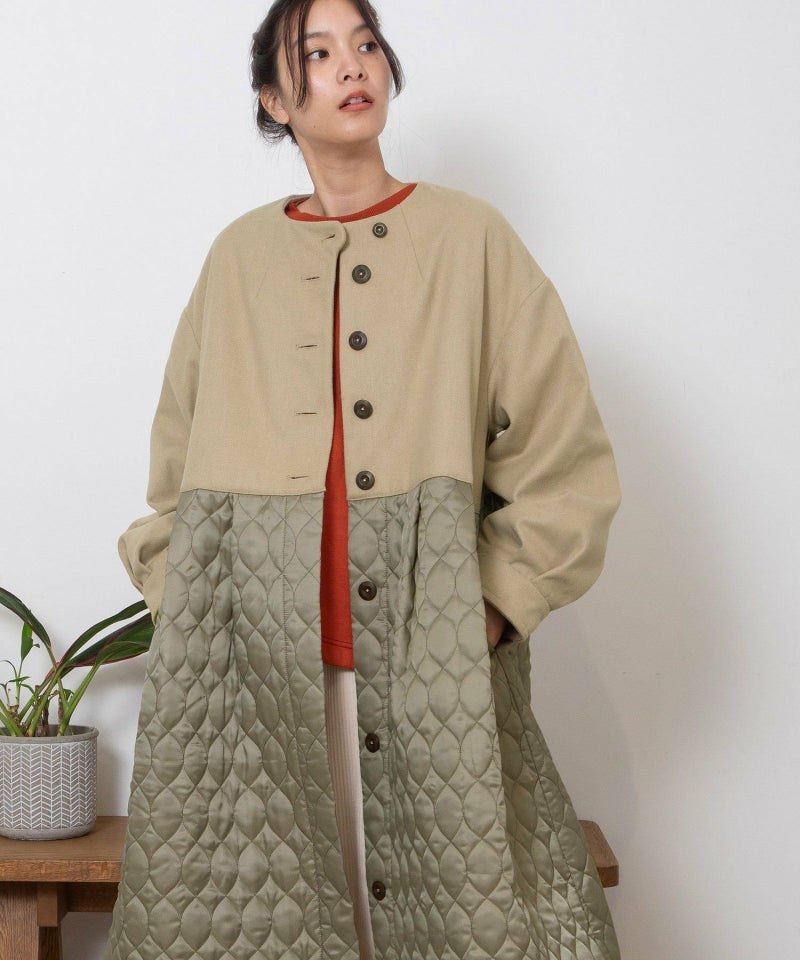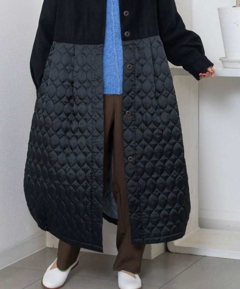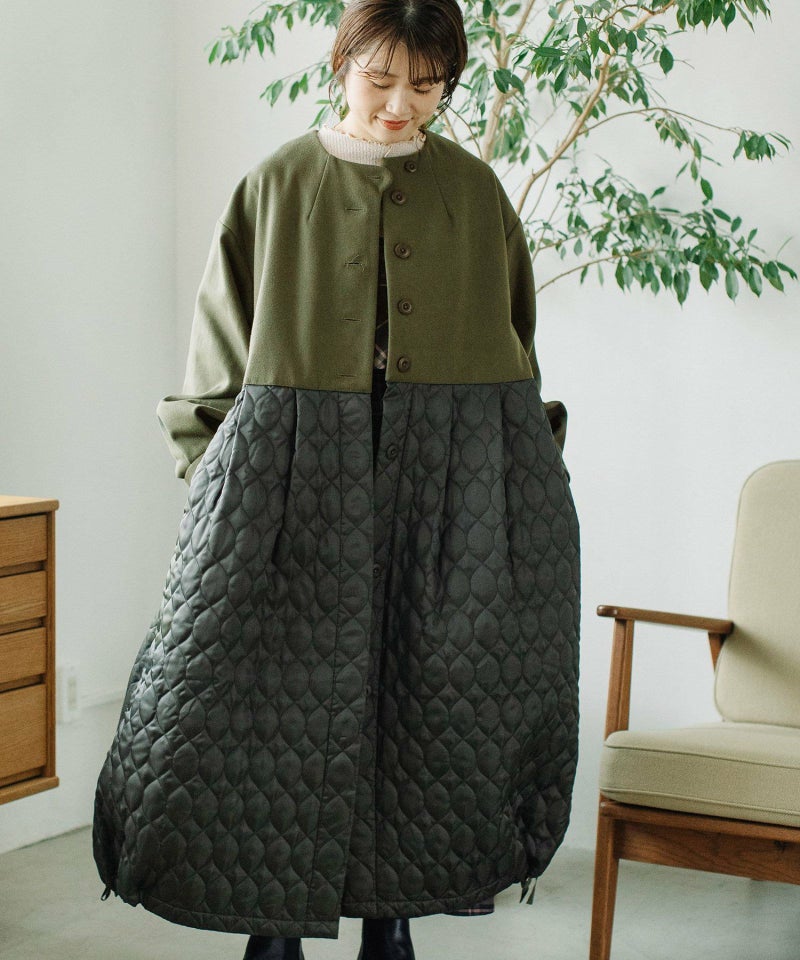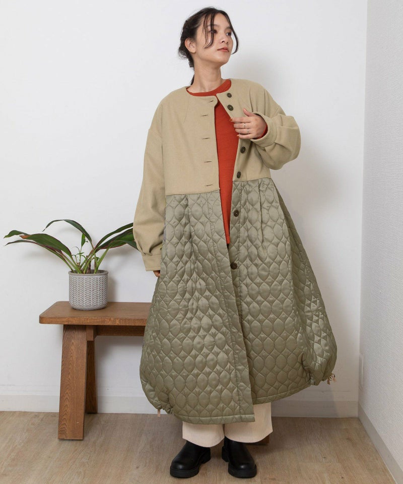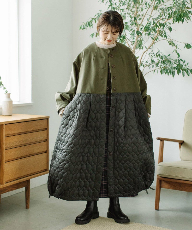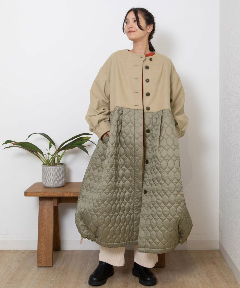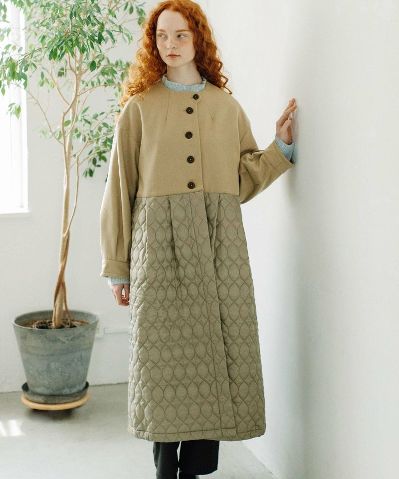 たっぷりとしたボリューム感を楽しめるワンピースのようなコート。ウール見えする上身頃にキルティングを切り替えた異素材使いが印象的。キルティングはレモンのようなシルエットを並べたオリジナルのテキスタイルです。タックをとってぷっくりさせた袖口はアームカバーと合わせると旬なスタイリングに。裾脇の紐を縛れば丸みのあるシルエットを楽しむことができます。両サイドポケット付き。