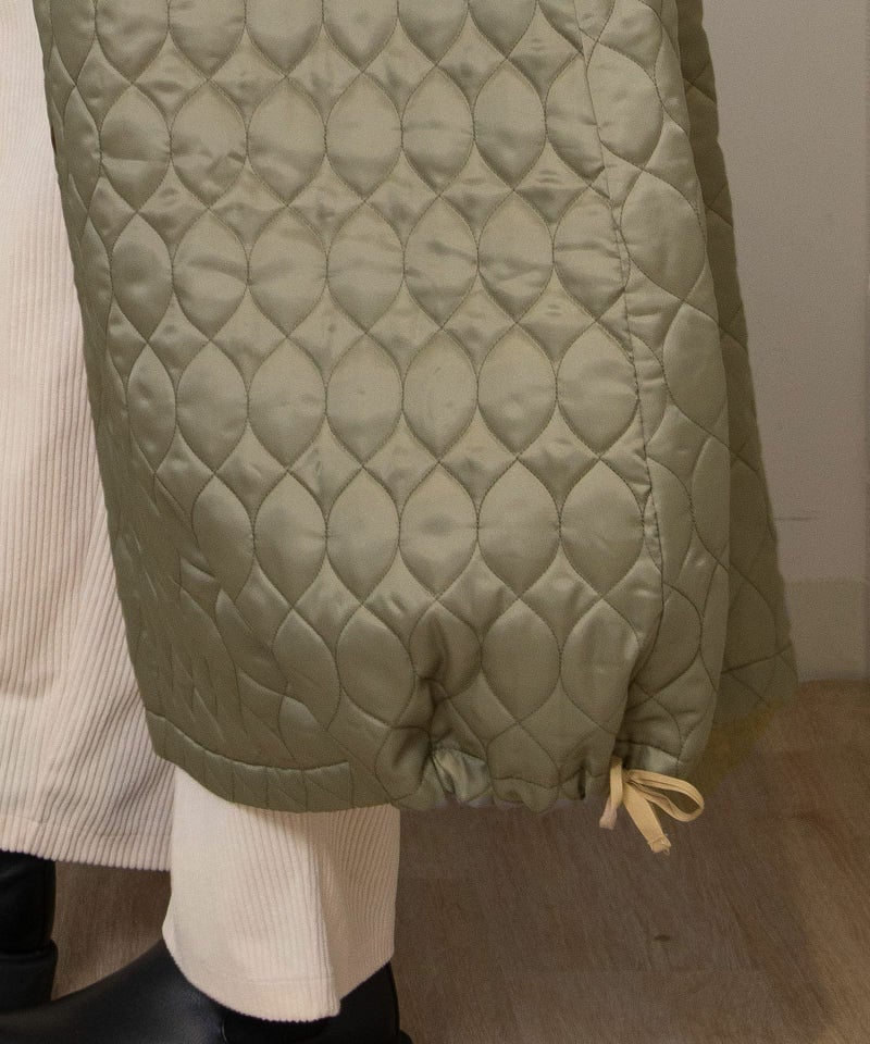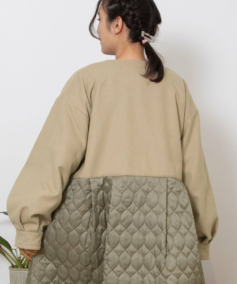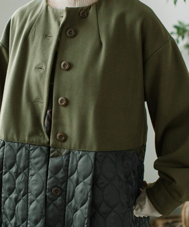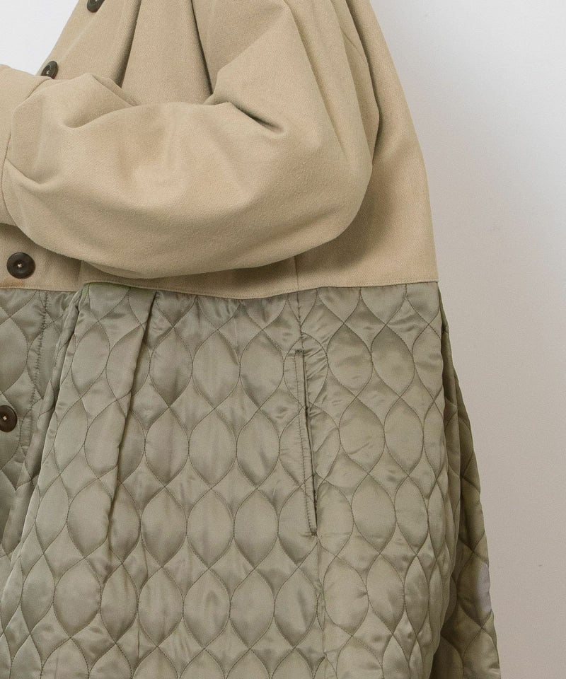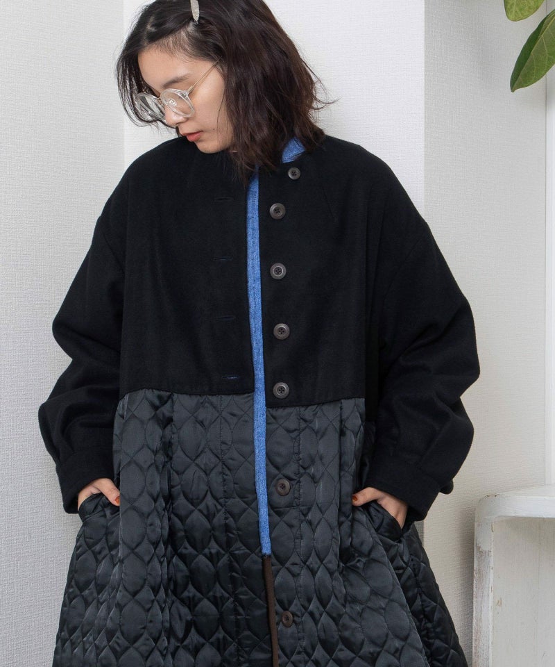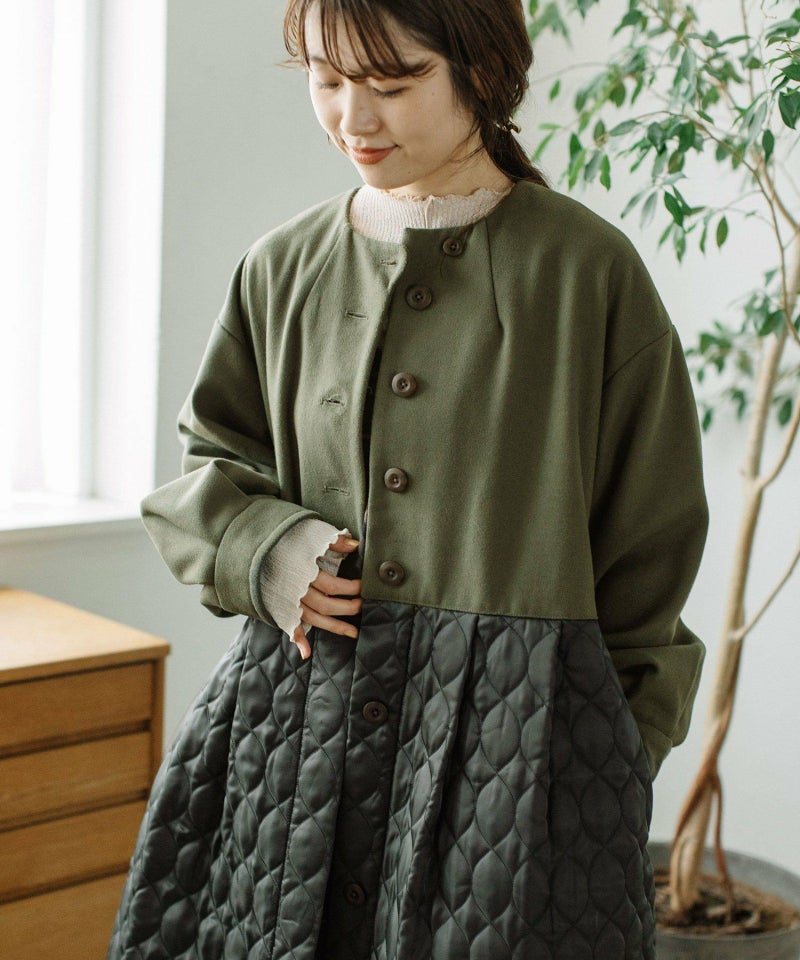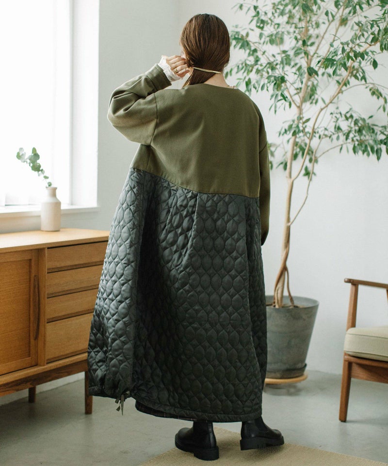 たっぷりとしたボリューム感を楽しめるワンピースのようなコート。ウール見えする上身頃にキルティングを切り替えた異素材使いが印象的。キルティングはレモンのようなシルエットを並べたオリジナルのテキスタイルです。タックをとってぷっくりさせた袖口はアームカバーと合わせると旬なスタイリングに。裾脇の紐を縛れば丸みのあるシルエットを楽しむことができます。両サイドポケット付き。
