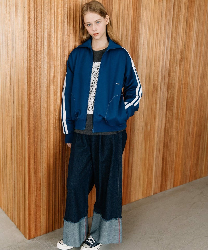 羽織るだけでトレンド感のあるコーデを楽しめるトラックジャケット。配色の2本ラインが効いていて着映えします。肩を落とし身巾にゆとりを持たせて、ラフに羽織れるサイズ感にしました。伸縮性のあるジャージー素材も着やすいポイント。ストリートスタイルや古着ミックスコーデにもおすすめなアイテム。ファスナーを上まで閉めれば首周りも暖かく、秋冬から春先のコートのインナー使いもしやすいです。左胸にpdd (pou dou dou)ロゴのワンポイント刺繍を入れました。両サイドにポケット付き。