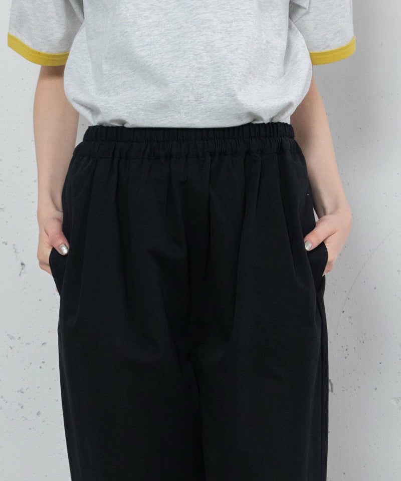左右2本ずつタックを取った丸みのあるシルエットのパンツ。オールシーズン着まわせる程よい厚さのコットンツイルとデニム生地で仕立てました。ヒップ周りにゆとりを持たせつつ、裾はダーツを取ってすっきりとさせています。ウエストはぐるりゴム仕様。紐付きでサイズ感の調節が可能です。シンプルなデザインで着回し力も高く、デイリーユースにぴったりです。両サイドポケット付き。デニム素材は配色ステッチでカジュアルに仕上げています。