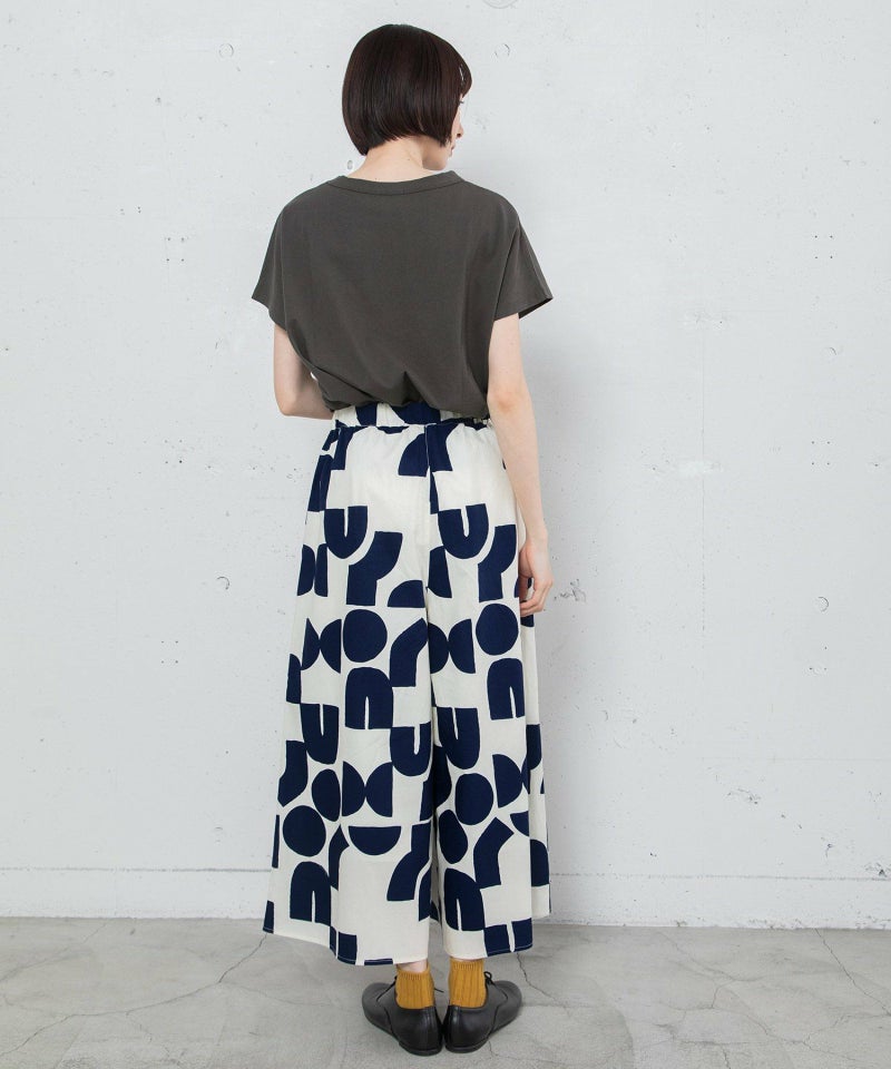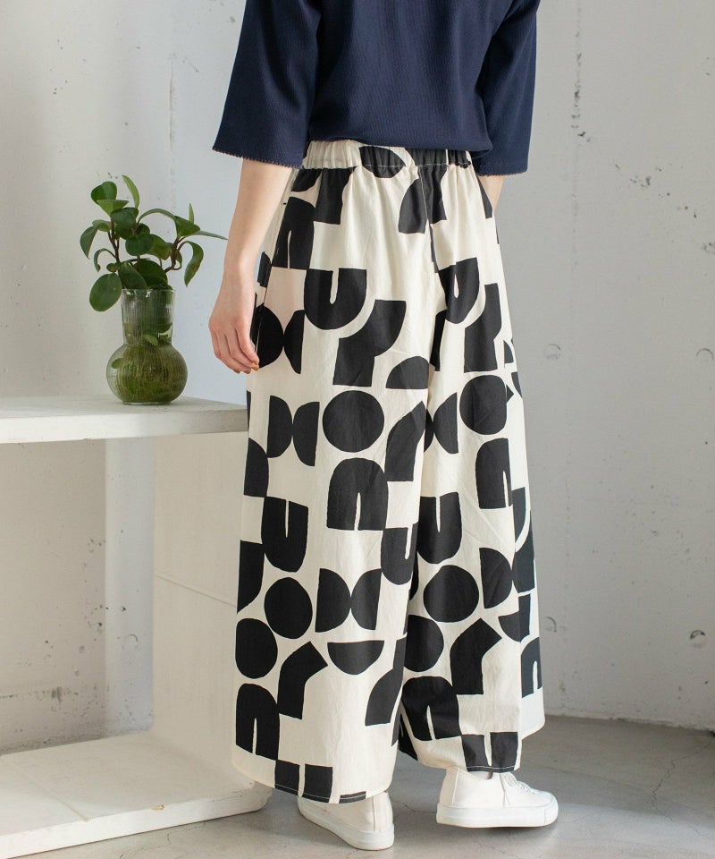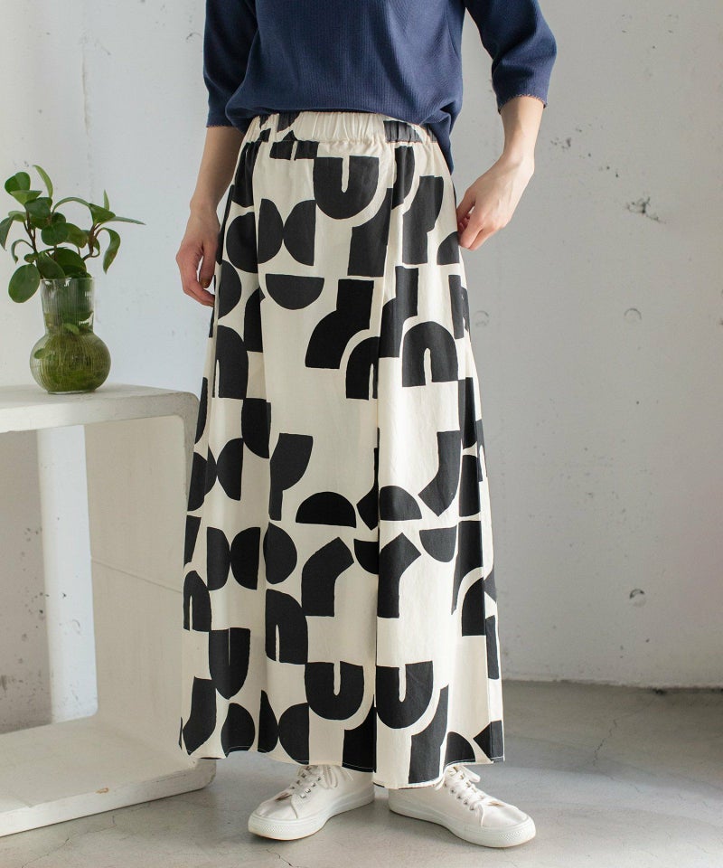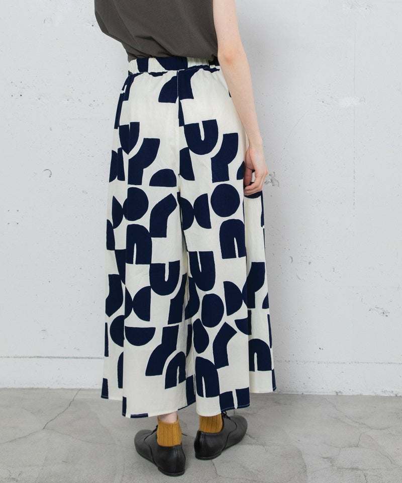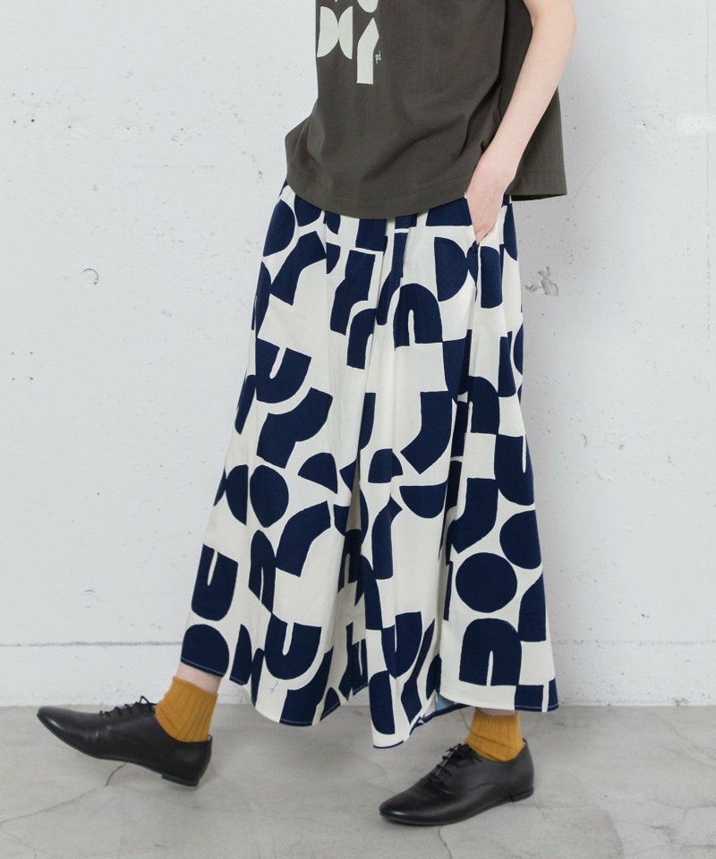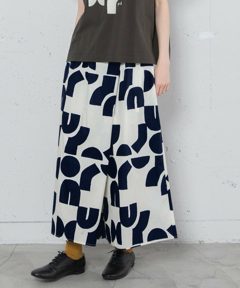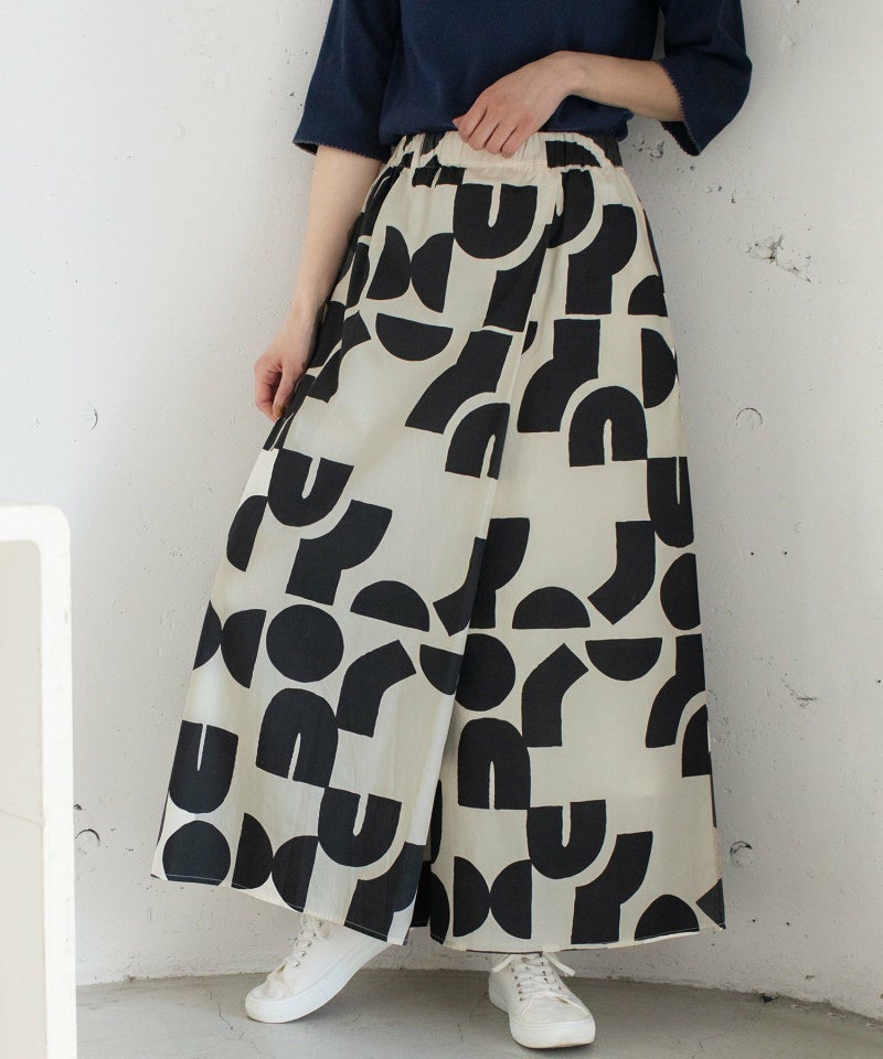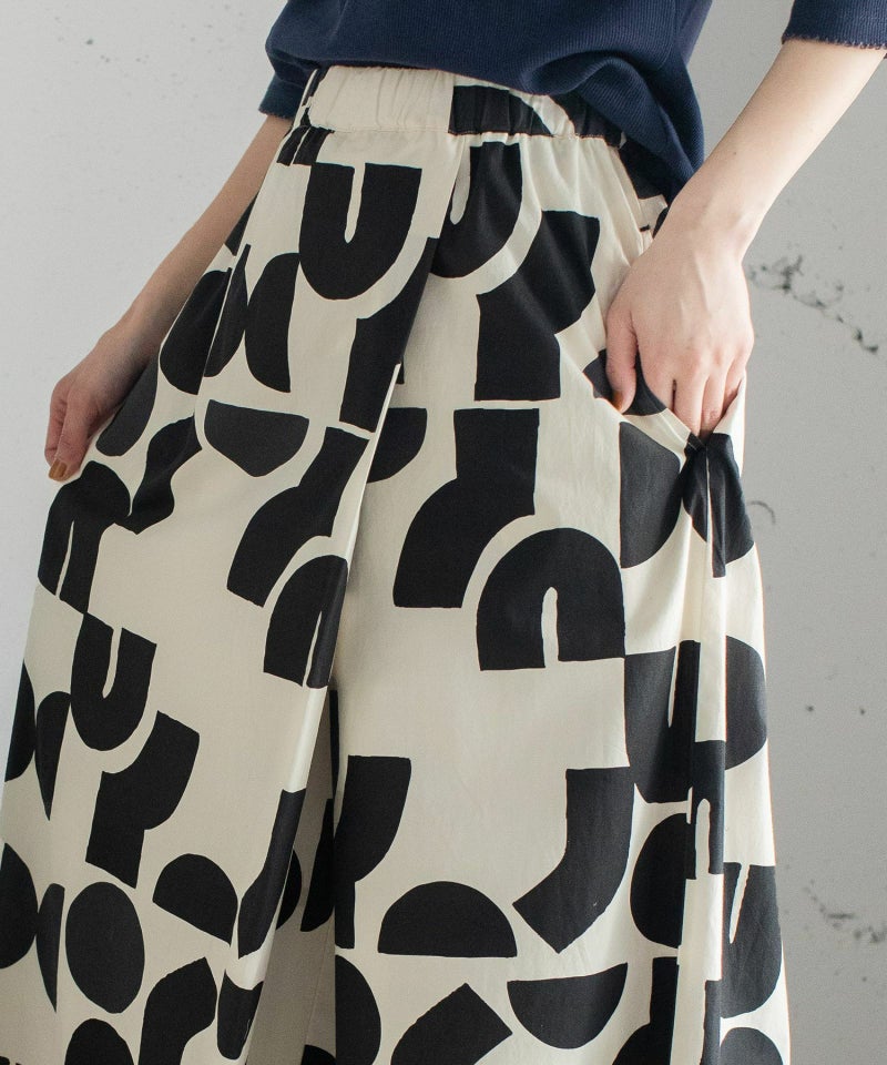 ポスターアートのような手描きの幾何学柄をちりばめたオリジナルのテキスタイル。スカートのようにも見えるラップパンツは、程よいワイドシルエットで楽に履いていただけます。目を惹く柄なのでシンプルなトップス合わせも着映えします。ウエストはゴム仕様、内紐でサイズ感の調節も可能です。両サイドポケット付き。