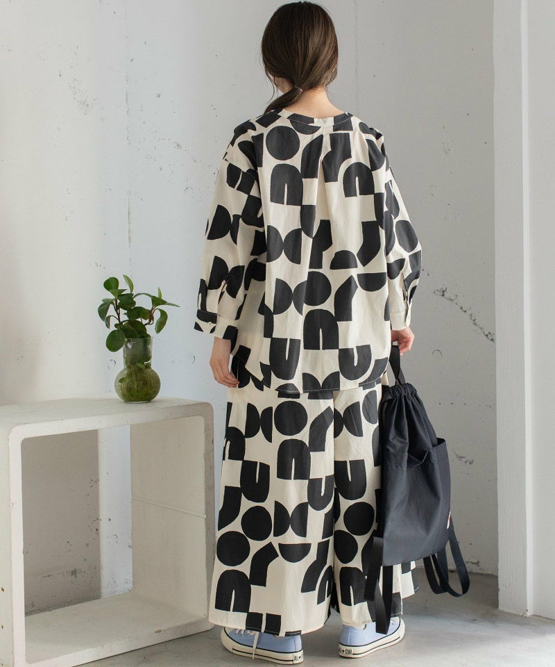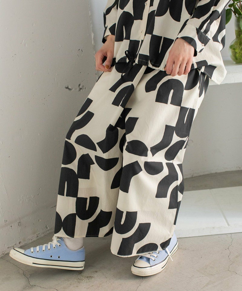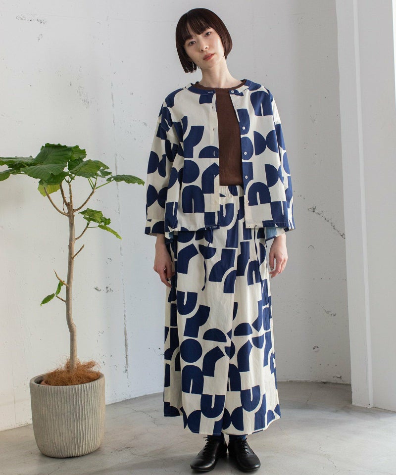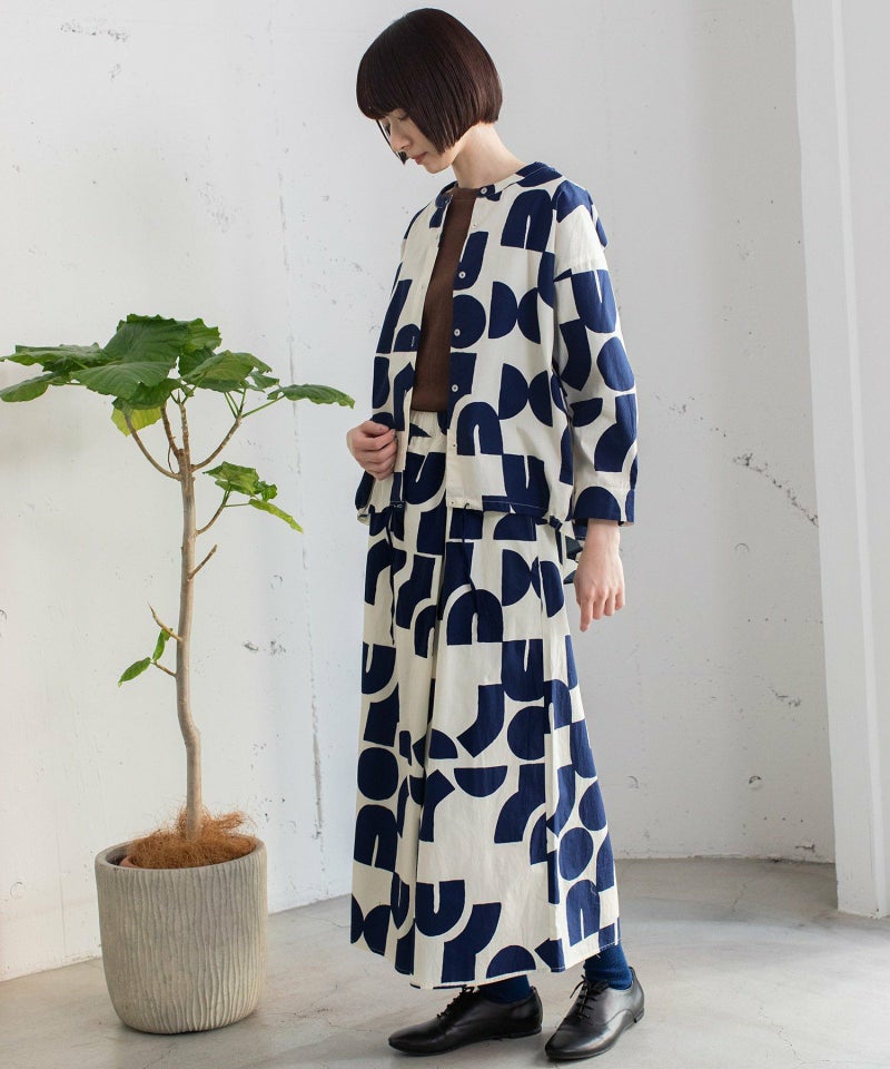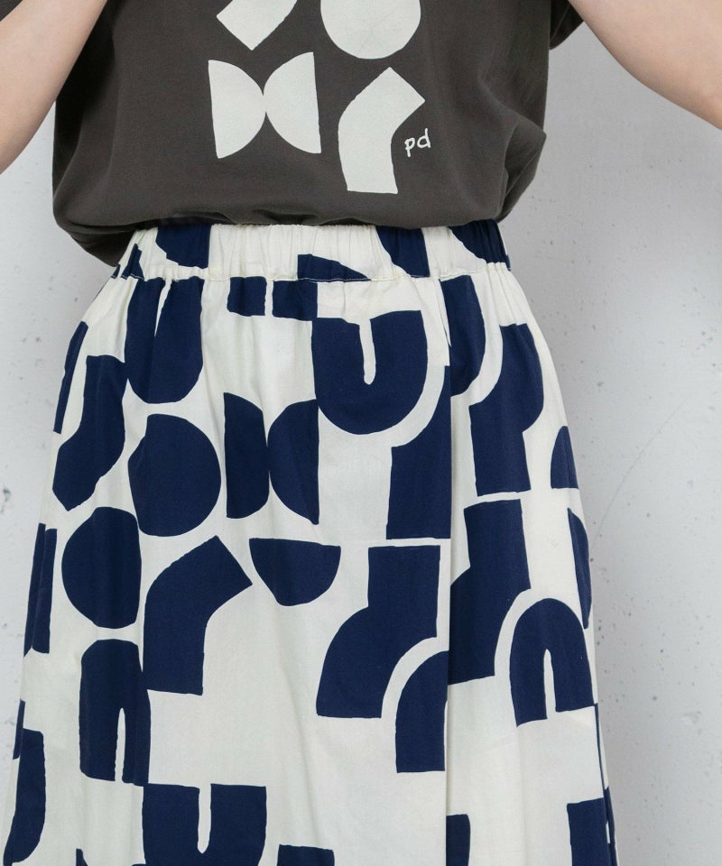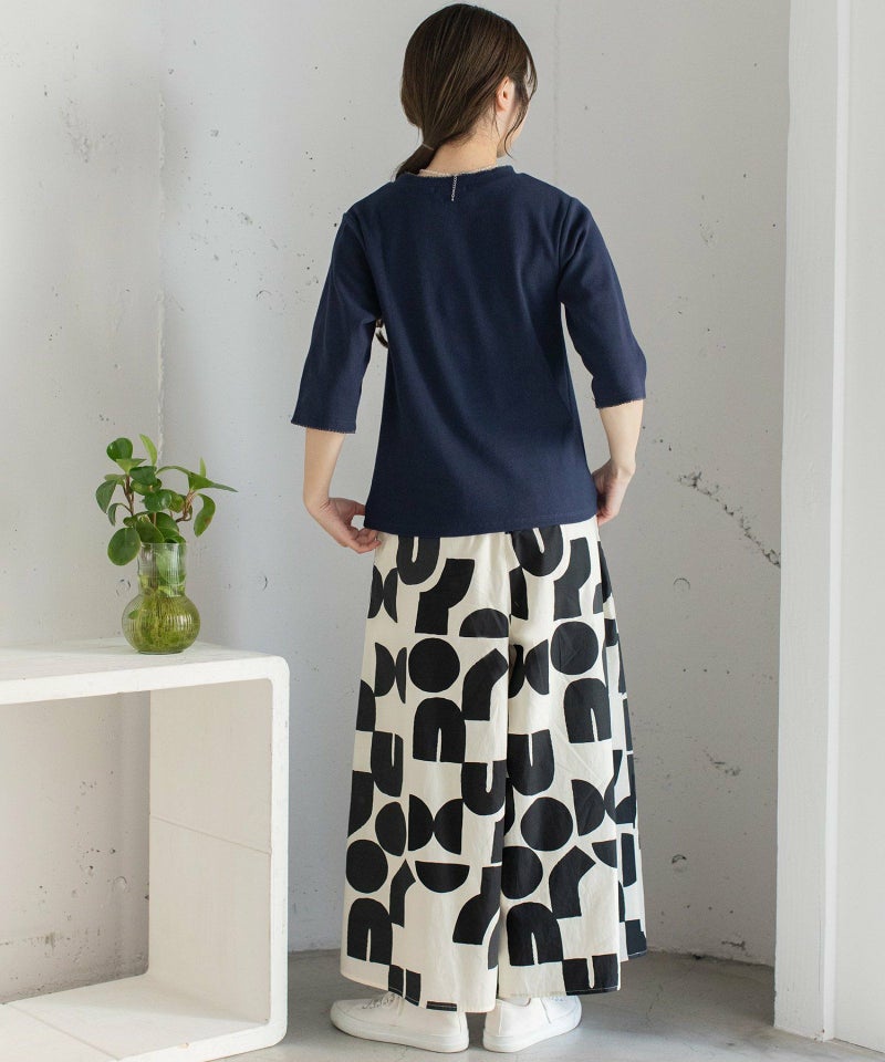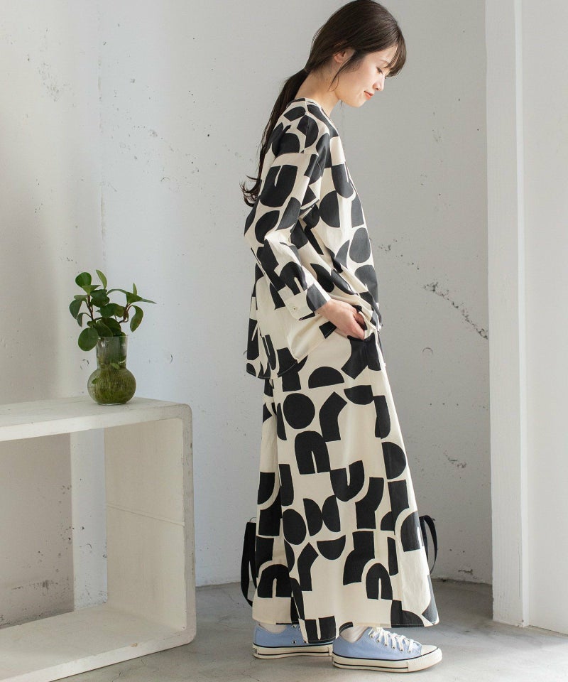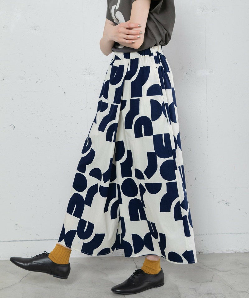 ポスターアートのような手描きの幾何学柄をちりばめたオリジナルのテキスタイル。スカートのようにも見えるラップパンツは、程よいワイドシルエットで楽に履いていただけます。目を惹く柄なのでシンプルなトップス合わせも着映えします。ウエストはゴム仕様、内紐でサイズ感の調節も可能です。両サイドポケット付き。