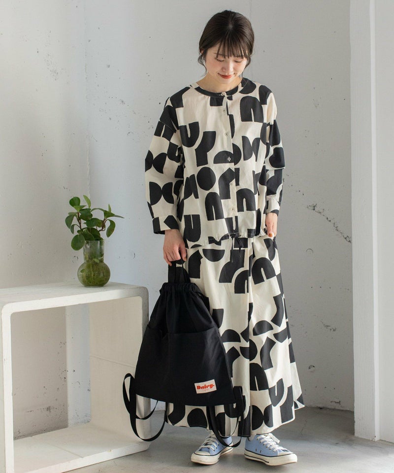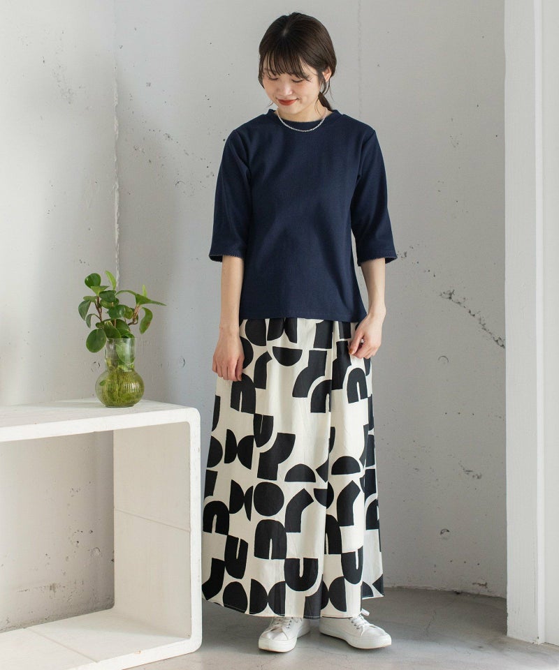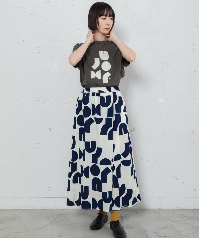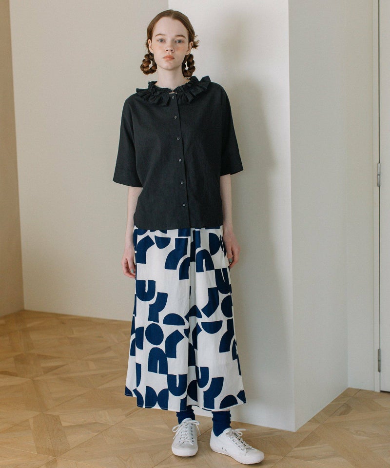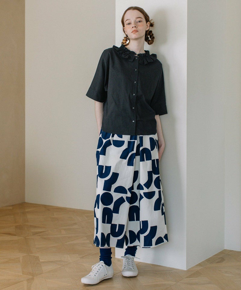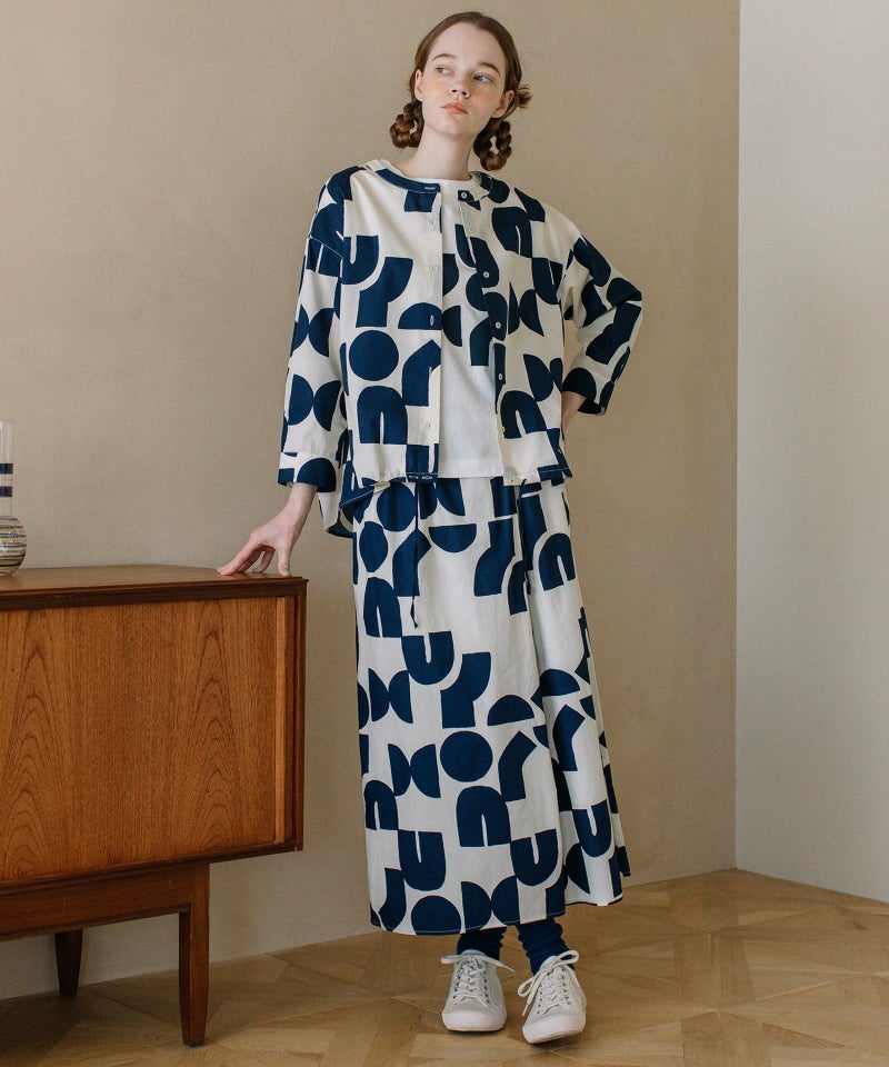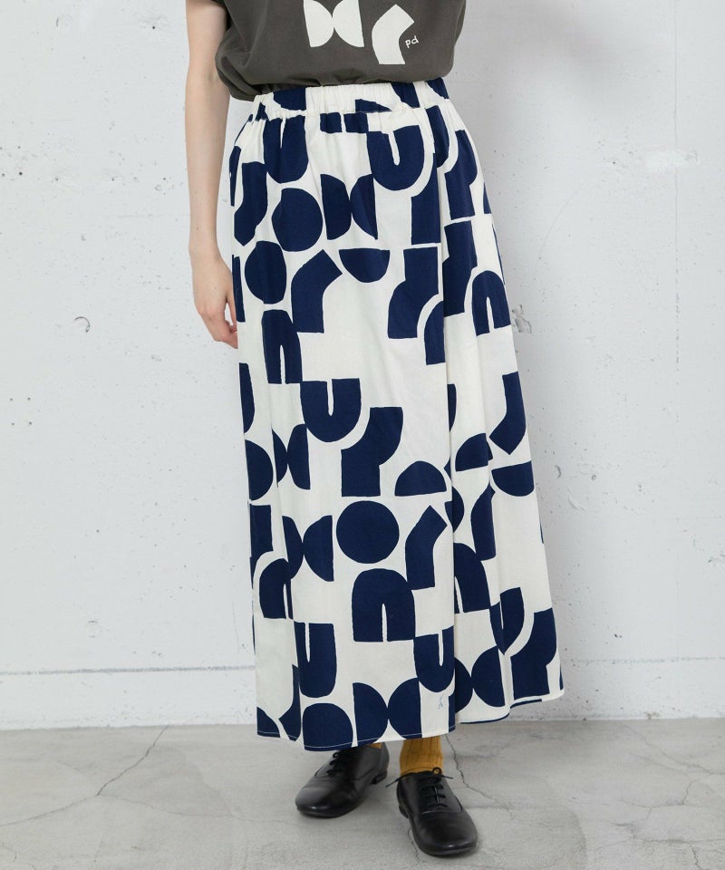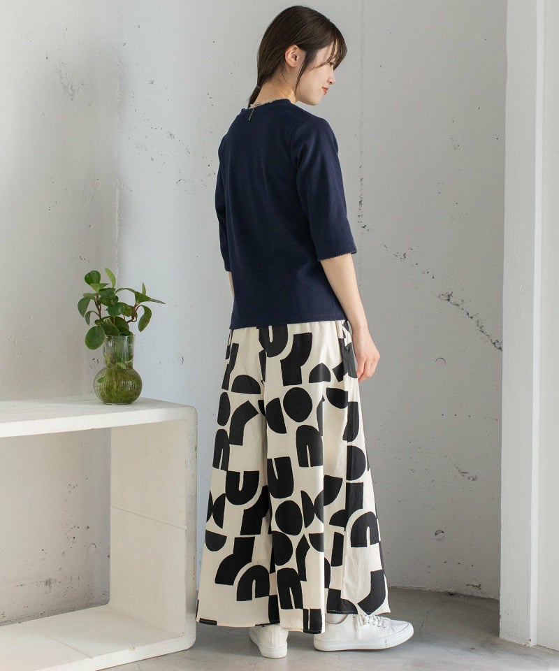 ポスターアートのような手描きの幾何学柄をちりばめたオリジナルのテキスタイル。スカートのようにも見えるラップパンツは、程よいワイドシルエットで楽に履いていただけます。目を惹く柄なのでシンプルなトップス合わせも着映えします。ウエストはゴム仕様、内紐でサイズ感の調節も可能です。両サイドポケット付き。