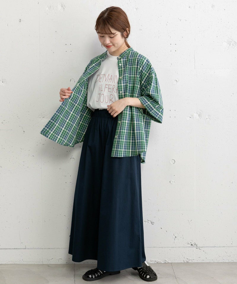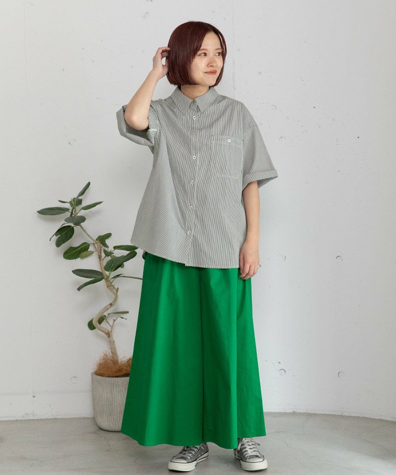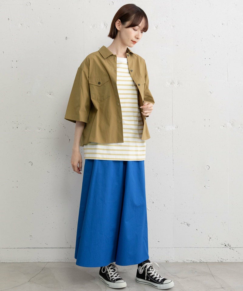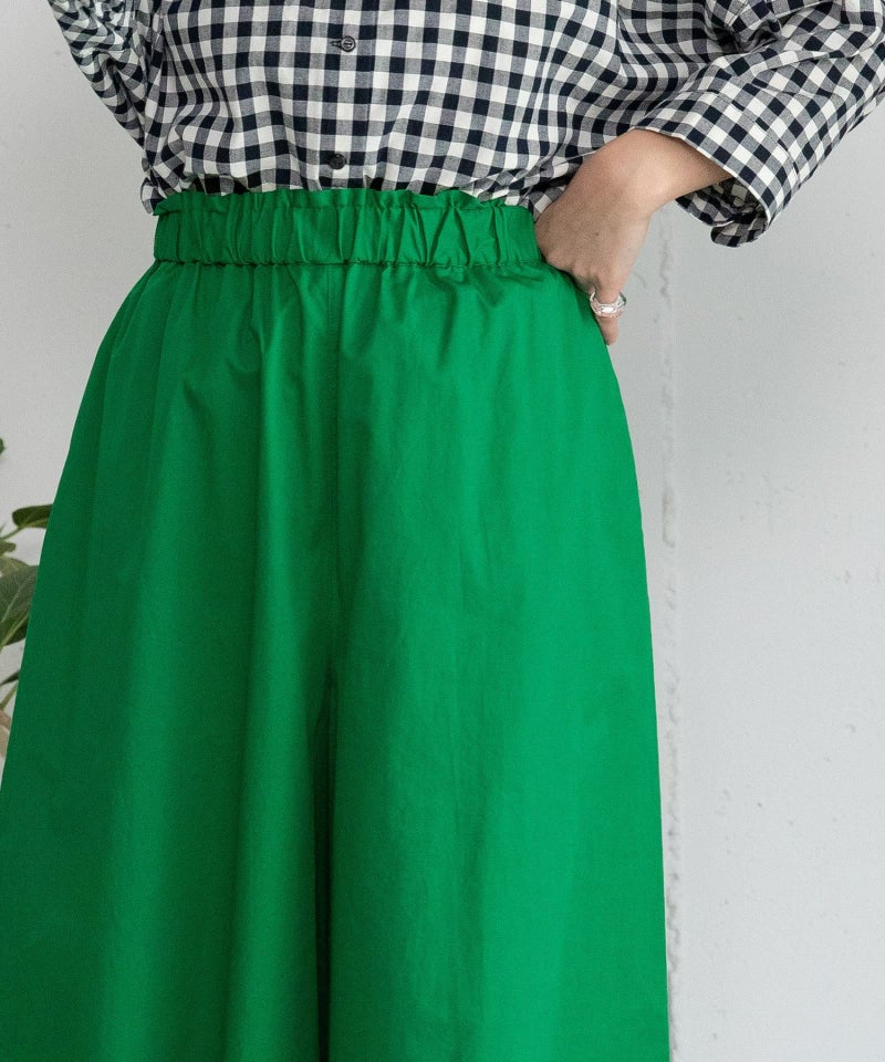スカート見えするフレアシルエットでカジュアルながら上品な印象に仕上げたキュロット。グリーンとブルーは夏にぴったりの鮮やかカラーで着こなしのポイントになります。ロングシーズン着回せるのも嬉しい張りのあるコットン素材。ウエストはゴム仕様、内紐でサイズ感の調整が可能。両サイドにポケット付き。