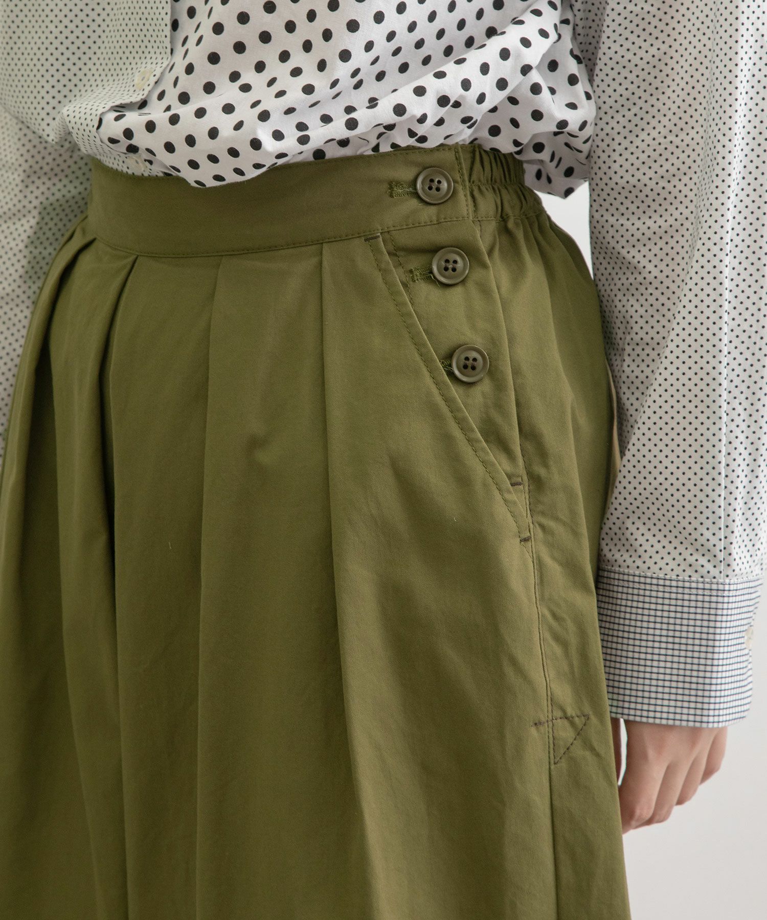 ・後ろのみゴムにしたことでウエスト周りはすっきりと。左脇のボタンあきもデザインのアクセント。両サイドにポケットあり。