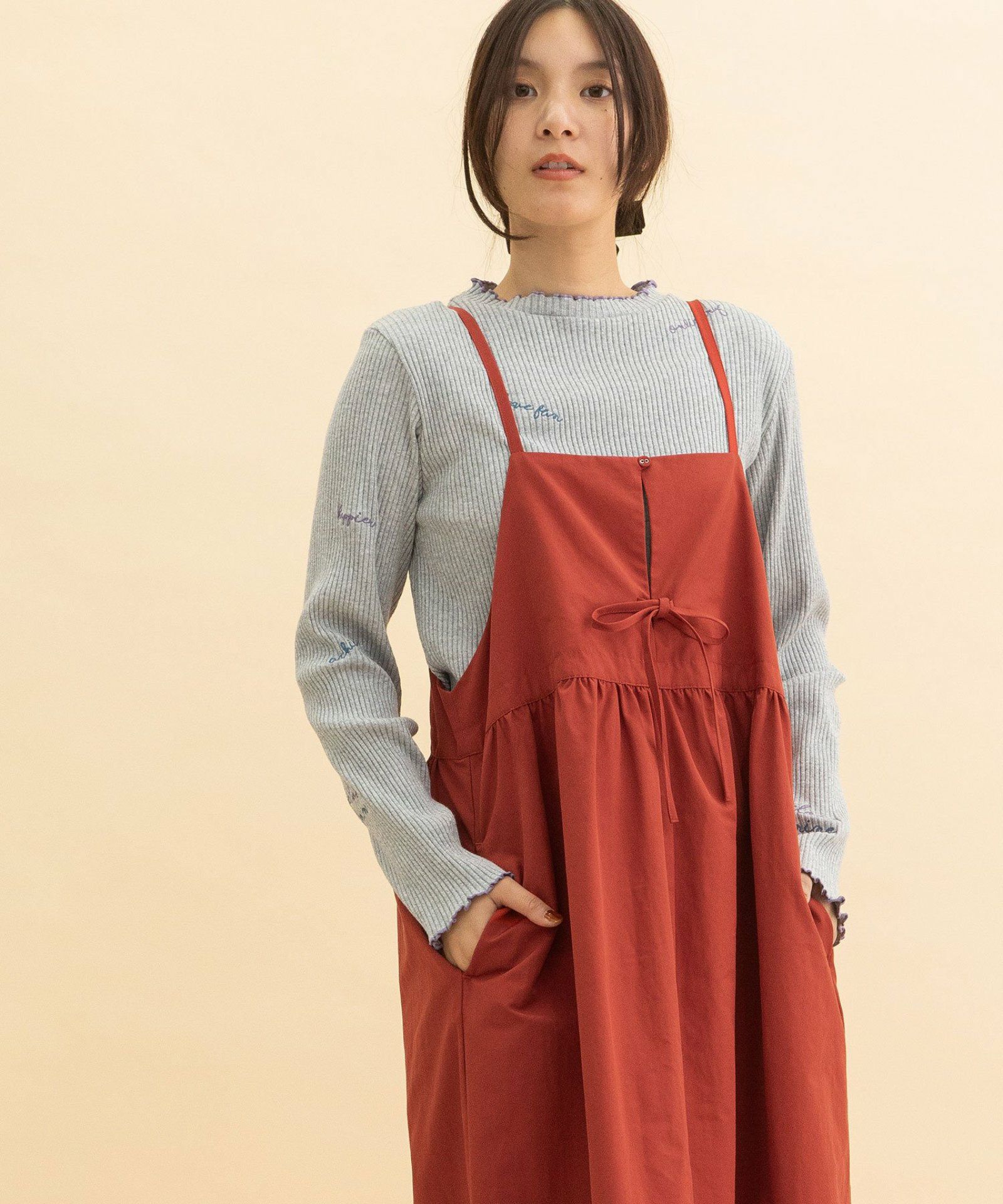 フロントリボンがアクセントのキャミワンピース。トレンド感のある肩紐細めのデザインで、フロントリボンはお好みで結んだり垂らしたりして頂けます。インナー次第で幅広く着回しができるアイテム。無地はやや張りのあるコットンナイロン素材を使用、チェックはぽこぽこした表面感の少し柔らかい素材です。アジャスターで長さの調節もできます。両サイドにポケットつき。