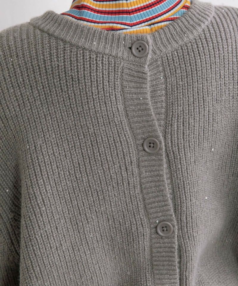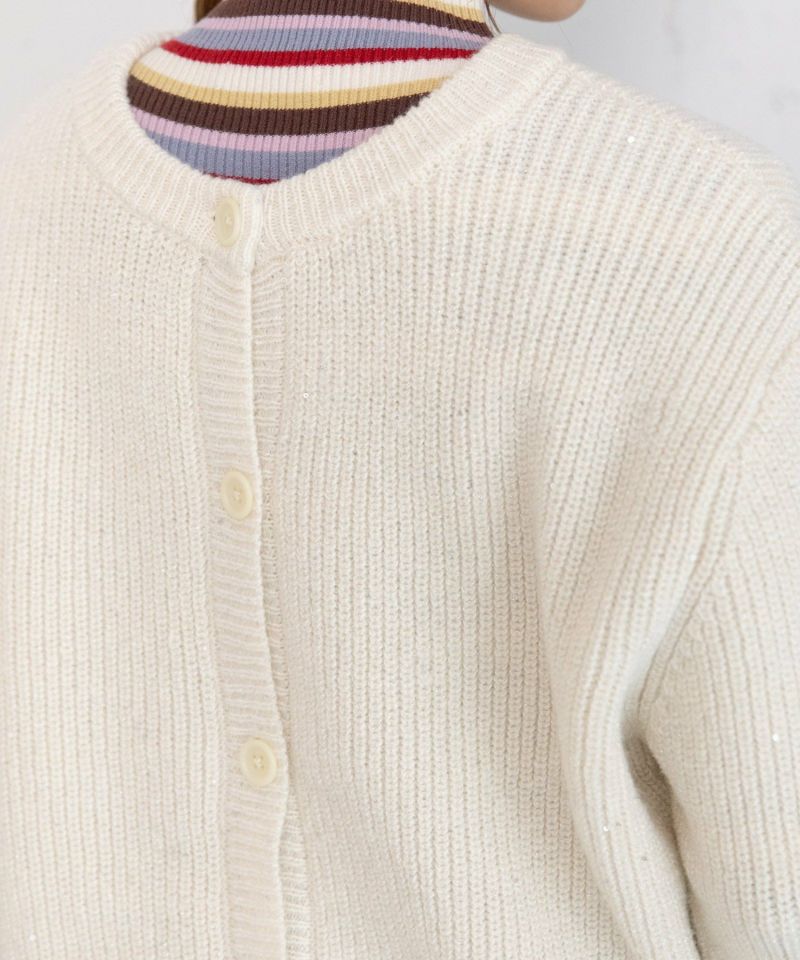 小さなスパンコールとラメ糸が織り交ぜられた、ほんのりきらめく片畦編みニット。カーディガン・プルオーバー両方で使える2way仕様。ざっくりとした片畦編みで、大人っぽくも甘さのあるデザインに仕上げました。ボトムに合わせて雰囲気を変えられる、頼れる一枚です◎