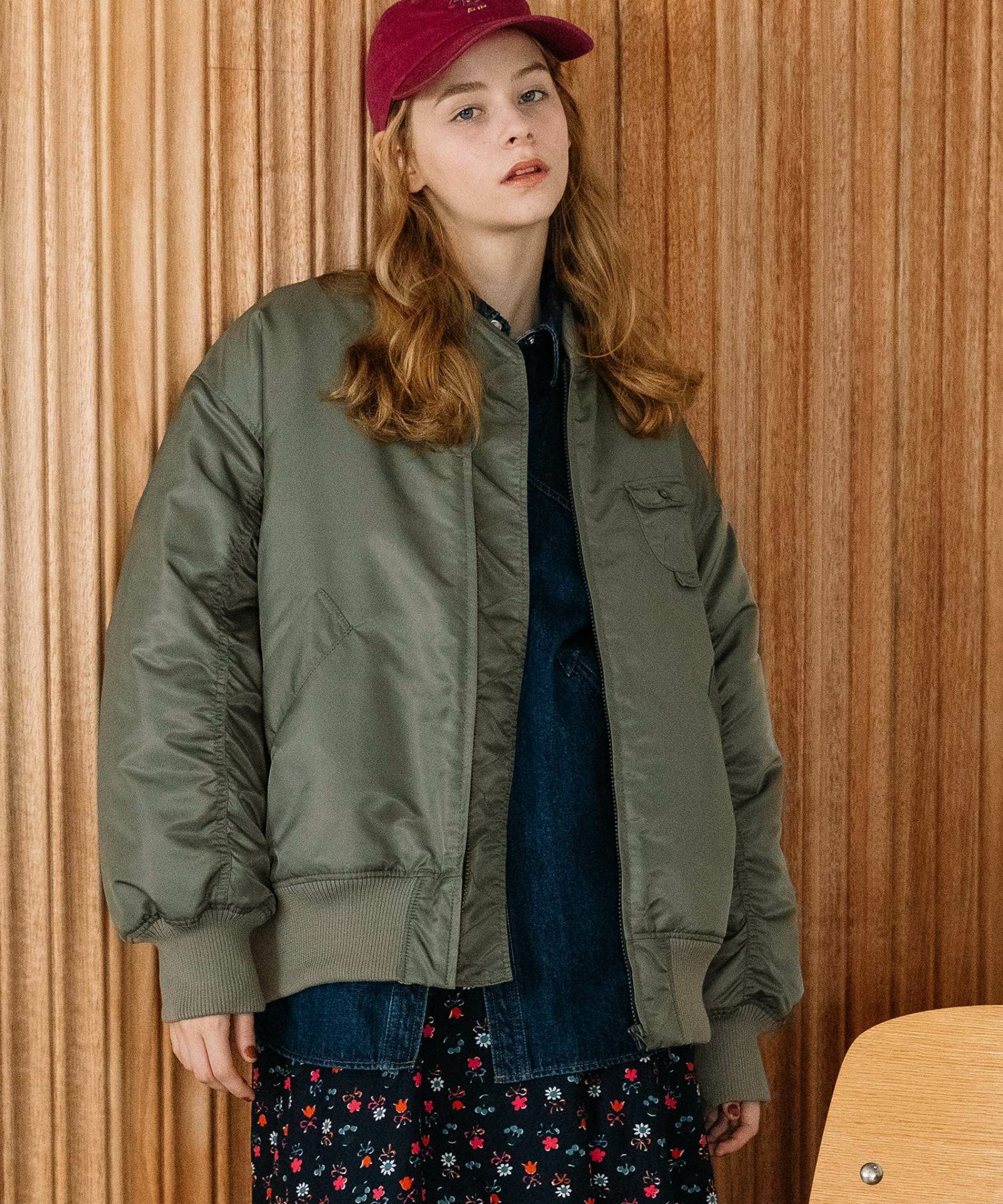 ヴィンテージのフライトジャケットを参考にしたオーバーサイズのMA-1ブルゾン。高密度に織られたツイル素材を使用しています。控え目な光沢感があり、深みのある色合いです。思いっきりカジュアルにスタイリングをするのが今の気分。少し高めにした衿や袖口のリブ切り替えが程よいフィット感。防寒性もあります。少し斜めにつけたアイコニックな立体ポケットは、下側にループをつけているので、キーチャームなどをつけられます。ポイントの配色裏地はダイヤ柄に丸いお花をプラスしたオリジナルのキルティング柄です。