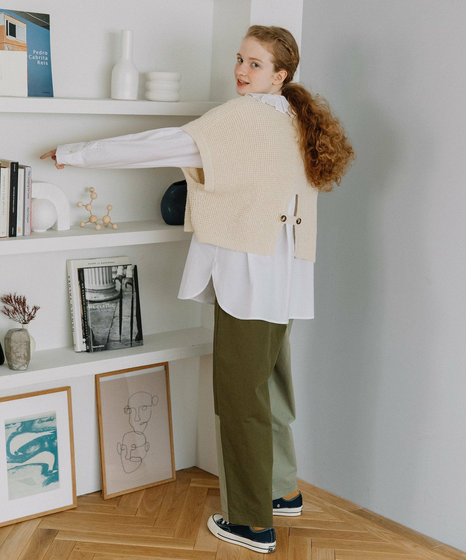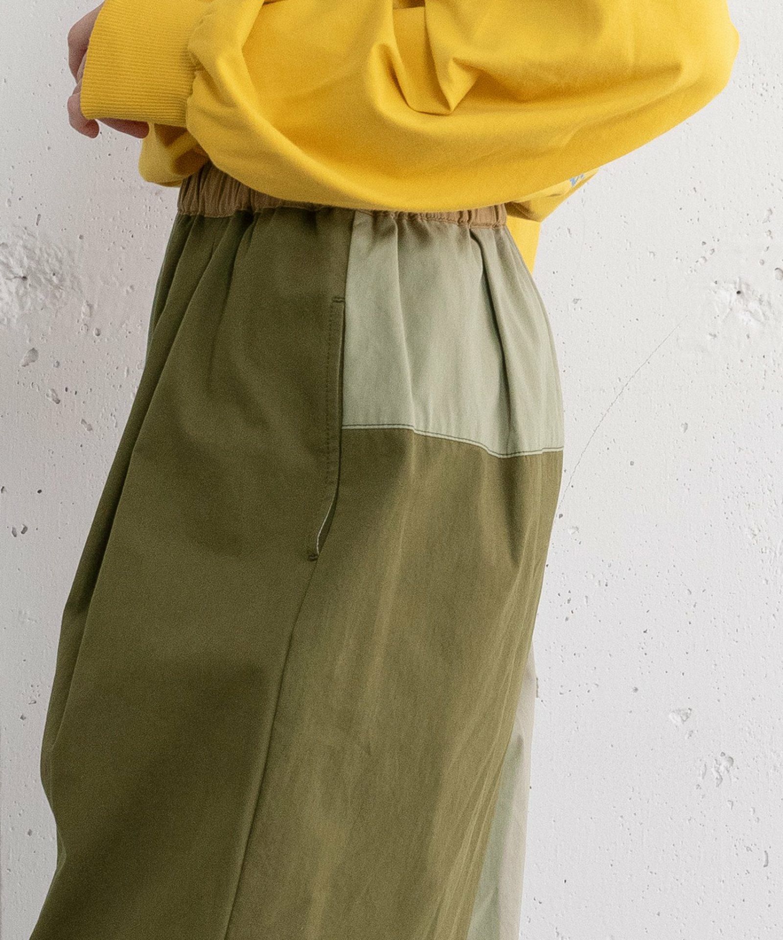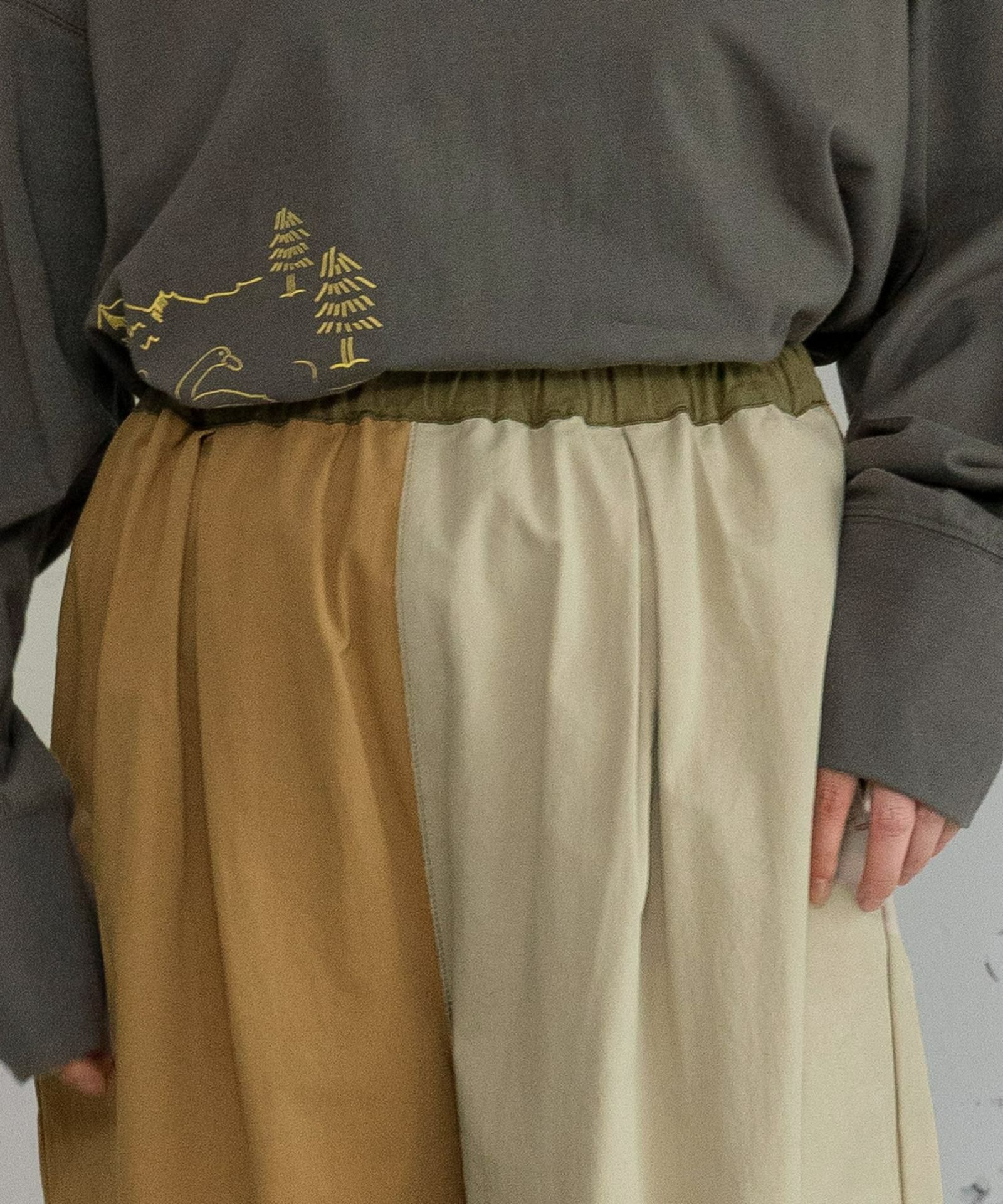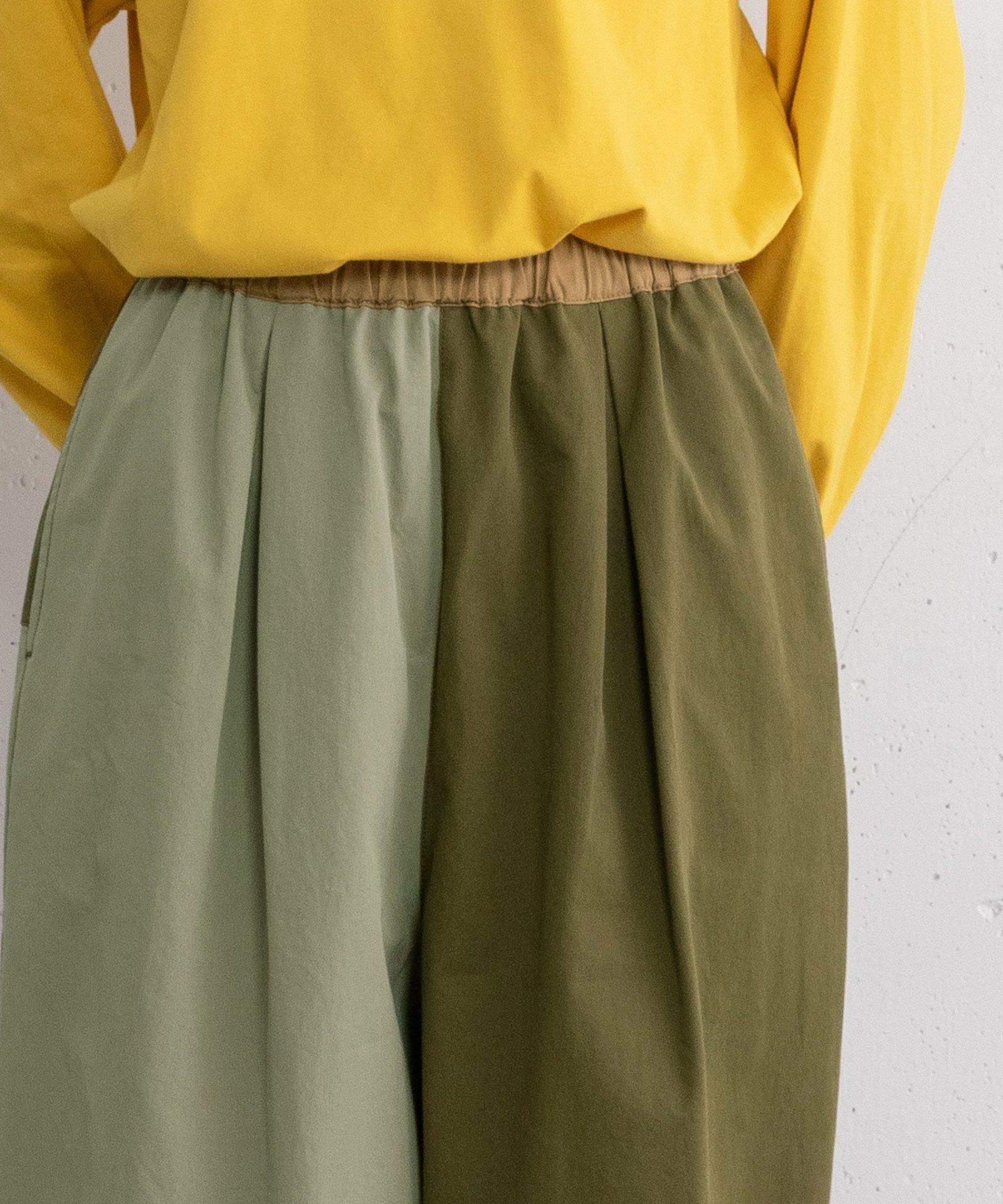 カラーブロックが目を惹くデザインパンツ。ウエストタックでヒップラインに丸みをもたせつつ、 裾にかけてやや絞ったシルエット。切り替えを入れて3色を掛け合わせた個性的な表情で、カジュアルな雰囲気も楽しめるアイテムです。ウエストはゴムのイージー仕様。両サイドにポケット付き。