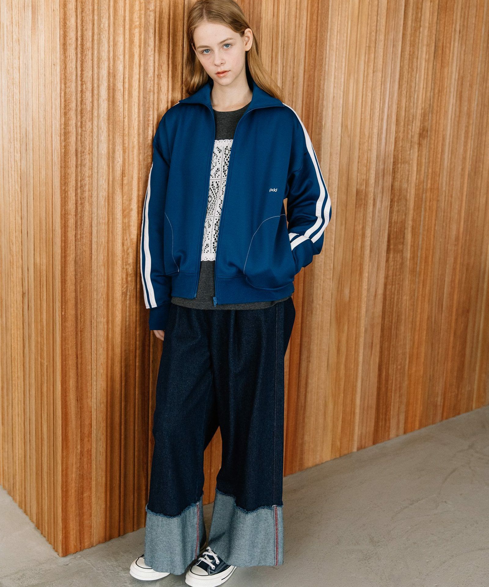 深めのロールアップデザインがコーデのポイントになるデニムパンツ。ロールアップ部分は脇のロックを配色にしてアクセントにしています。ややワイドなストレートシルエットでハイウエストで履いていただくのがおすすめ。バックゴム仕様ででリラクシーな履き心地です。両サイドにポケット付き。