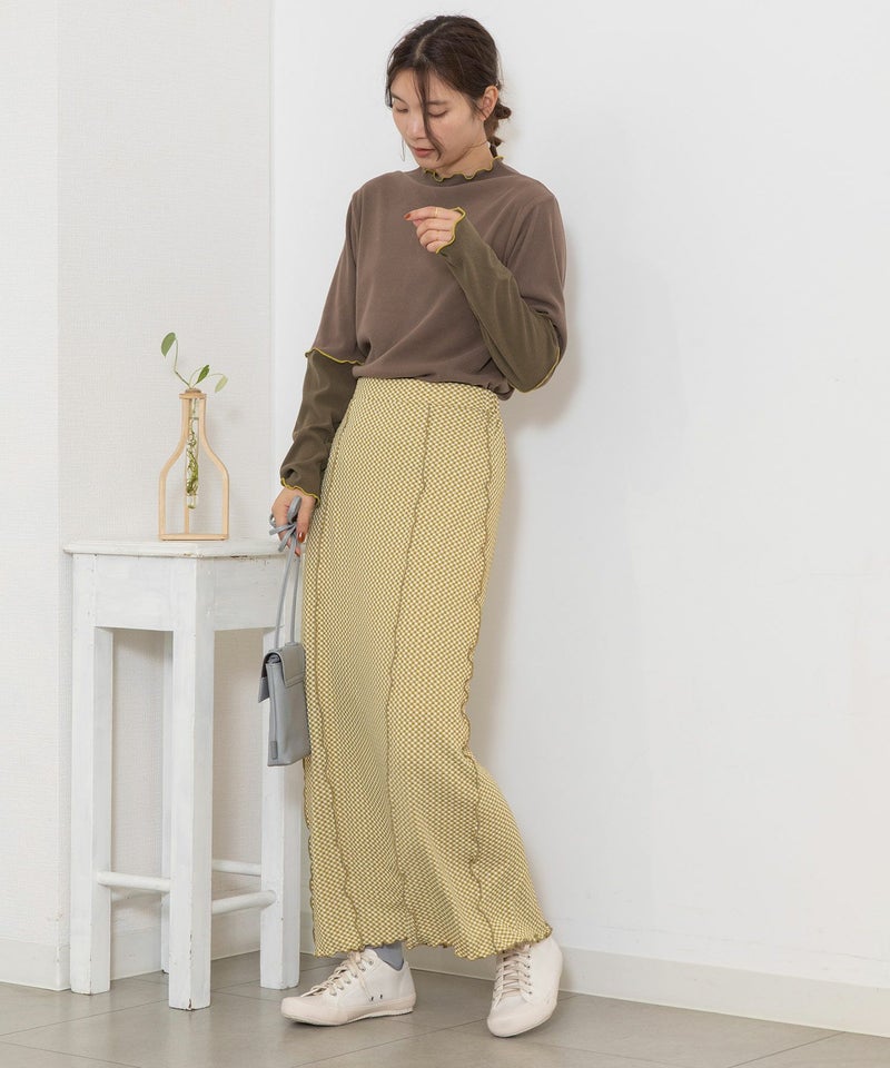 ・バイヤスチェック柄のジャカード素材をメローで切替えた、しなやかな女性らしいシルエットのIラインのスカート。