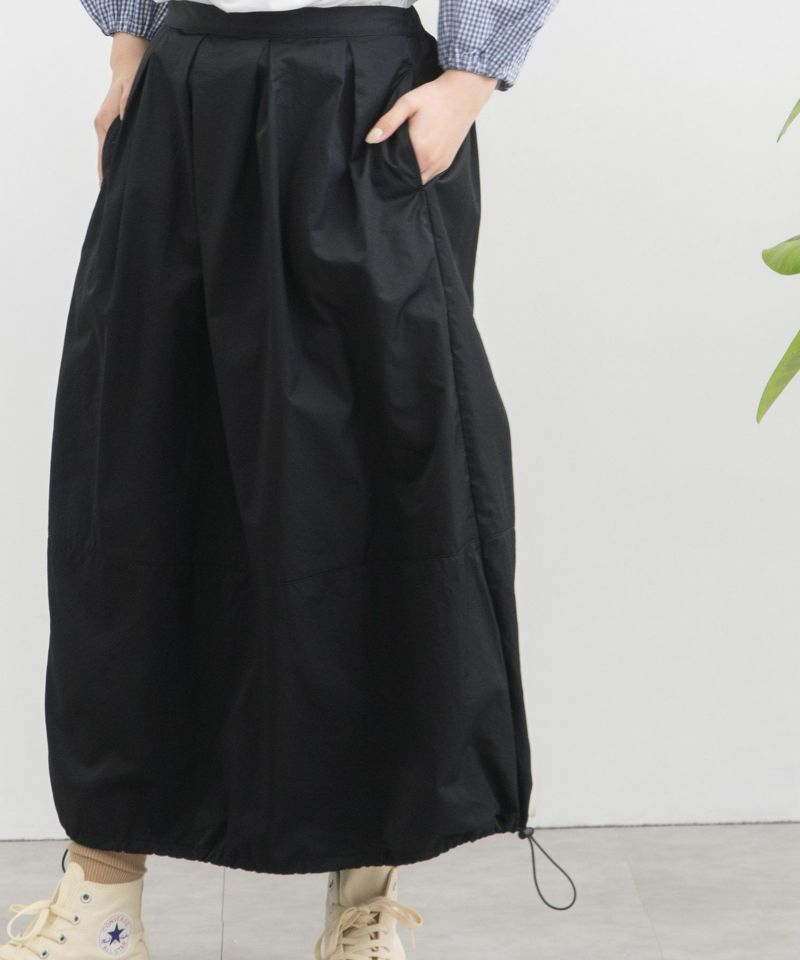 ・裾のドロストを解くとフレアスカートに変身。気分に合わせてシルエットを変えてお楽しみいただけます。裾のしぼりはストッパーで留められる仕様なので、簡単にシルエットを変えられるのもうれしいポイント。