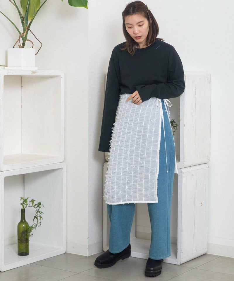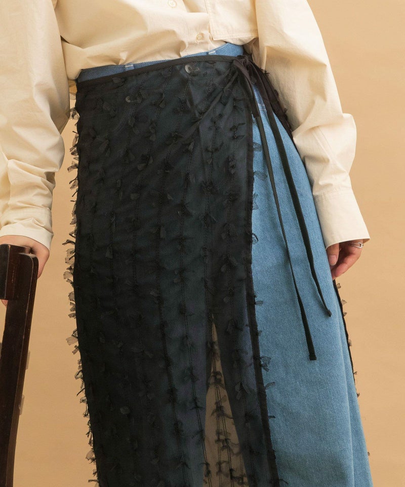 ・チュールリボンが縫いついた立体的なシフォン素材を使用したラップスカート。