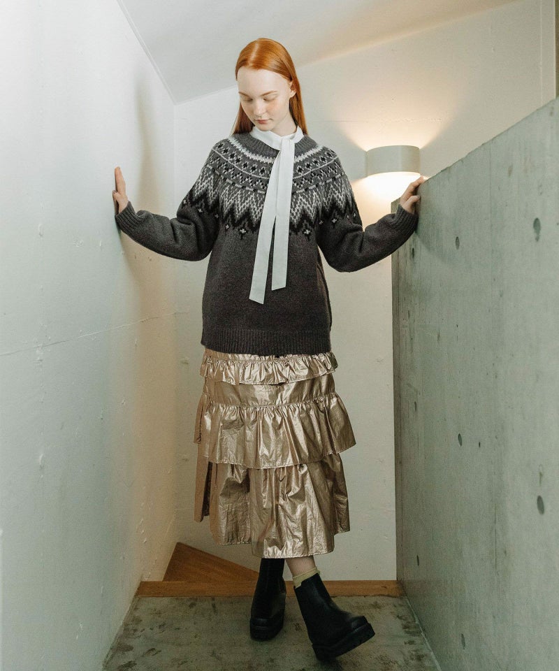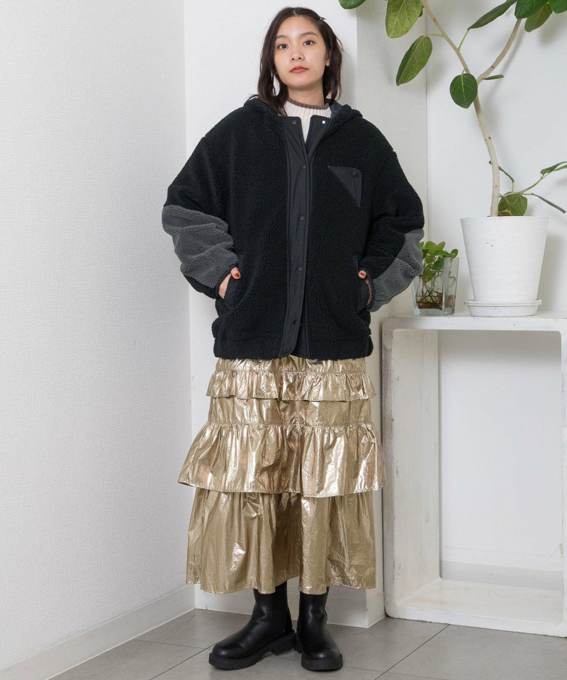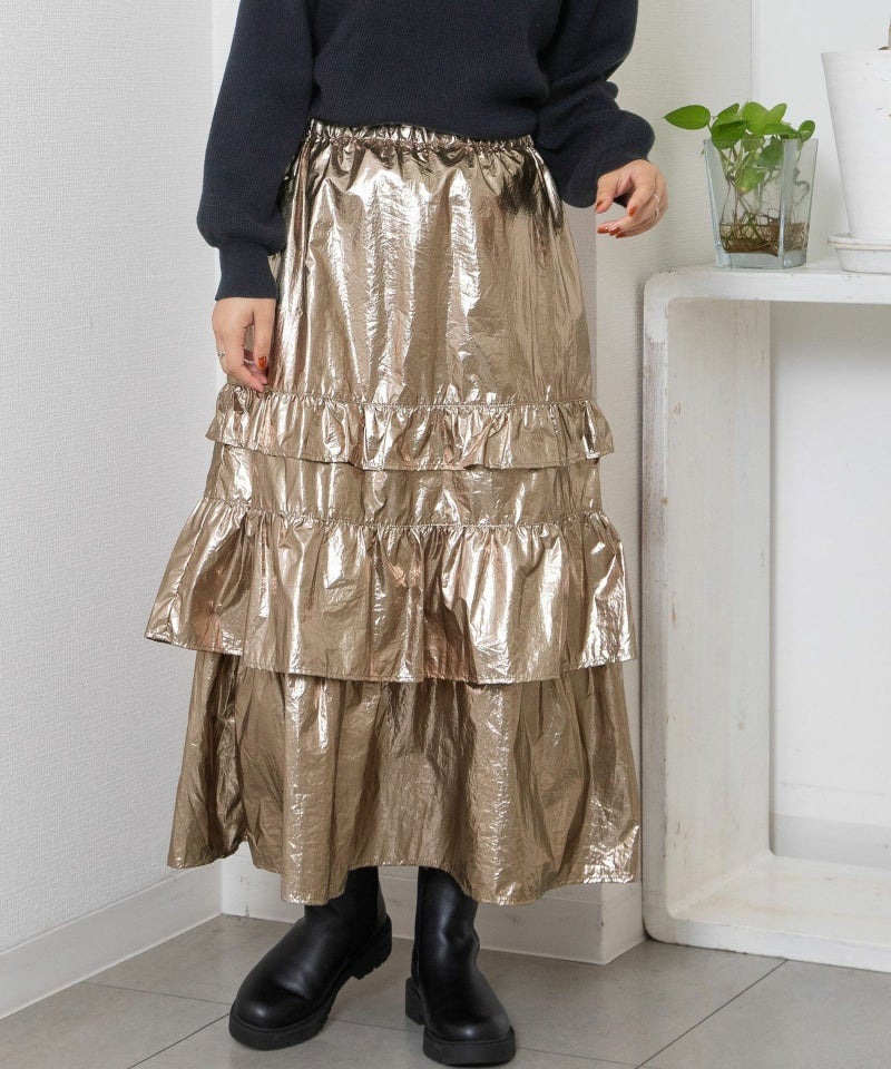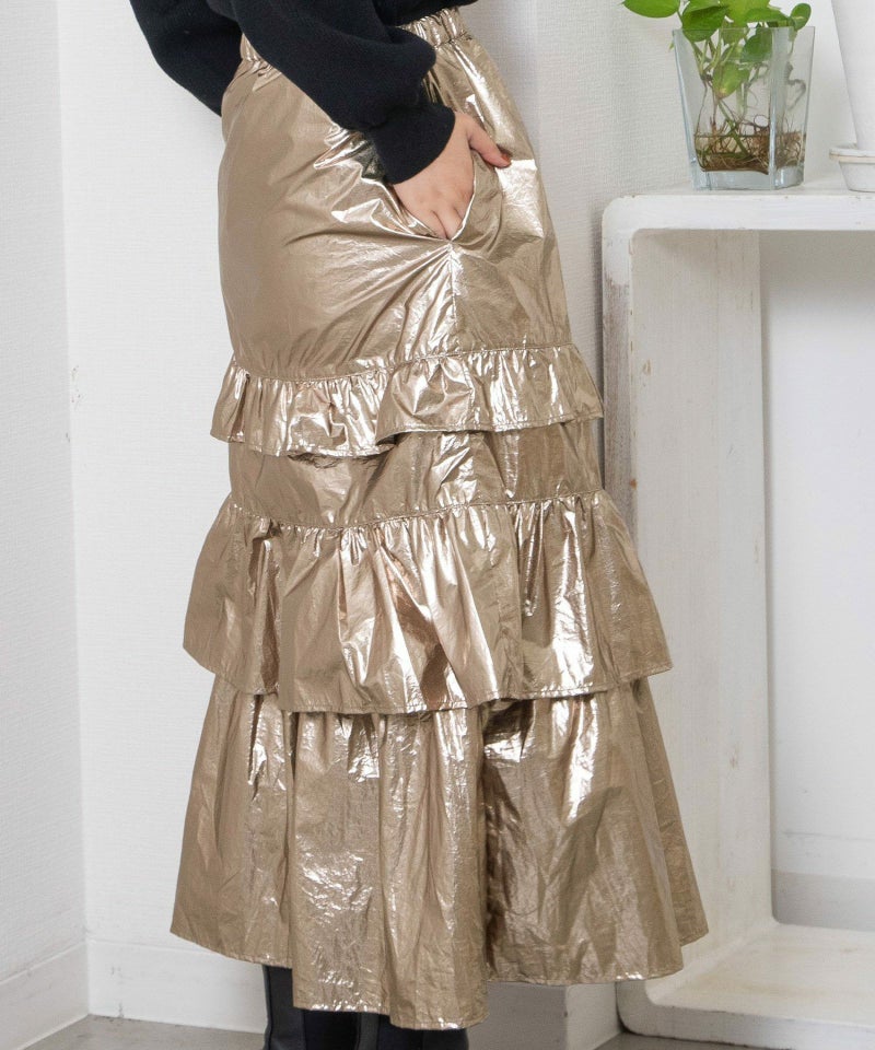 イレギュラーなフリルが大胆で遊び心のあるデザインスカート。使い勝手の良いブラックと、存在感抜群なメタリックカラーの2色展開です。ウエストはゴム仕様、紐でサイズ感の調節が可能です。両サイドにポケットつき。
