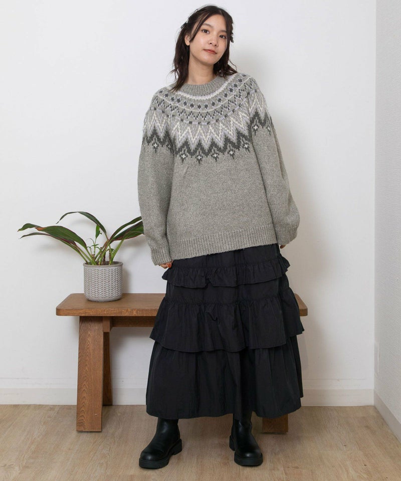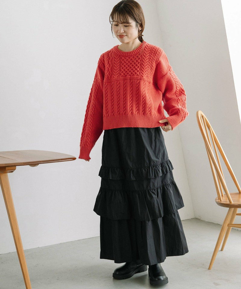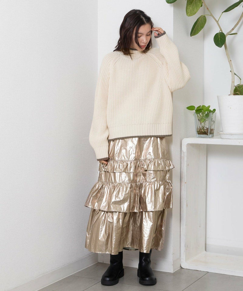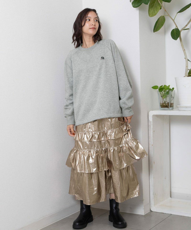 ティアードデザインが女性らしさを演出してくれるので、ロンTやスウェットなどカジュアルなアイテムとの相性◎。ニットを合わせてナイロンの素材感と対比を生かしたコーデもおすすめです。