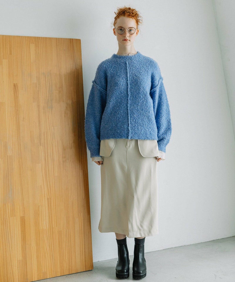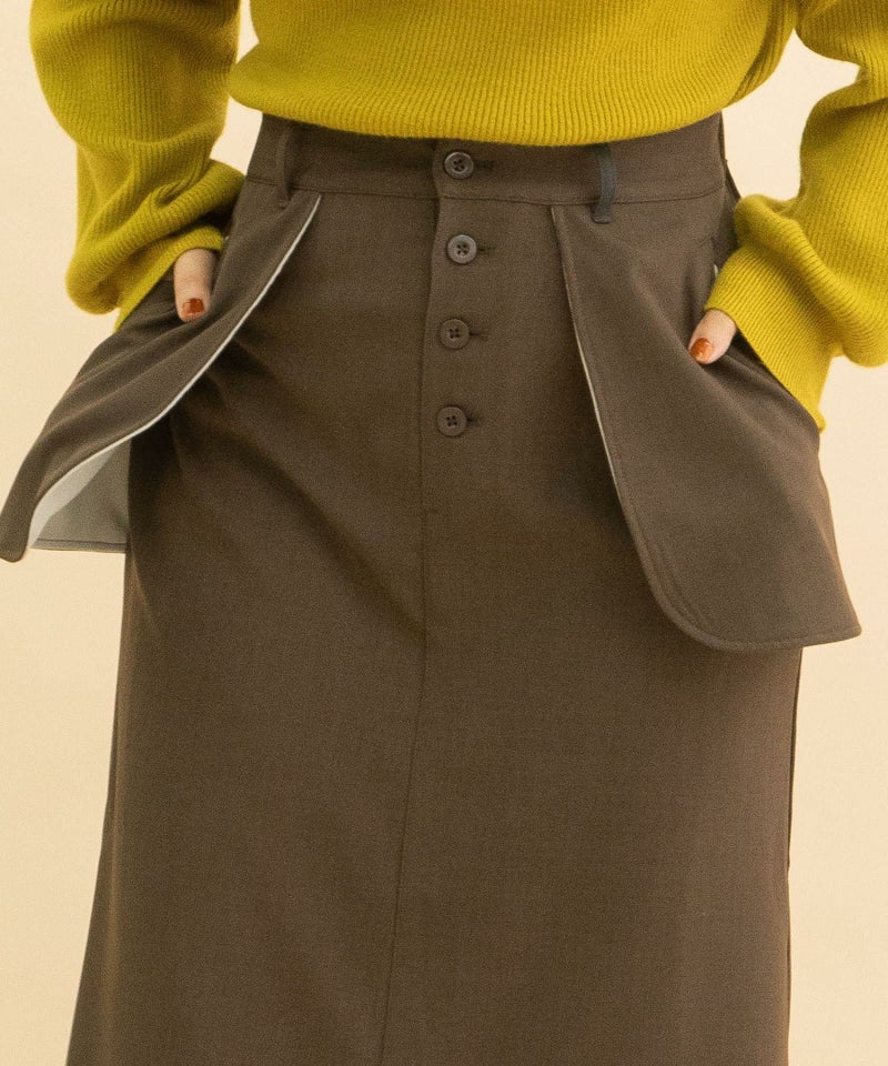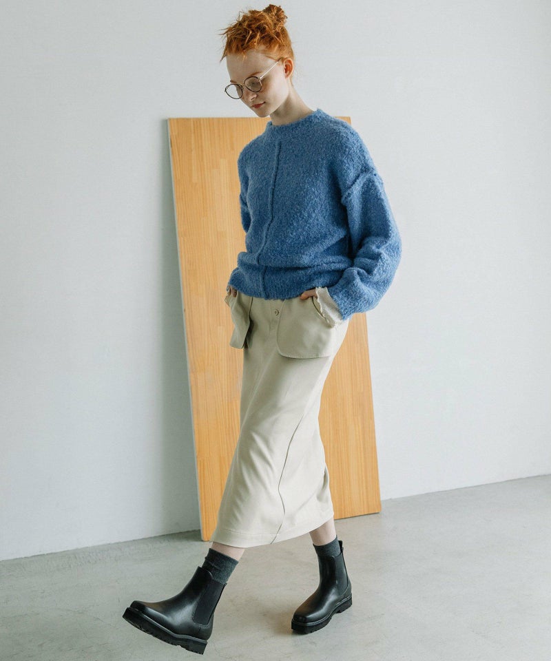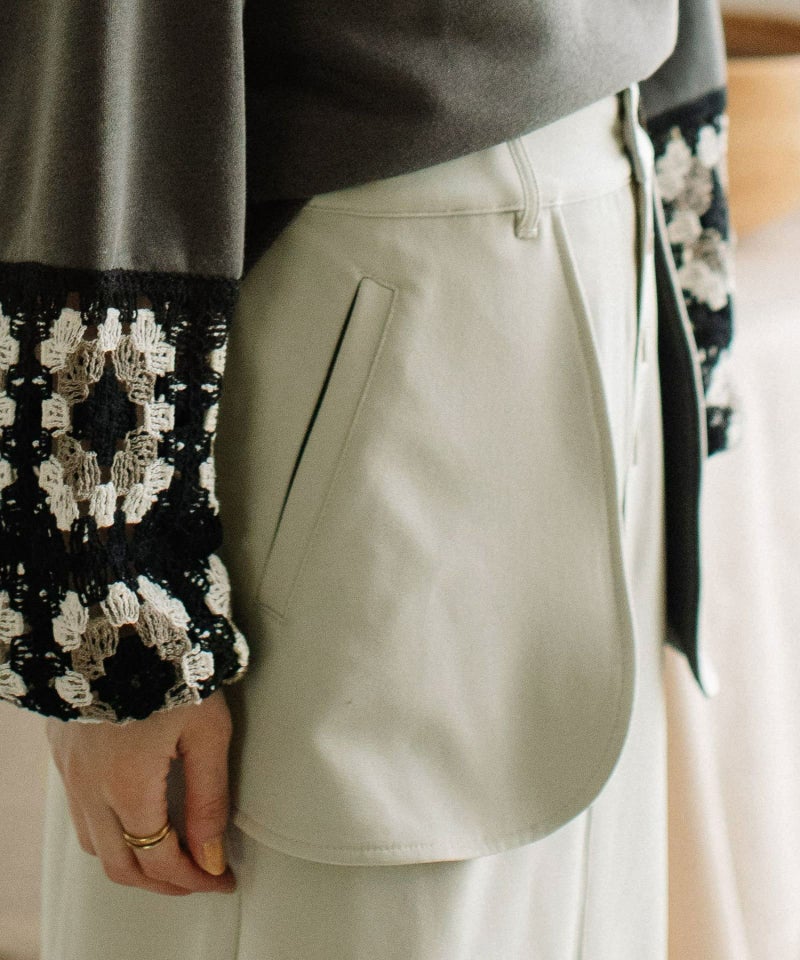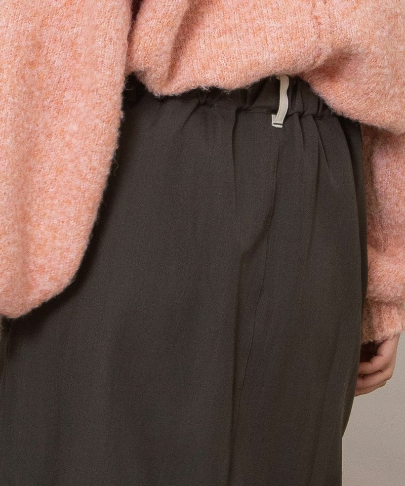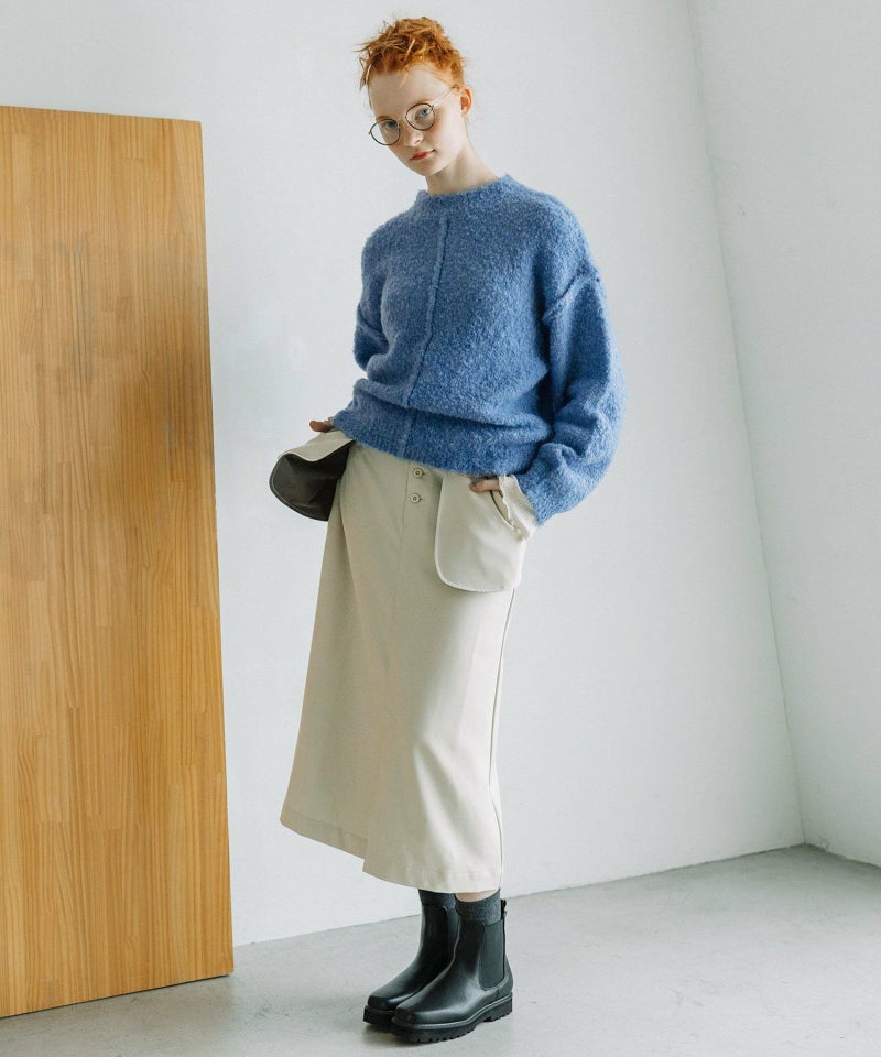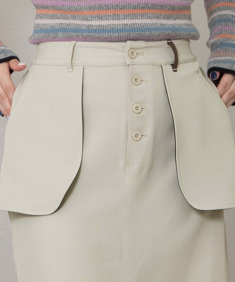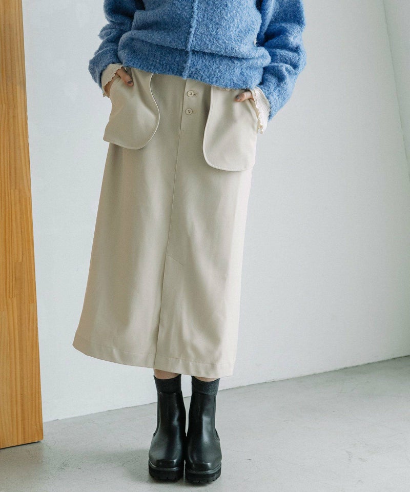 大きなアウトポケットが印象的なナロースカート。ポケットは身頃に縫い付けずに浮かせて立体感をだしています。ポケットの裏側やベルトループの一部を配色にして遊び心をプラス。ストレッチ混で伸縮性のある素材を使用し、少しキレイめで大人な雰囲気に仕上げています。後ろウエストはゴム仕様で楽な履き心地です。