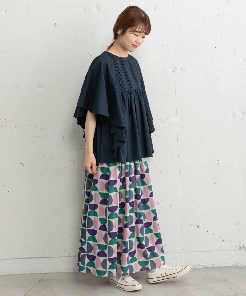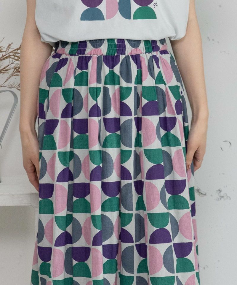 風合いの良いコットン素材に、カラフルな幾何モチーフを並べてプリントをしたオリジナルのテキスタイルスカート。少しレトロな雰囲気でカジュアルスタイルに取り入れやすい柄です。インド綿ならではの軽やかさとナチュラルな風合いが魅力的。ふんわりとしたタックギャザーのスカート。ウエストはゴム仕様です。両サイドポケット付き。