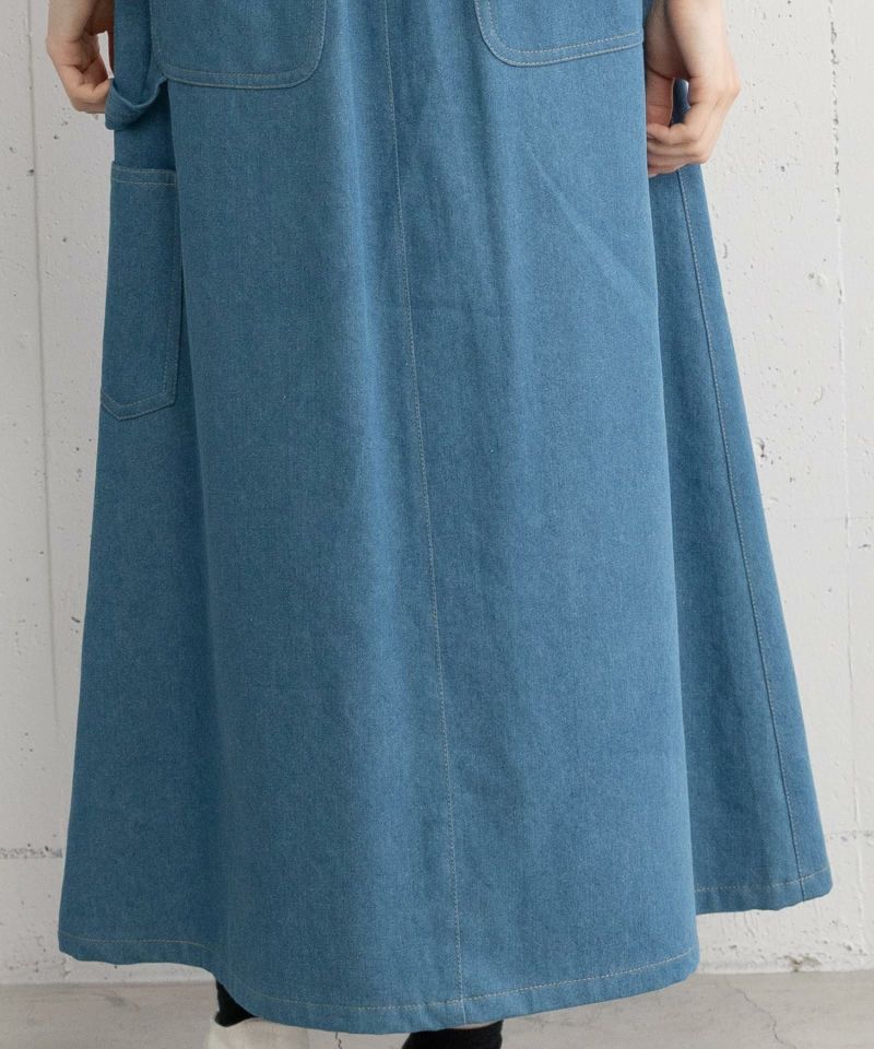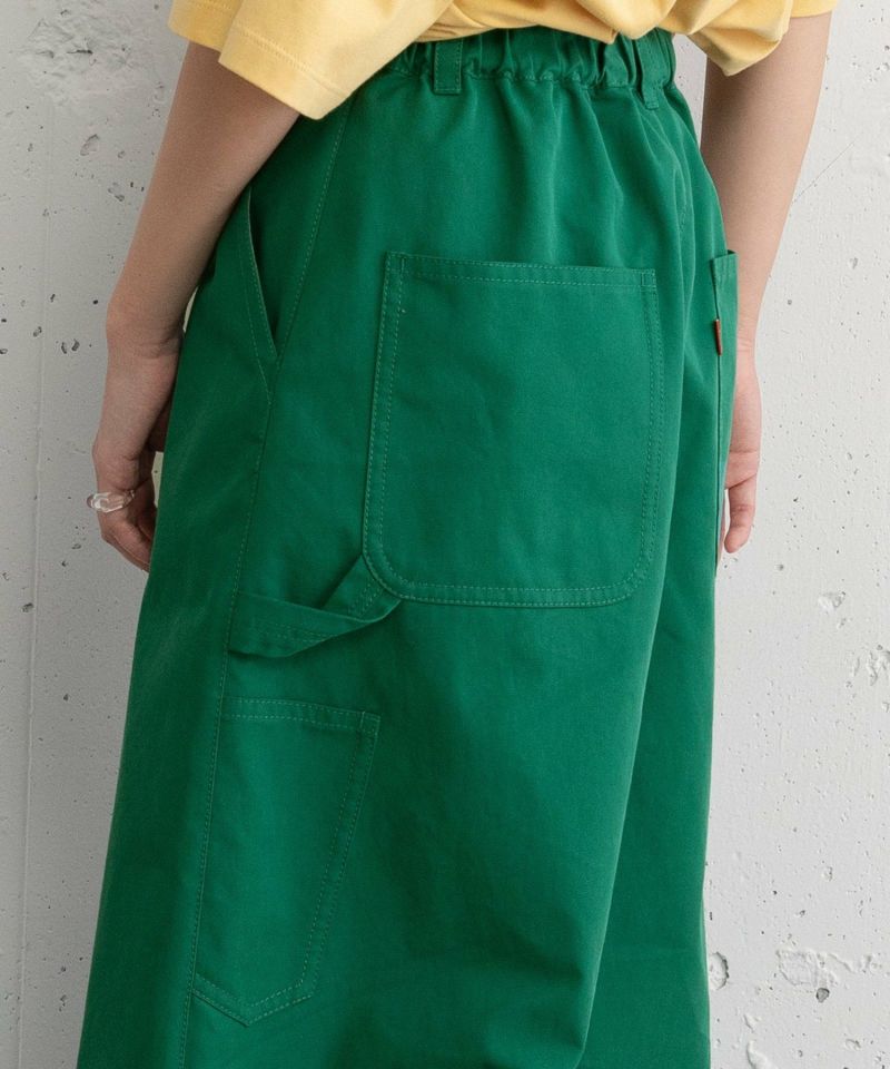 ミリタリー感を残しつつ、セミフレアラインで取り入れやすいシルエットのスカート。スケールポケットやハンマーループなどペインターパンツの本格的なディテールをのせました。ベージュとグリーンは程よい張り感があり、しわになりにくいコットンポリエステル生地を使用。POUDOUDOUロゴ入りのオリジナルのネオバボタンを使用しています。後ろウエストはゴムの仕様で伸縮性あり。