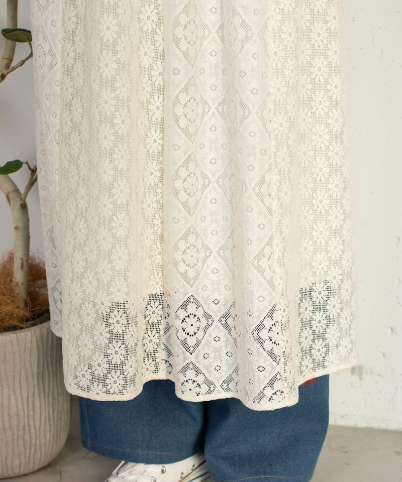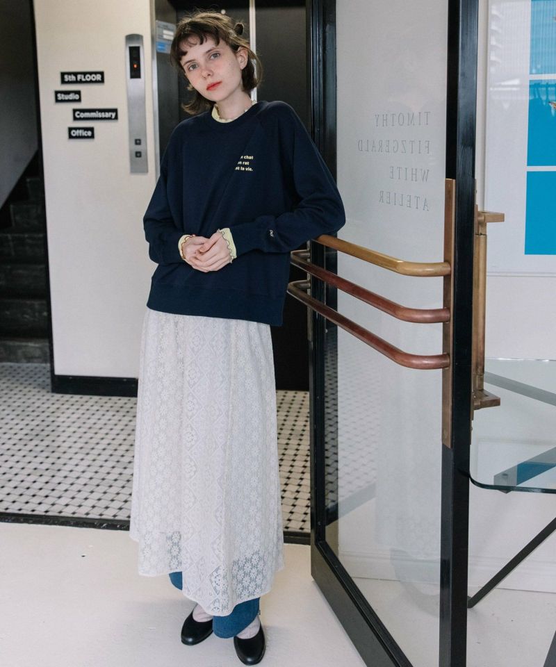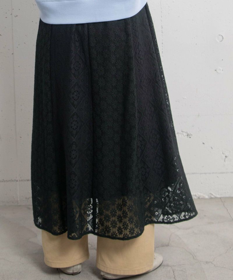 フラワー柄の繊細なラッセルレースのパッチワークデザインスカート。程よく広がるフレアシルエットで古着をリメイクしたような、アンティークな雰囲気に仕上げました。スウェットと合わせるラフなスタイリングや、インにデニムを履くのもおすすめです。ウエストゴム仕様でラクな履き心地。裏地付き。