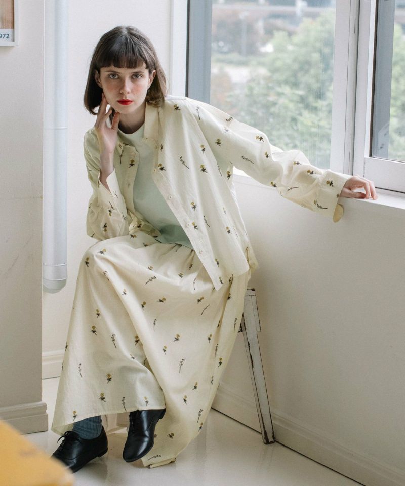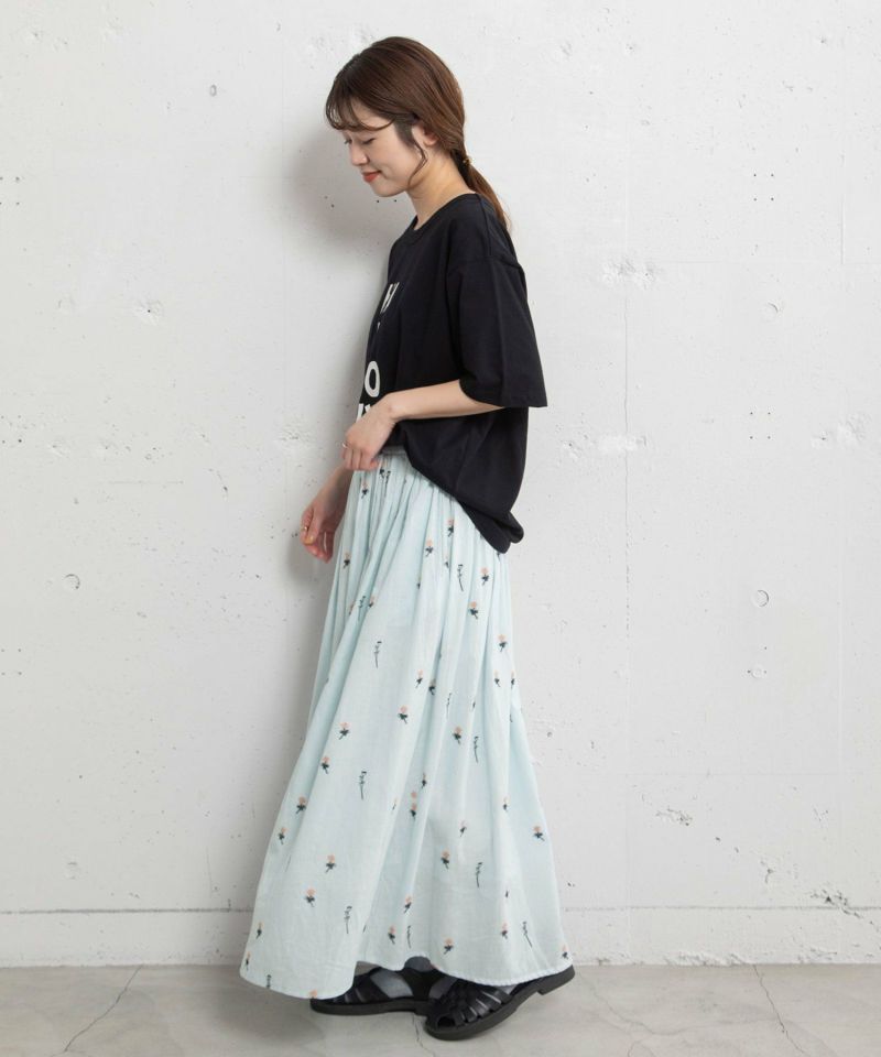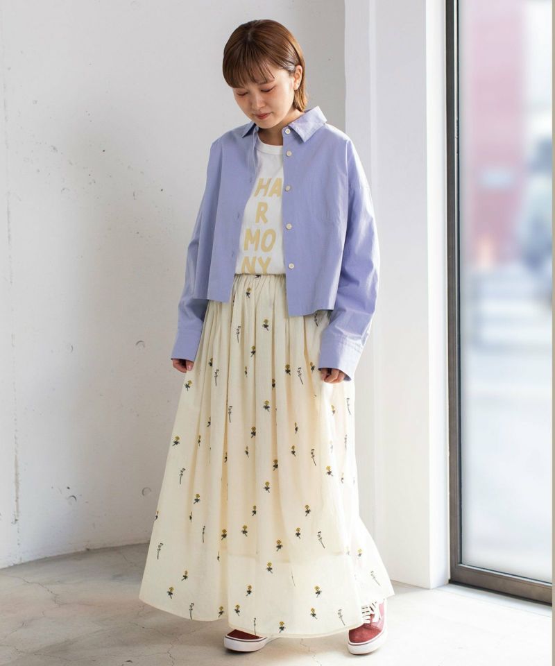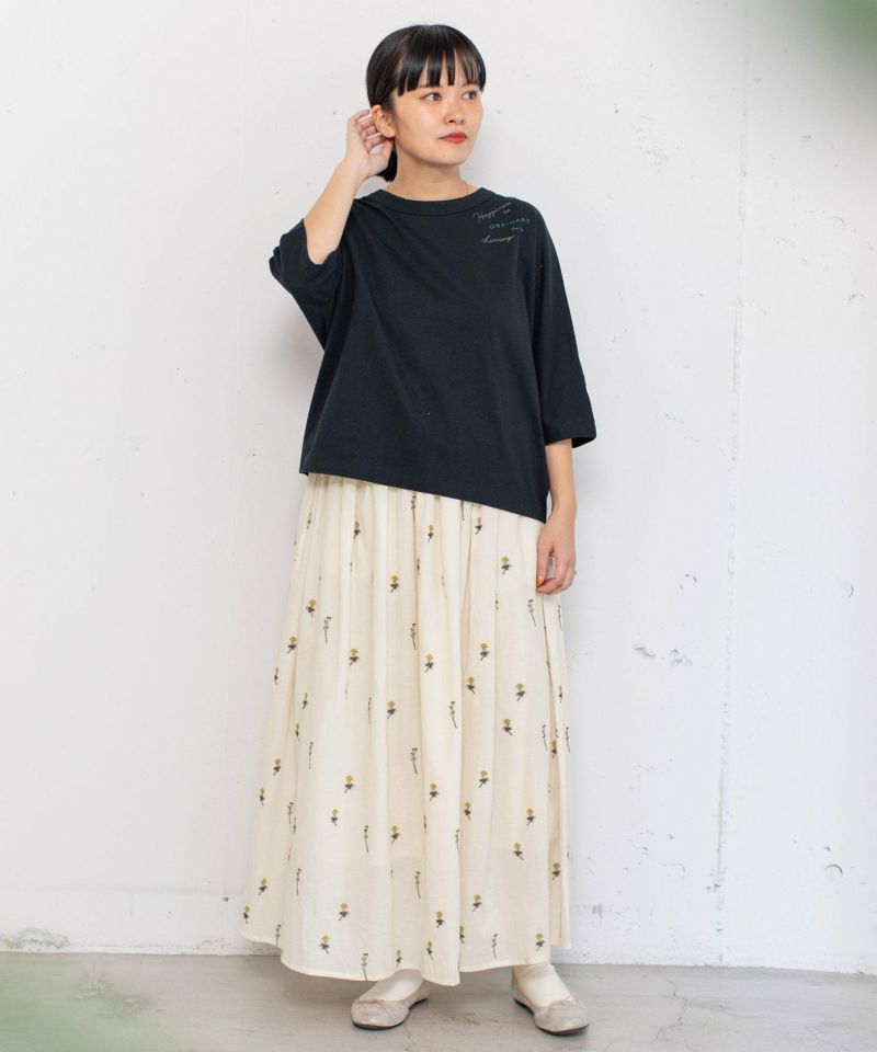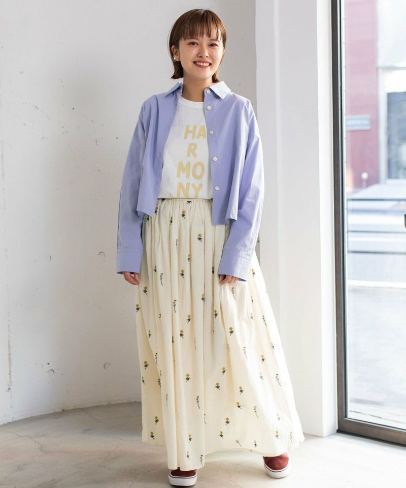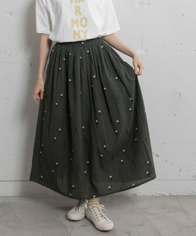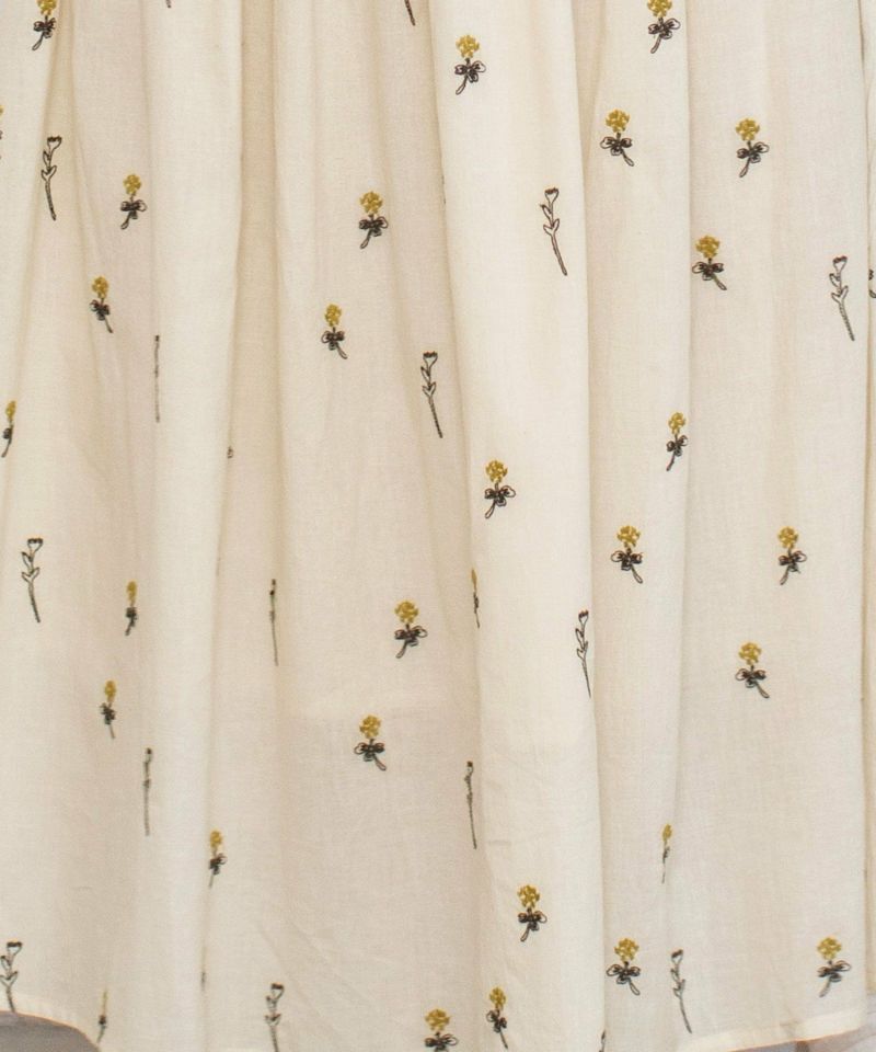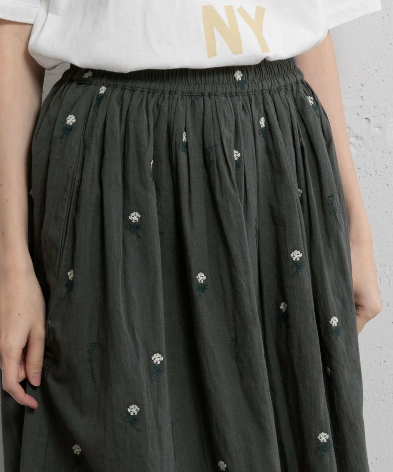 インド綿をベースにシロツメクサ(White clover)の刺繍を施した生地を使用したスカート。たっぷりとしたボリューム感が春めくデザイン。刺繍を身にまとう特別感のあるアイテムです。ウエストはぐるりゴムで履きやすく。ボイル素材の裏地付き。両サイドにポケット付き。