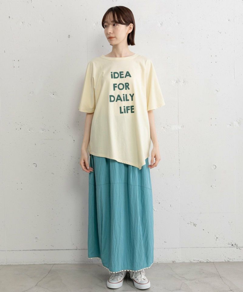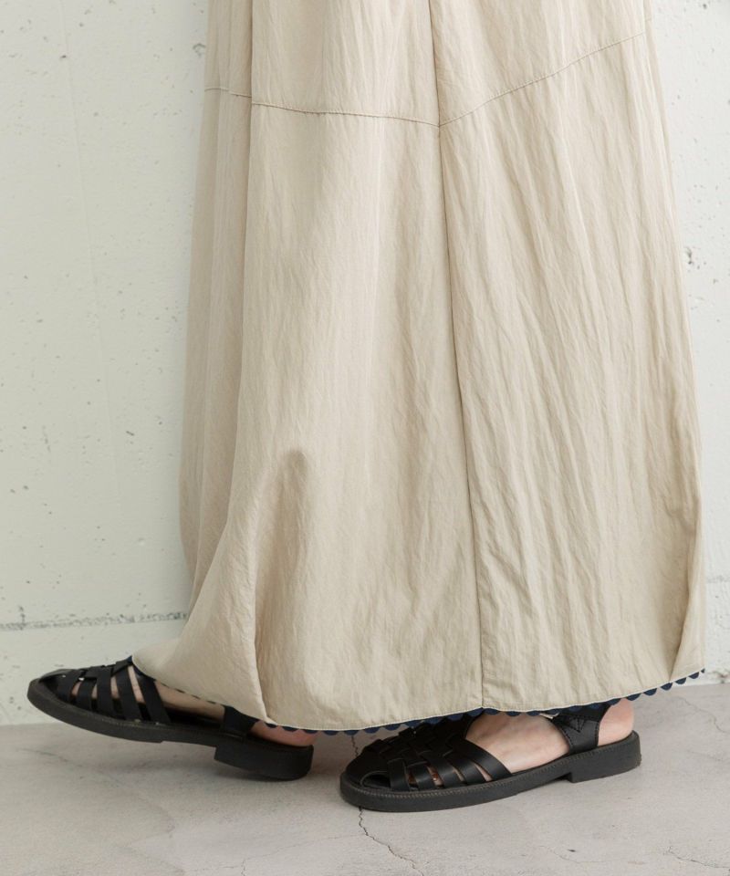 ウエスト部分のタックとギャザーで脚を包み込むようなボリューム感を出したスカート。丸みのあるコクーンシルエットがポイントです。ポリエステル素材で軽く、ワッシャー加工のシワ感が入ることでシャリ感のあるドライな風合いです。裾に山道テープを縫い付け、ちらりと見えるように。ウエストはぐるりゴムの仕様、紐でサイズ感の調節ができます。
