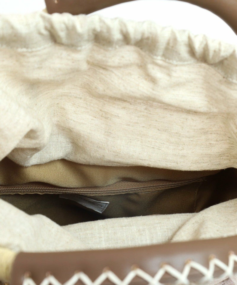 スクエア型にしっかり編まれたカゴバッグの口元は巾着仕様になっているので中が見えてしまう心配なし!