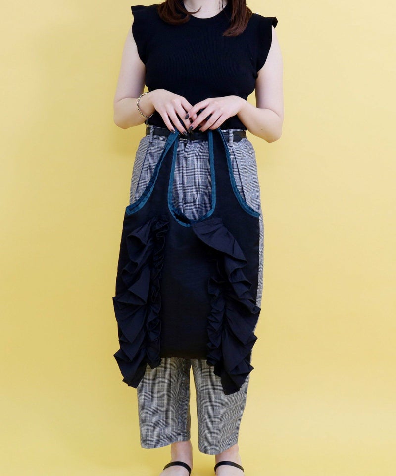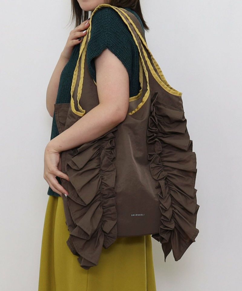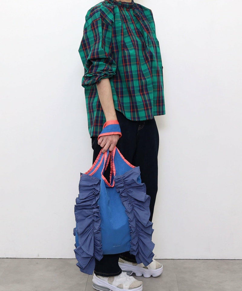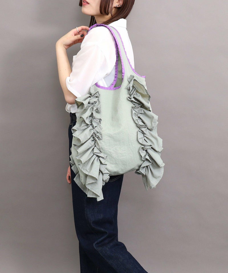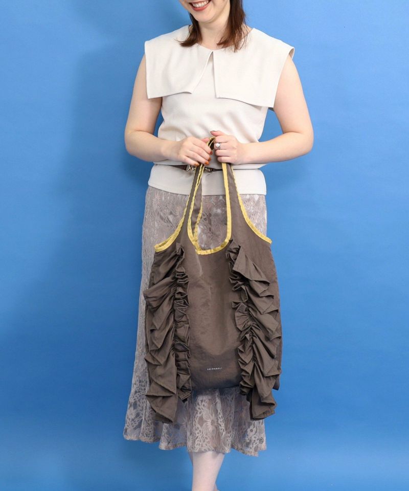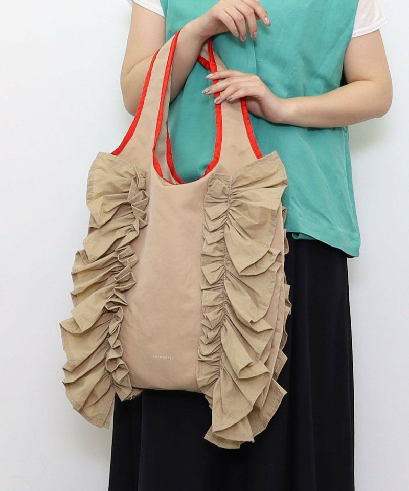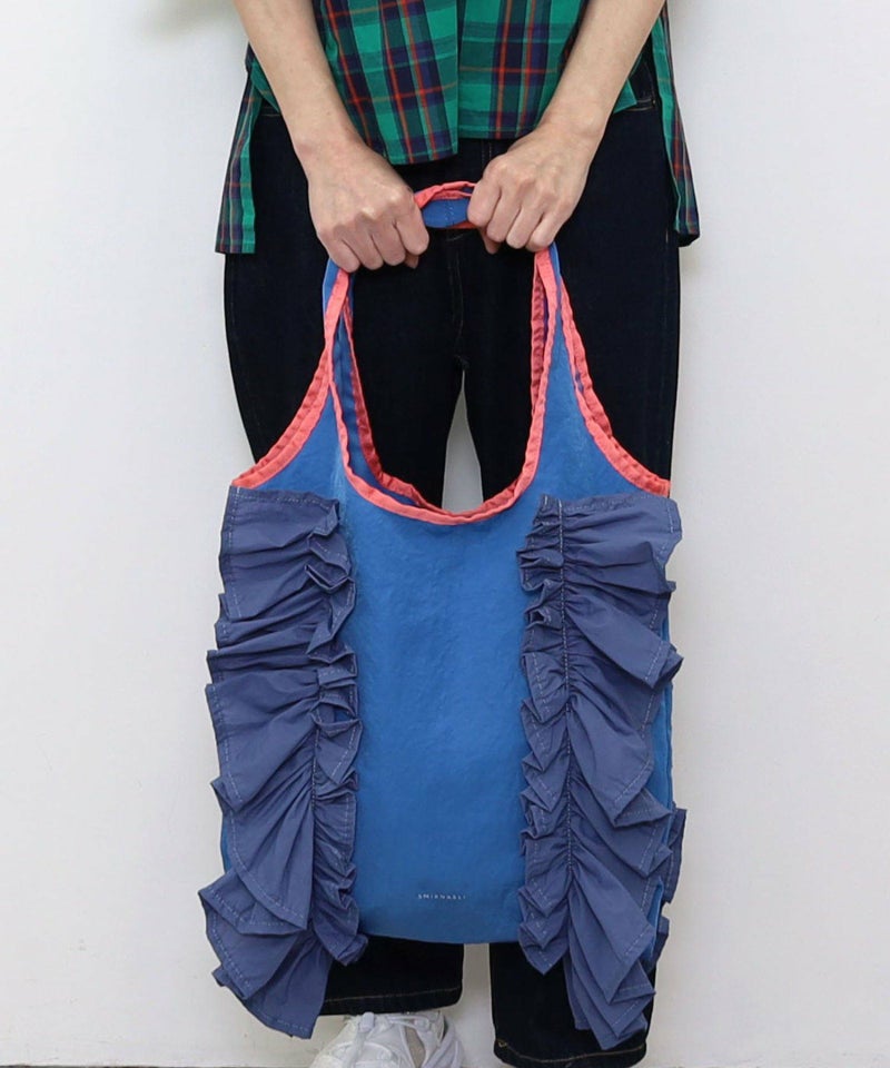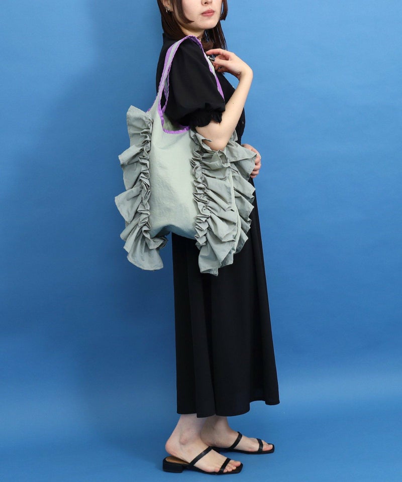 口元テープ色との配色、ランダムなボリュームフリルがポイントのバッグ。