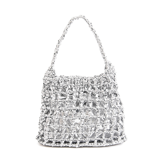 サテンリボンで編み立てた透かし編みのボディが軽やかなミニショルダーバッグ。程良い光沢のある表面感と、動きに合わせて揺れるしなやかなフリンジが視線を奪う。視界に入るたび高揚感を与えてくれるアクセサリーのような存在で、エッジィながらも肌馴染みが良いカラーリングは幅広いスタイリングにフィットする。