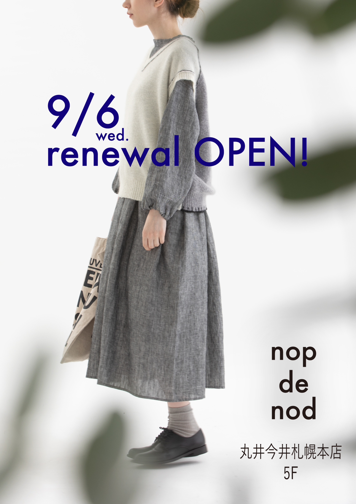 丸井今井札幌本店 リニューアルのお知らせ 2023.08.23 nop de nod 丸井今井札幌本店は この度 フロアを5階へ移り、リニューアルすることとなりました。 9月6日リニューアルOPEN!! リニューアル作業に伴いまして、一旦現店舗は 9月4日(土)をもちまして閉店させていただきます。 9月5日(火)の期間中は休業とさせていただきます。 NEW OPENをお楽しみにしてください。 何卒よろしくお願い致します。